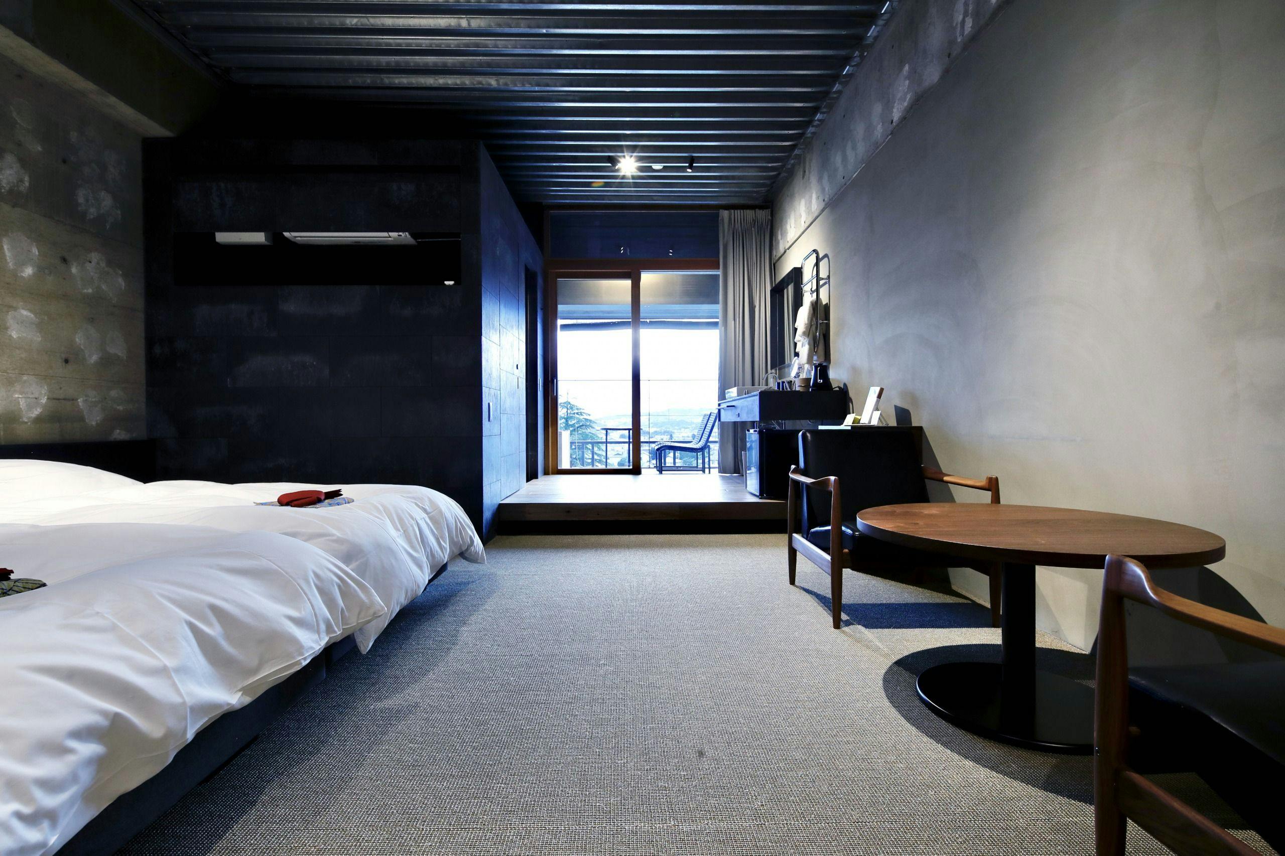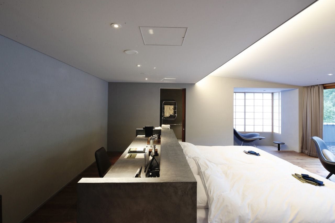広いワーキングテーブルと小さなリビングスペースを備えた客室です。内装は珪藻土と無垢材、畳の床にはビーズクッションと一人がけのイージーチェア。ハンス・J・ウェグナーの作品で、座り心地は抜群です。