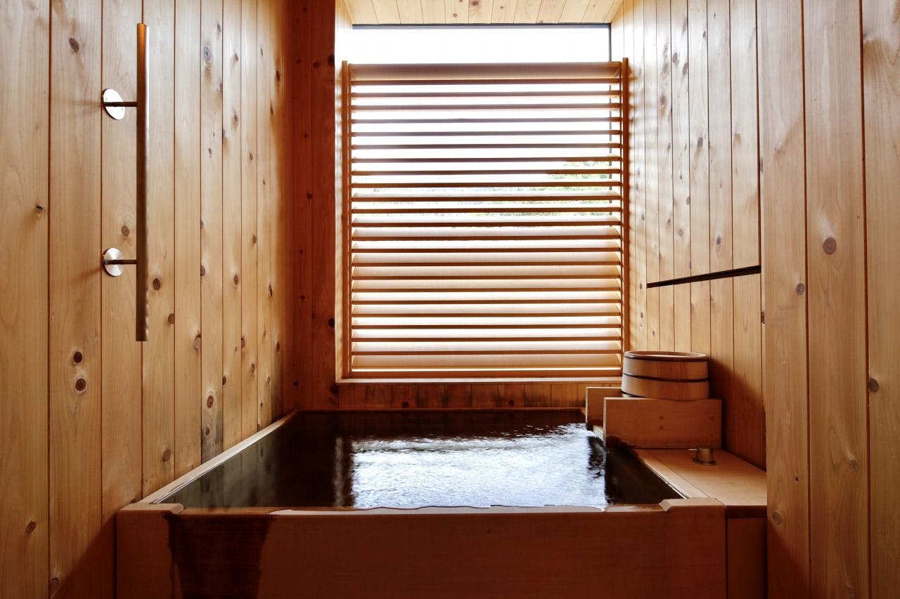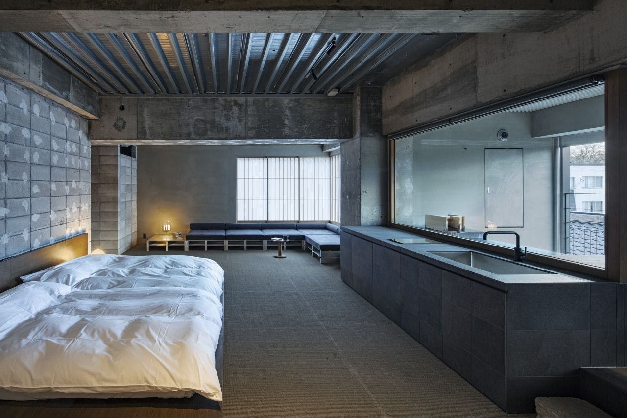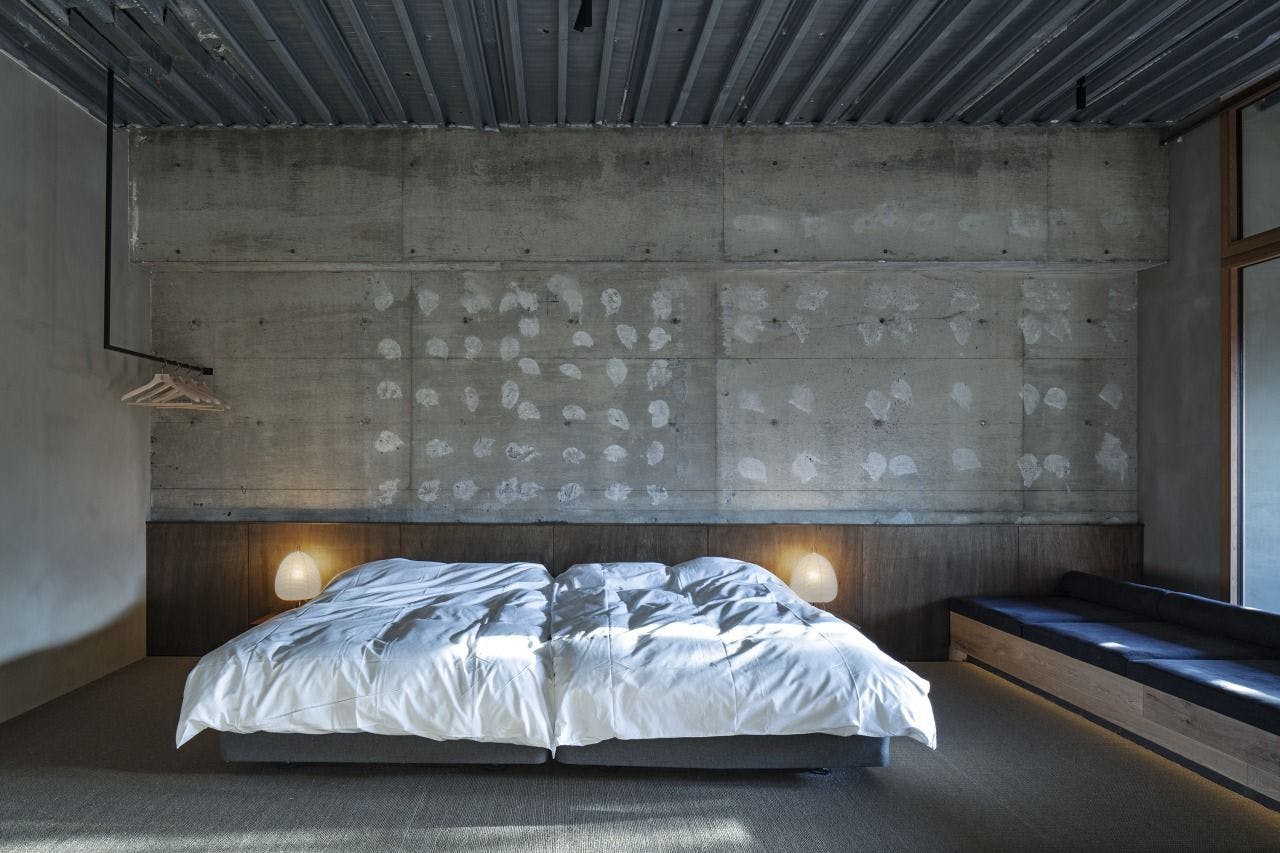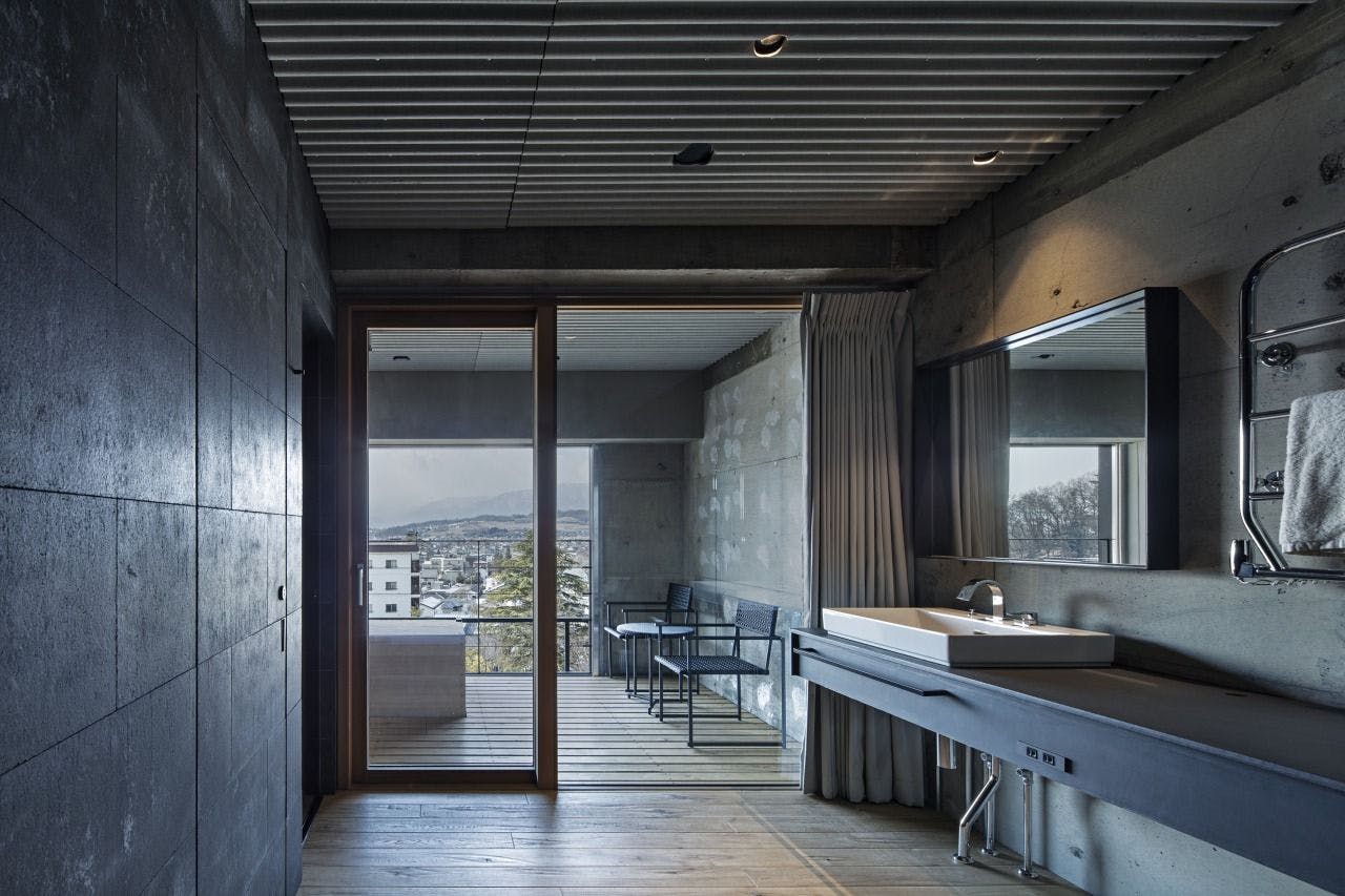 設計は「SUPPOSE DESIGN OFFICE」。新旧の「記憶」がレイヤリングされたストイックな空間です。お客様のなかには「工事中?」とおっしゃる方もいますが、実は壁面の研磨などに手間をかけた「仕上げ」。あえて内装材を貼らず、塗装しない、素材の表情をお楽しみください。テラスには檜の露天風呂があります。