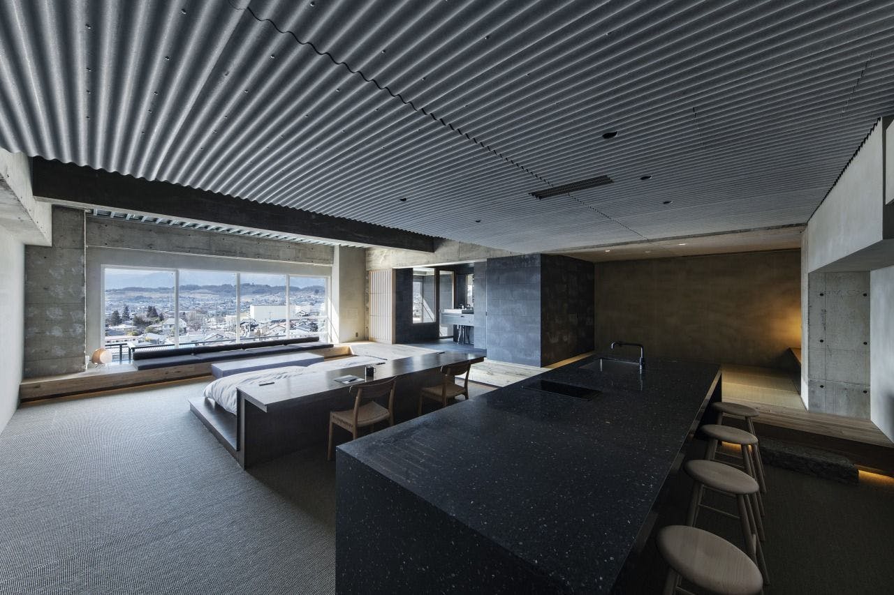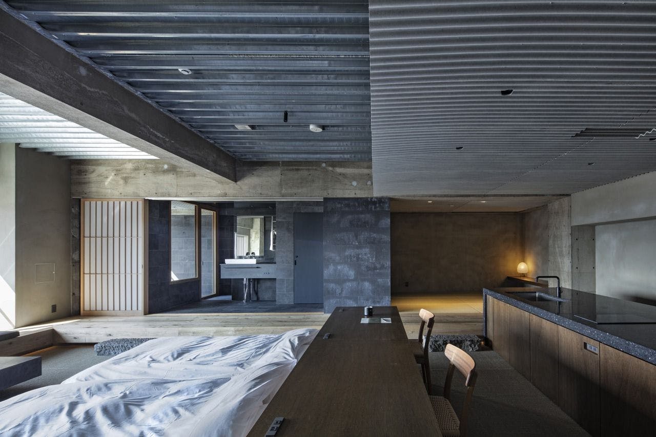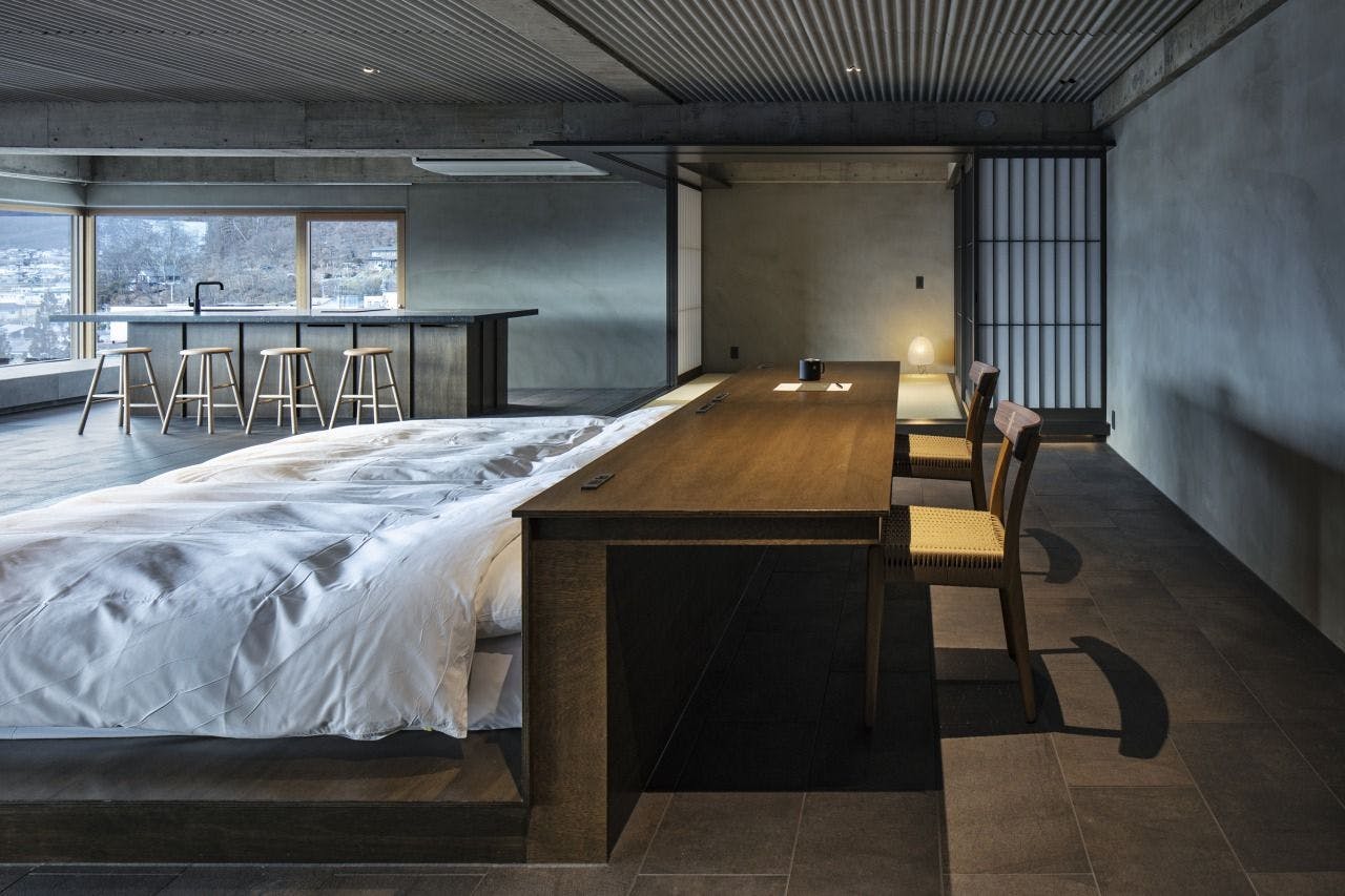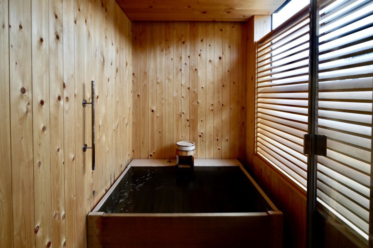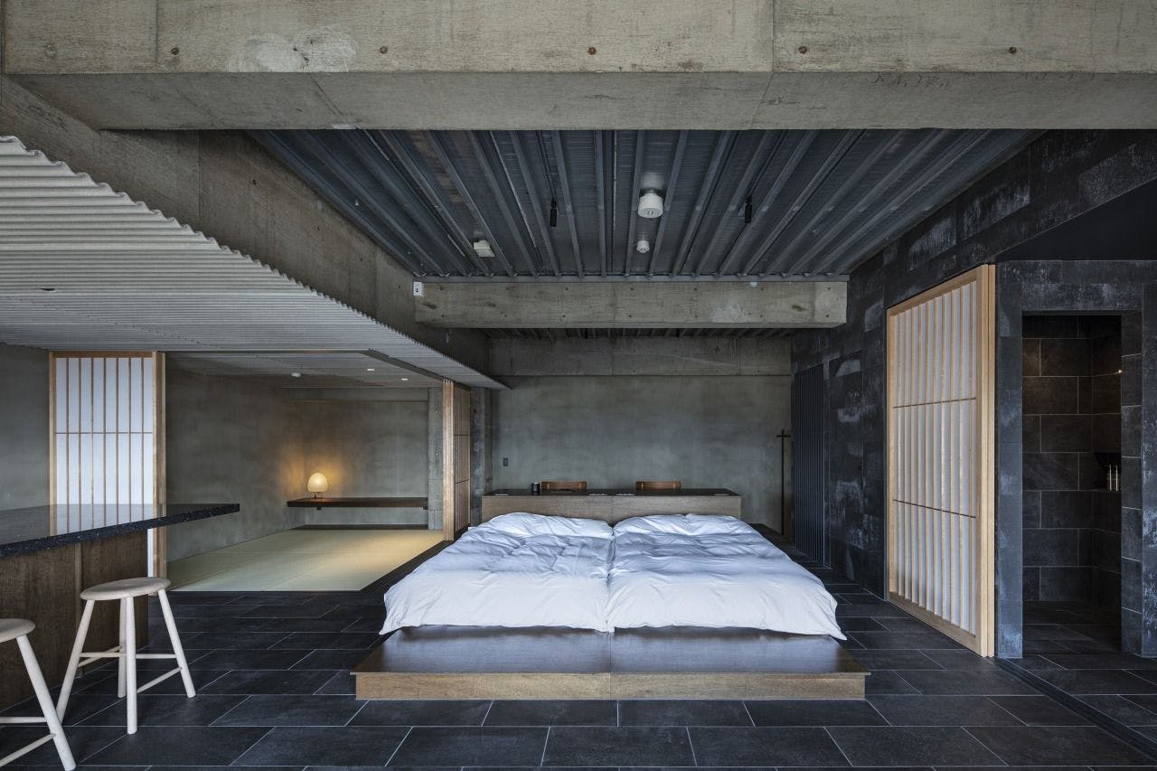 設計は「SUPPOSE DESIGN OFFICE」。新旧の「記憶」がレイヤリングされたストイックな空間です。お客様のなかには「工事中?」とおっしゃる方もいますが、実は壁面の研磨などに手間をかけた「仕上げ」。あえて内装材を貼らず、塗装しない、素材の表情をお楽しみください。テラスには檜の露天風呂があります。