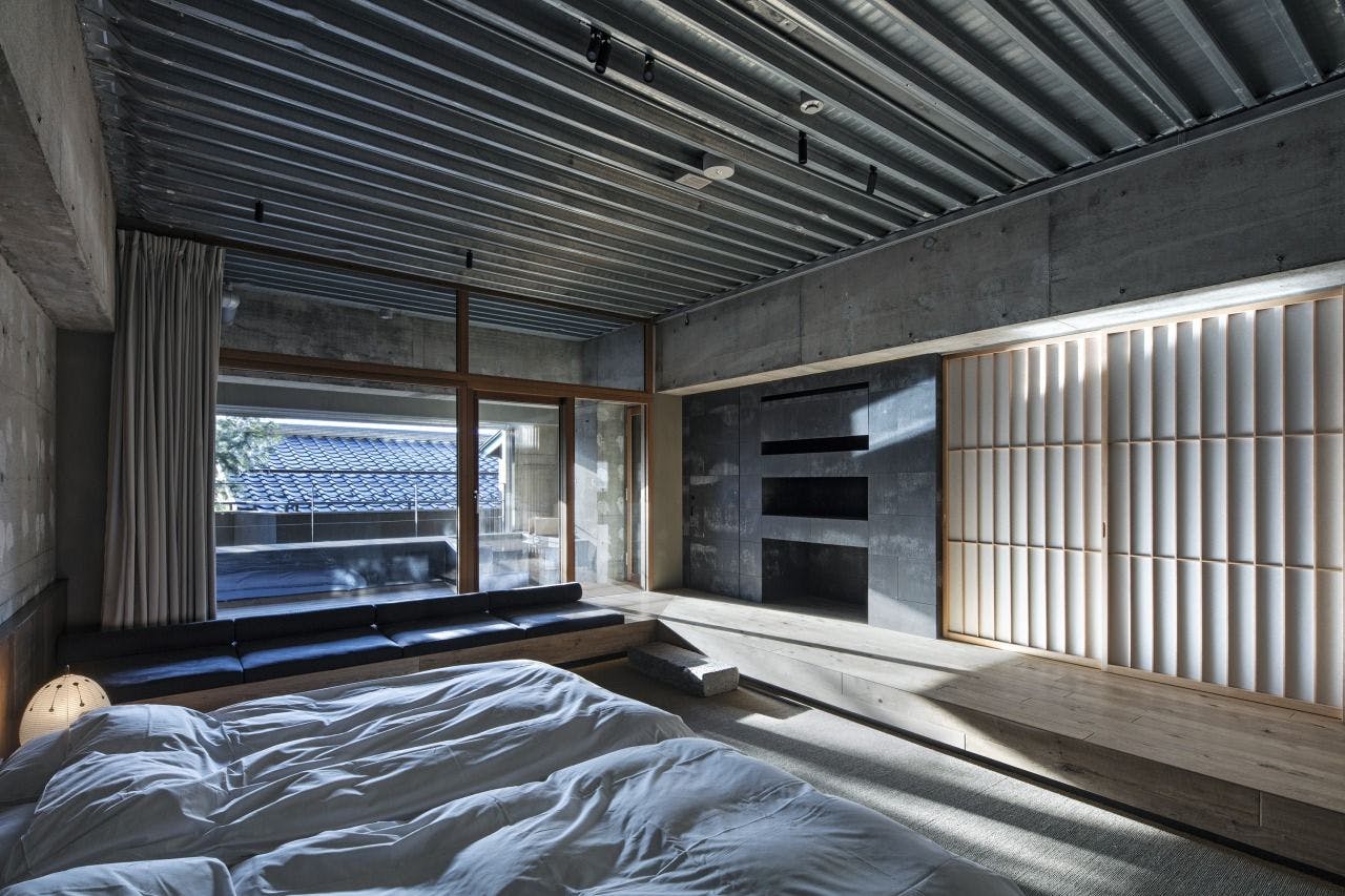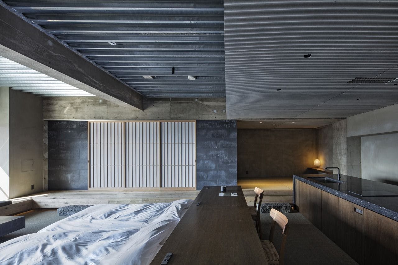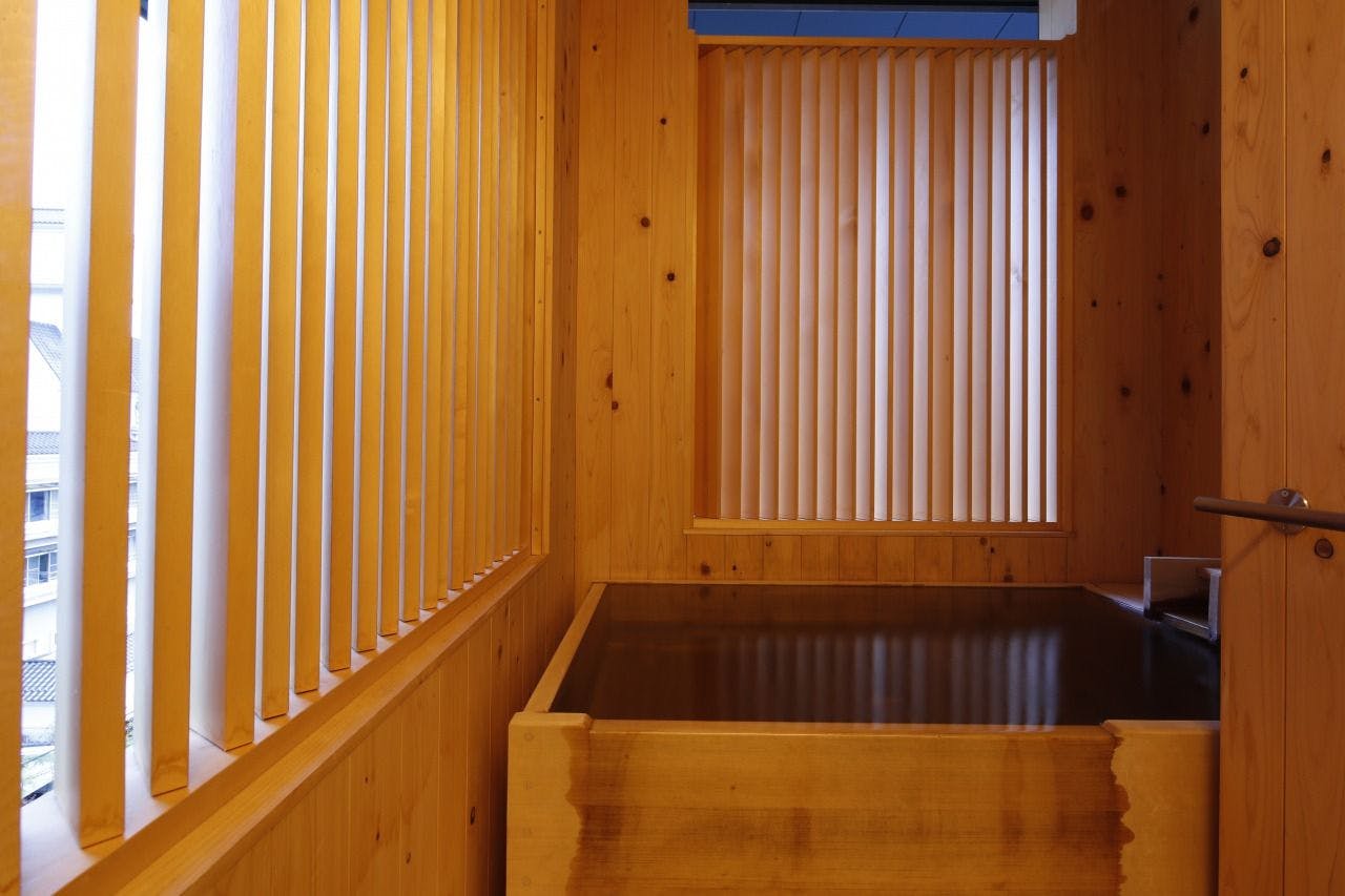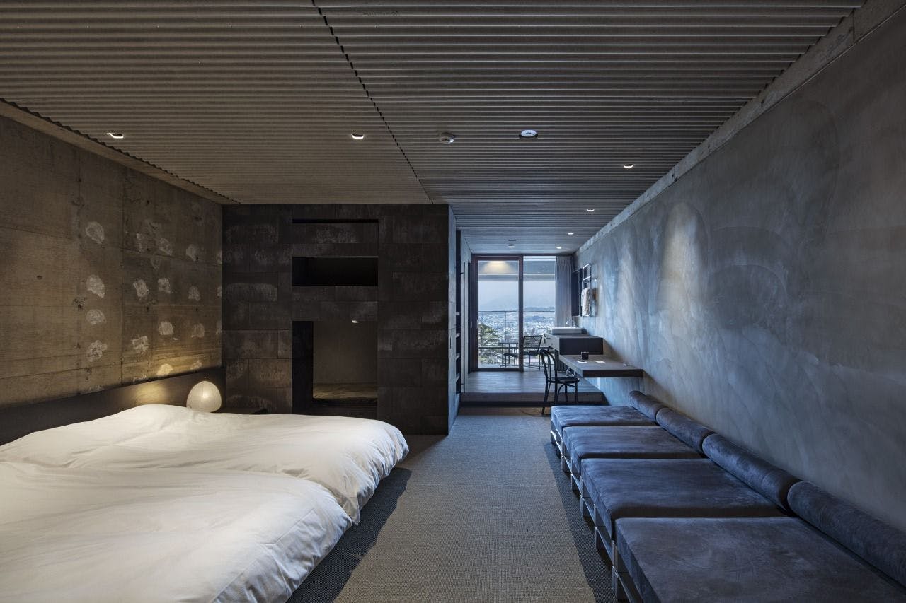 設計は「SUPPOSE DESIGN OFFICE」。新旧の「記憶」がレイヤリングされたストイックな空間です。お客様のなかには「工事中?」とおっしゃる方もいますが、実は壁面の研磨などに手間をかけた「仕上げ」。あえて内装材を貼らず、塗装しない、素材の表情をお楽しみください。テラスには檜の露天風呂があります。