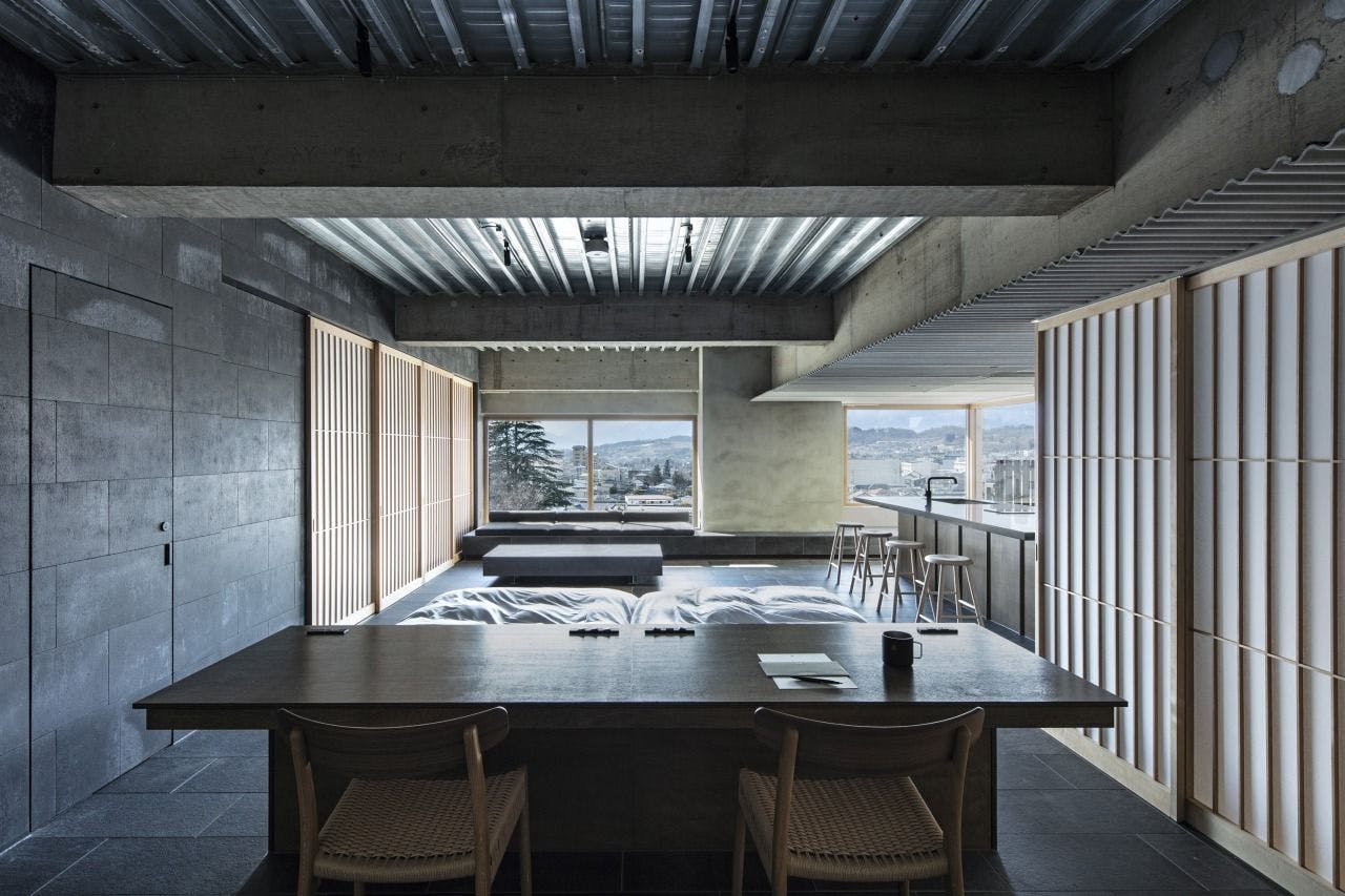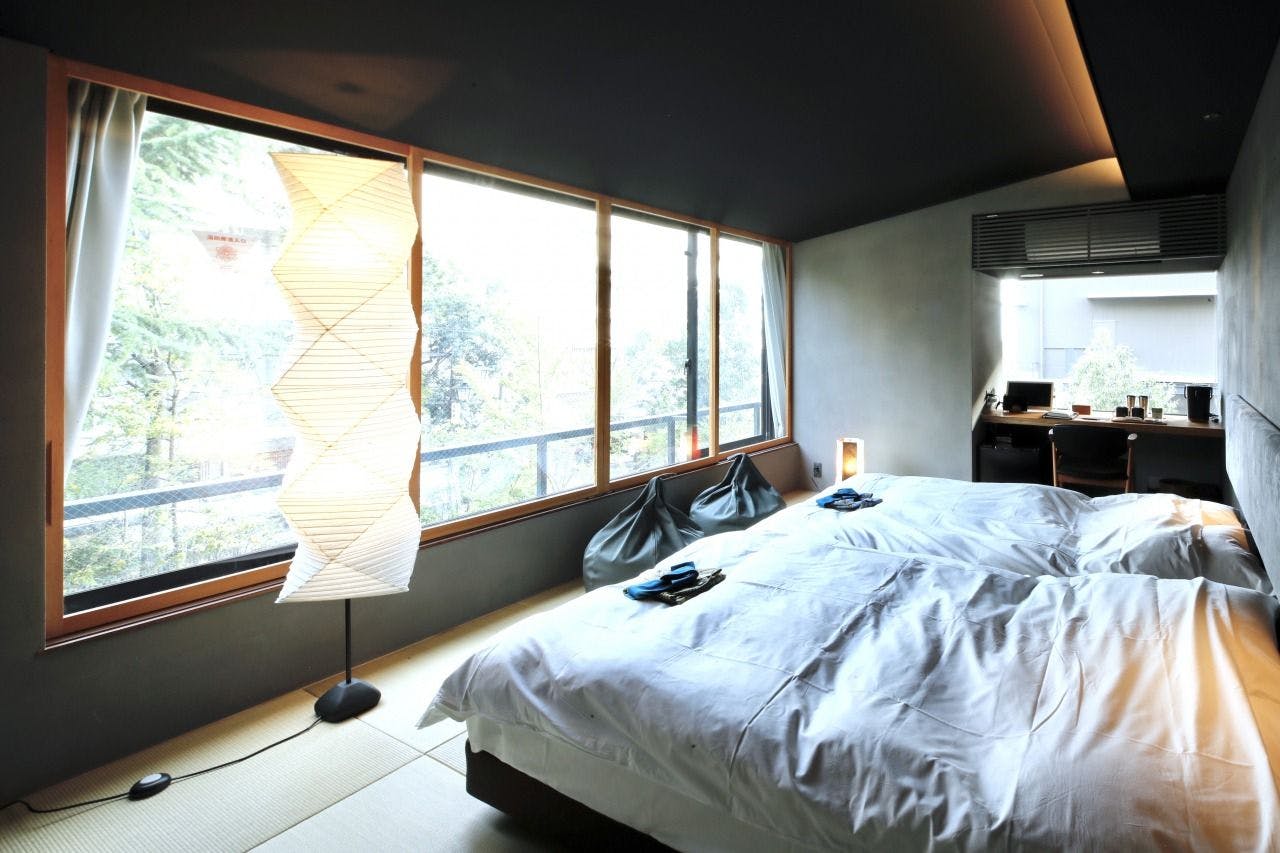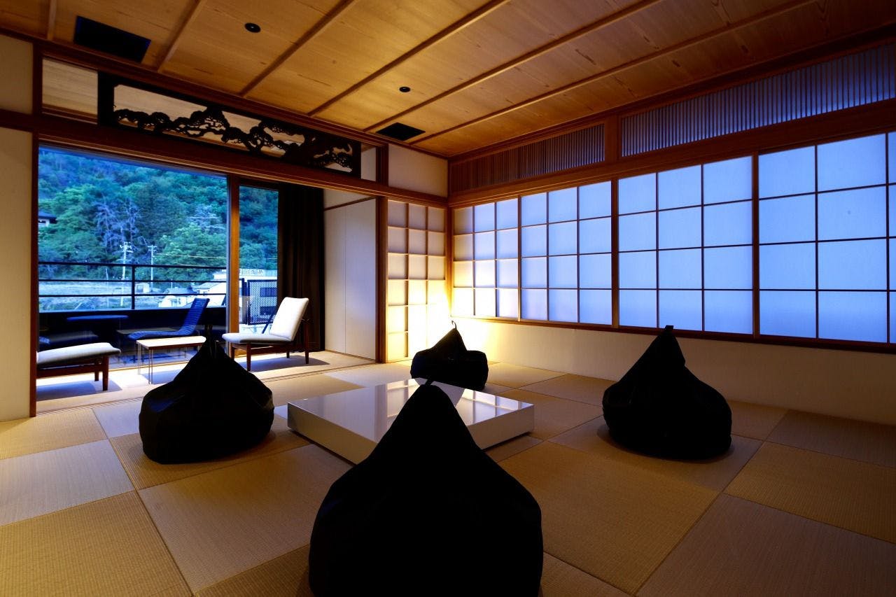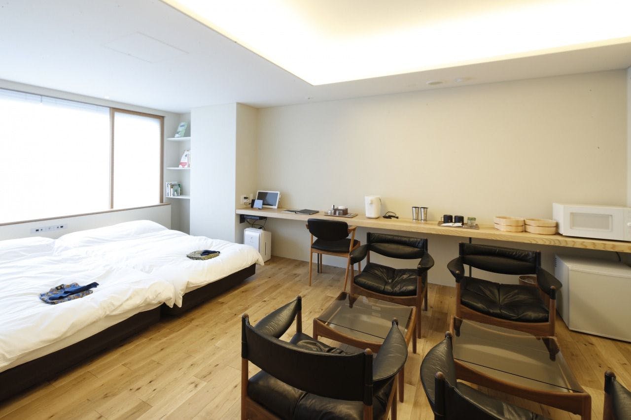 ミニキッチンが付いているのもこの客室の特徴で、カウンターチェアに腰掛けて話に没頭したり。デザインの特徴になっている和室に2枚の布団を敷けば、最大4名様でご利用可能です。