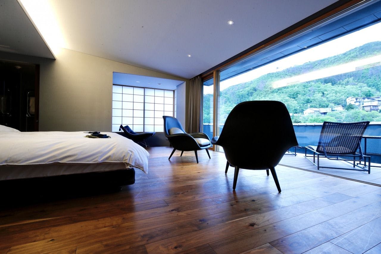 皇族の方々が宿泊された歴史を持つ「小柳」。以前も7階は特別室でしたが、その歴史を引き継ぎ、新しいスイートルームにリノベーションしました。ブラックウォールナットを多用したベッドルームのほかに和室があり、窓の外にはウッドデッキも付いています。