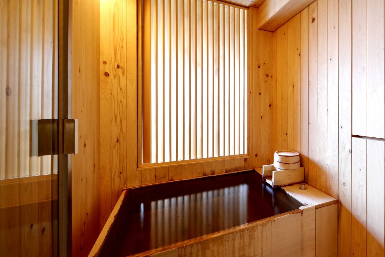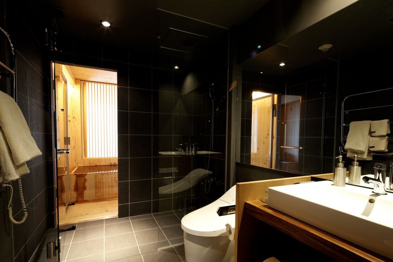 露天風呂からは庭の緑と蔵を望み、コーナーに設えられた障子からは美しい西陽が差し込みます。トイレやシャワールーム、露天風呂も広めに作られているのが特徴で、水まわりの贅沢さは「グランスイート」に次ぎます。