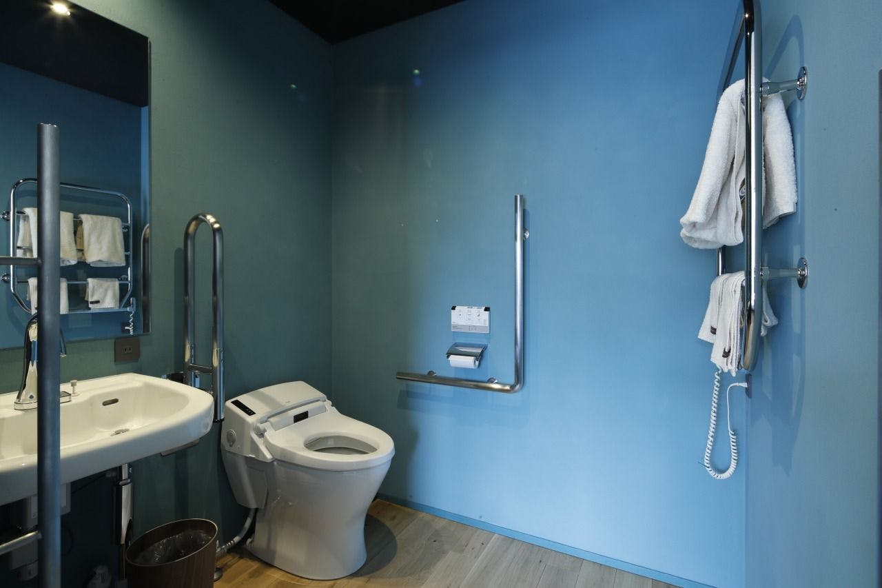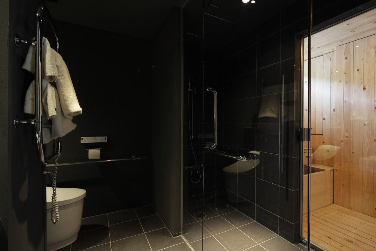 トイレと洗面は車椅子でも回転できる広さを確保。シャワールームと露天風呂も直線に配置、ドアを3枚開き戸として開口部を広く取りました。また2台のベッドのうち、一台はご家族の介護を想定した電動ベッド(簡易介護ベッド)。同フロアの他の客室(ガーデンツイン・キッズウェルカムガーデンツイン・ベビーウェルカムコンフォートツイン)にご家族が滞在して、二世代でご利用いただくことも可能です。