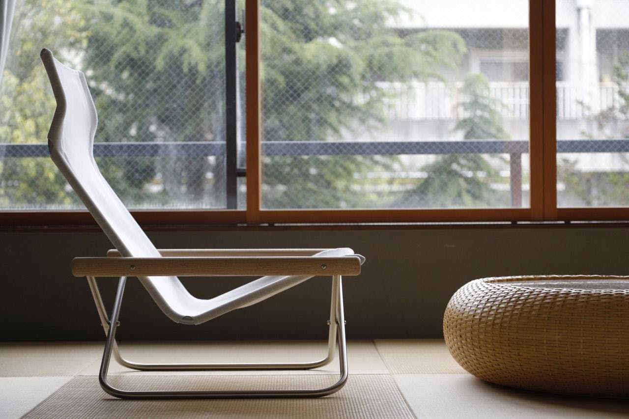 壁は珪藻土、床は畳。リビングスペースには、日本人デザイナーの新居 猛(1920-2007)がデザインした、日本を代表するイージーチェア「NyChair」を2台配置。軽くて移動可能でありながら、驚くべき座り心地を実現したリラクゼーションチェアです。