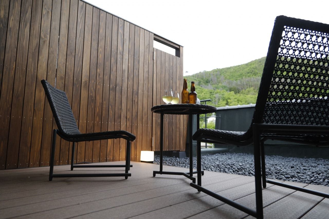 もちろんこの景観は露天風呂からも。「松本本箱」で最も広い湯船であるのはもちろん、長湯ができるように、二人が腰掛けられるスペースが設けられています。ミニキッチンがついているのも特徴で、カウンターチェアに腰掛けて話に没頭したり、ソファで読書を楽しんだり…。