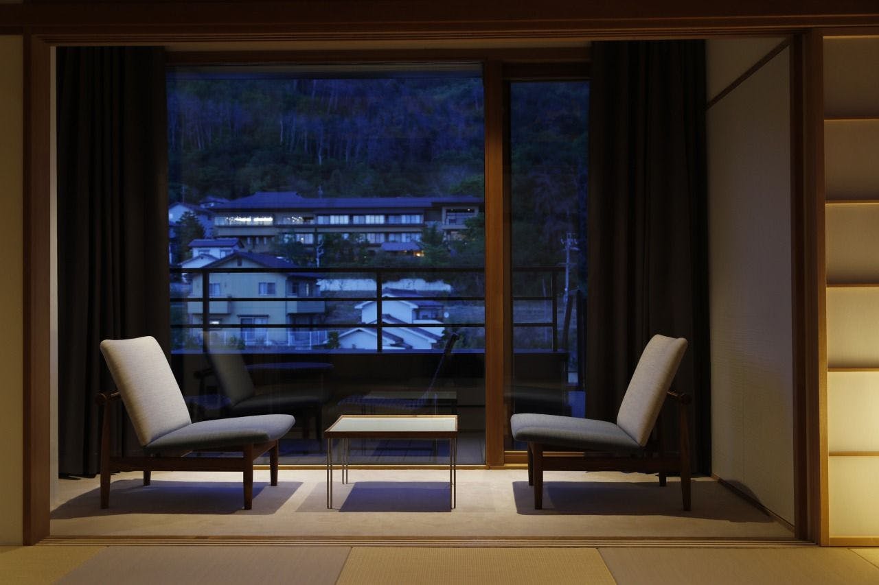 最上階の角部屋。リノベーション前から広かった小柳の客室ですが(一室45平米前後)、3部屋をぶち抜いて眺望を楽しめる客室を作りました。北アルプスの空が夕焼けに染まる日は、一面の窓が自然のスペクタクルを映し出す巨大スクリーンに変わります。