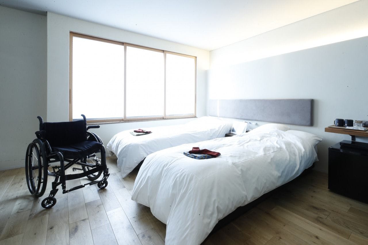 昇降機能もある電動ベッド1台(幅100cm)+通常ベッド(幅100cm)のツインルームと、リビングスペース付きツインルーム(幅120cm×2台)の2ルームを備えた客室です。トイレと洗面は車椅子でも回転できる広さを確保。シャワールームと露天風呂も直線に配置、ドアを3枚開き戸として開口部を広く取りました。