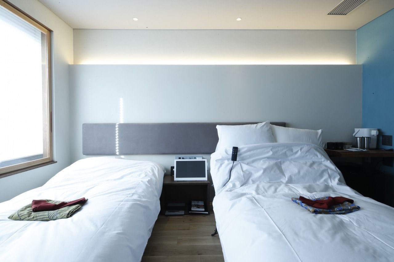 客室はシンプル&スモール。ベッド幅は100センチ。基調色は白で壁面は珪藻土仕上げ。間接照明をベースにしているため、光が柔らかです。