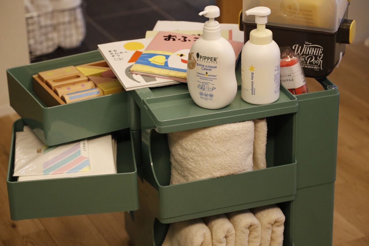この客室にはベビーベッド、バウンサー、70度設定ポット、哺乳瓶除菌キット、スポンジ(使い捨て)、哺乳瓶用洗剤、電子レンジ、おむつポッド、おむつ用防臭袋、流せるおしりふき、おねしょシーツ、ベビーソープ、脱臭除菌加湿器、絵本、知育おもちゃが備え付けられています。また事前申し込みのオプションで、ベビーカー(A型)をご利用いただけます。