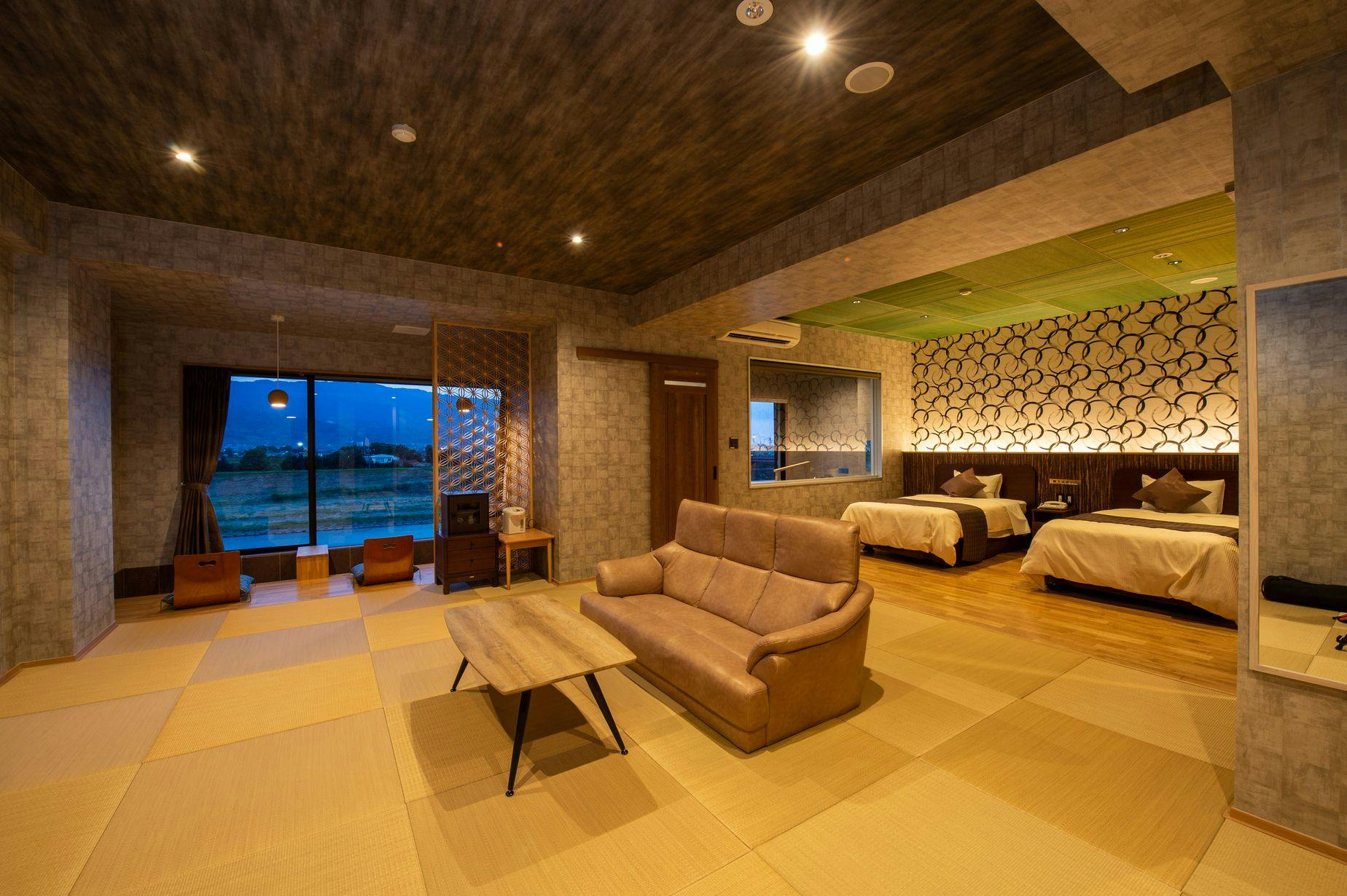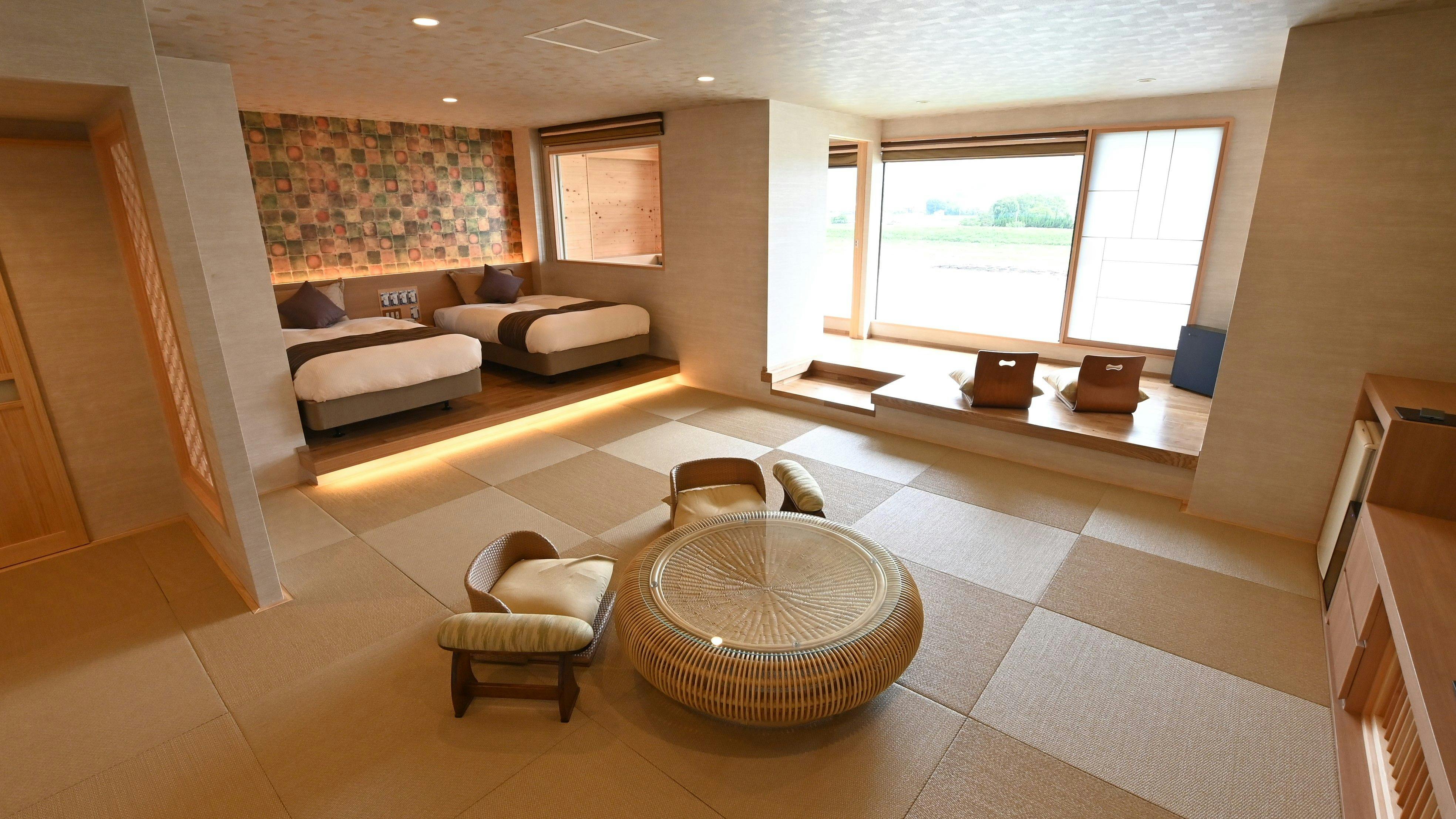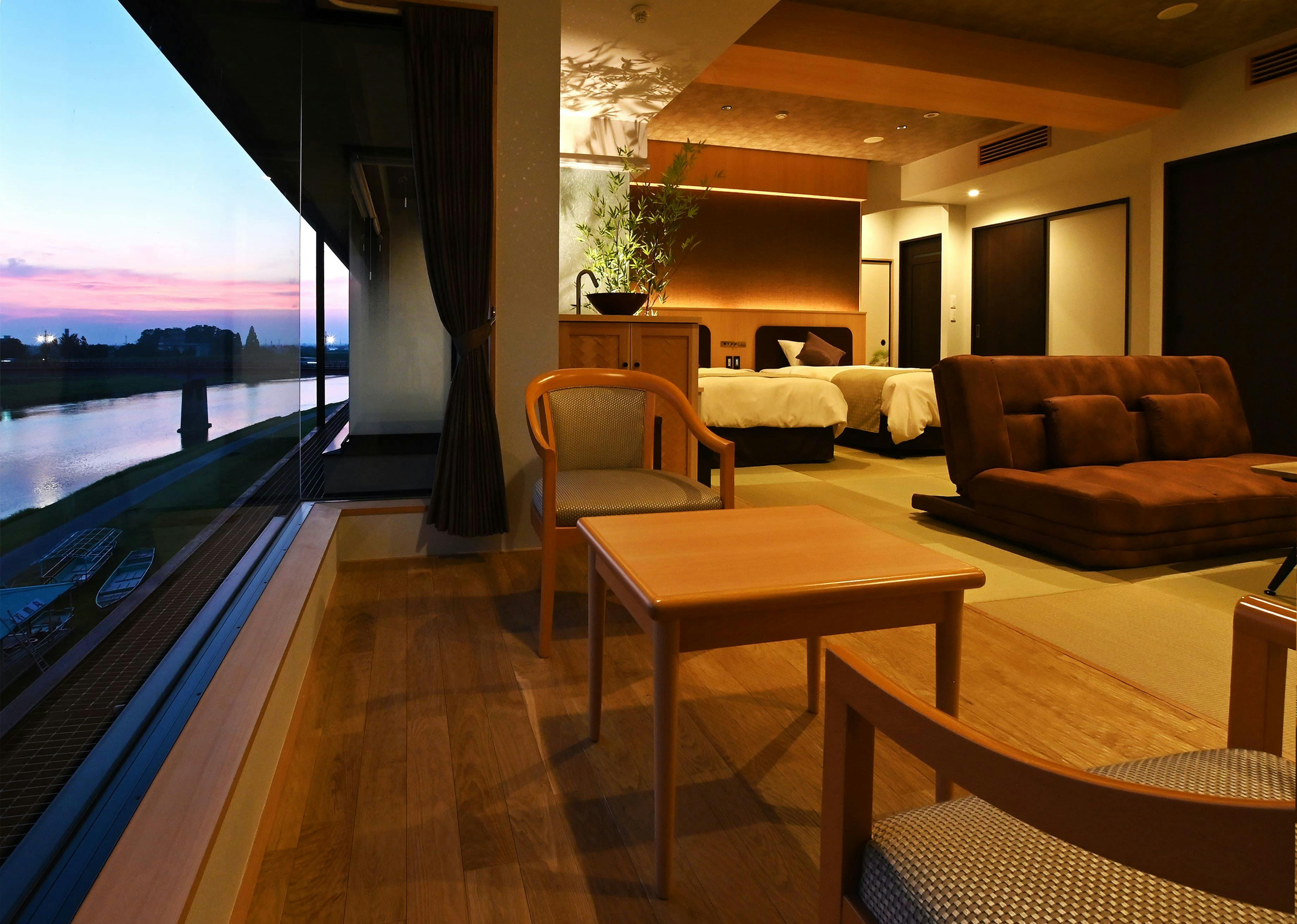 「美人の湯」で知られる源泉露天風呂と内風呂を客室に備えた特別室。当館が所有する客室の中で一番広々とした間取りの和洋室(合計108.62平米)でゆったりお過ごしください。リバーサイドのお部屋です。