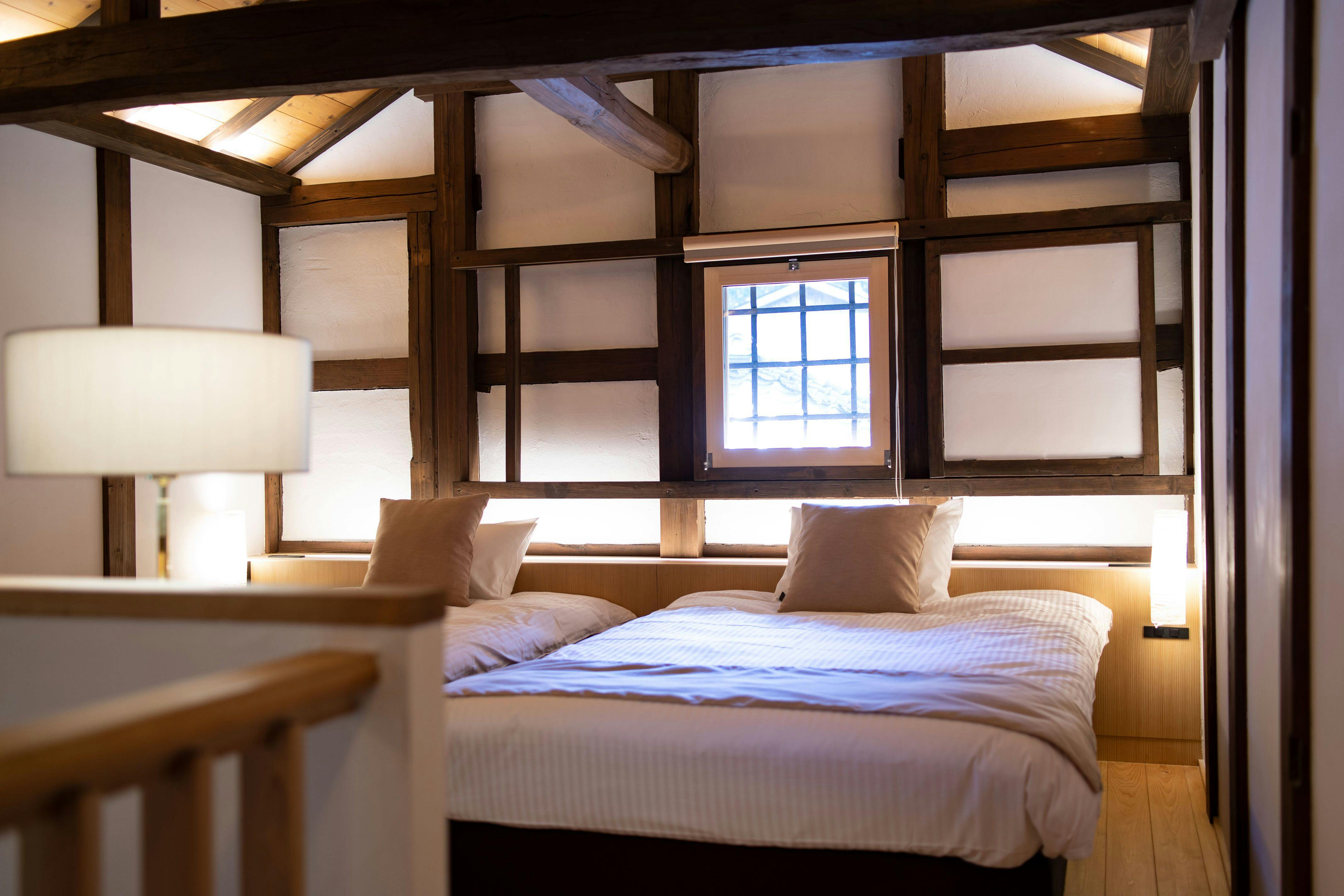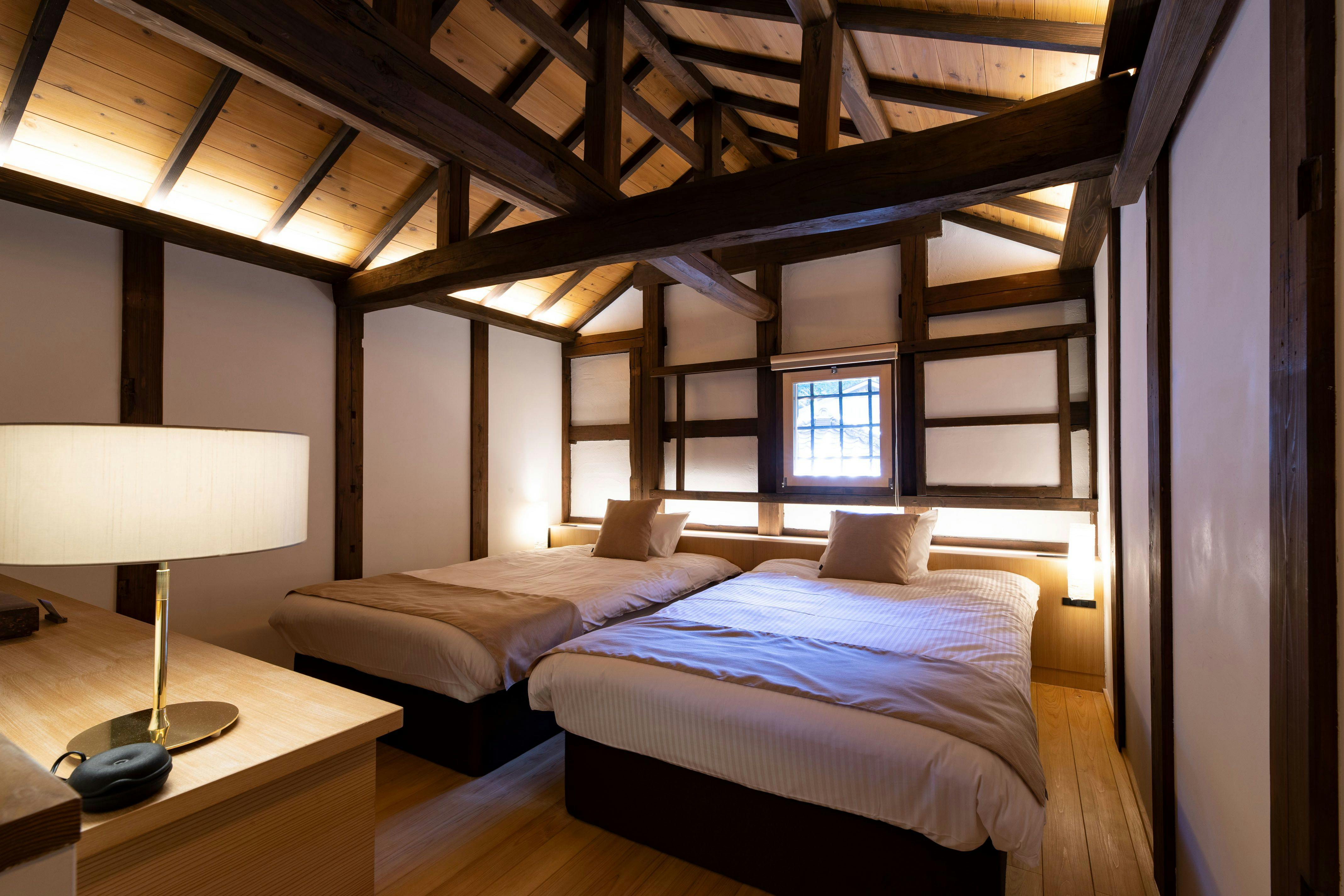 明治時代に増築された蔵を改造したメゾネットタイプのスイートルーム。扉や梁など、当時のしつらえをそのまま残しつつ、「洋」の快適さが融合したお部屋は、まるで隠れ家にいるようなおこもり気分が味わえます。