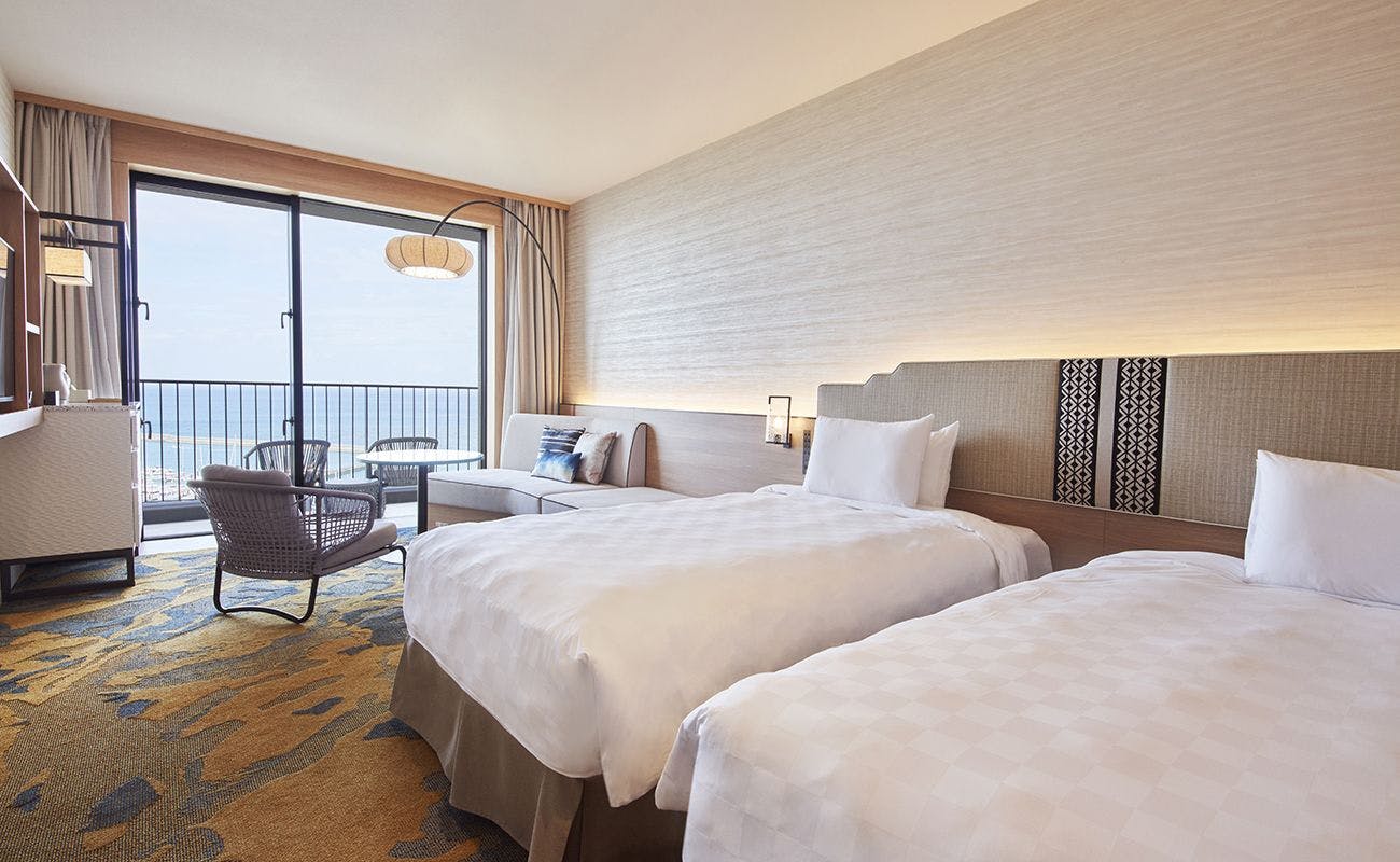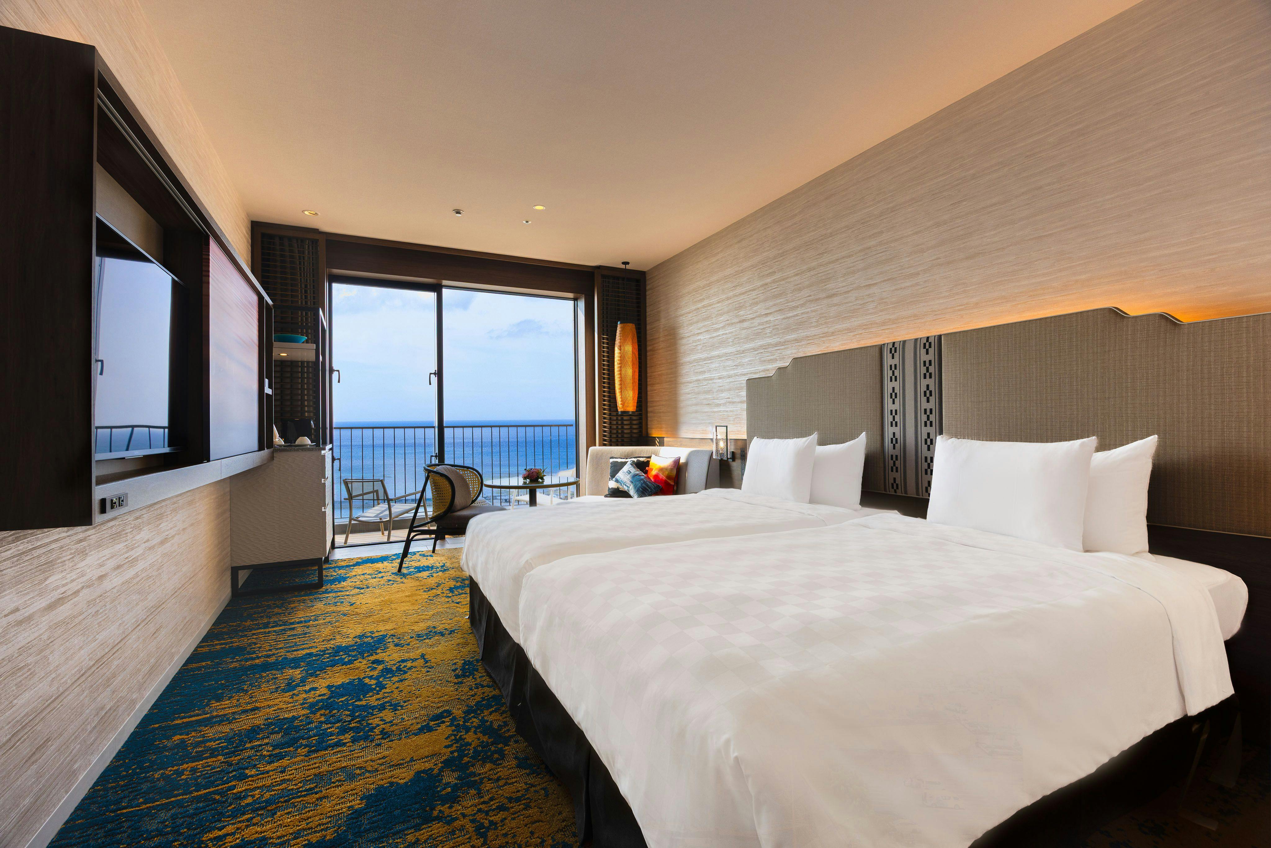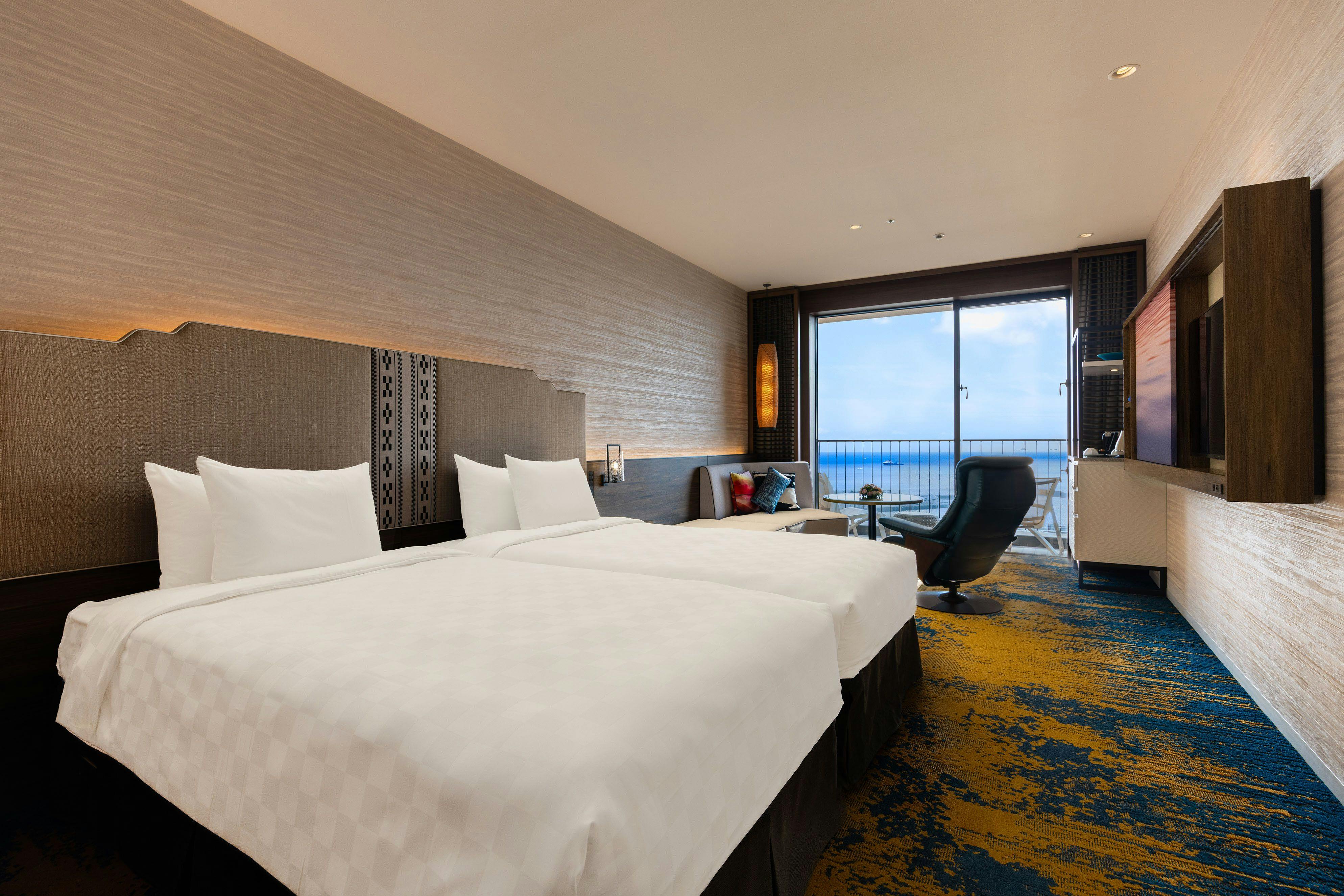 クラブフロアにご宿泊のお客さま専用の、最上階(14階)クラブラウンジとインフィニティプールをご利用いただけます。オーシャンビュー(西向き)、バルコニー付きのお部屋です。※ハリウッドツインは、2台のベッドを密着させて並べたツインルームです