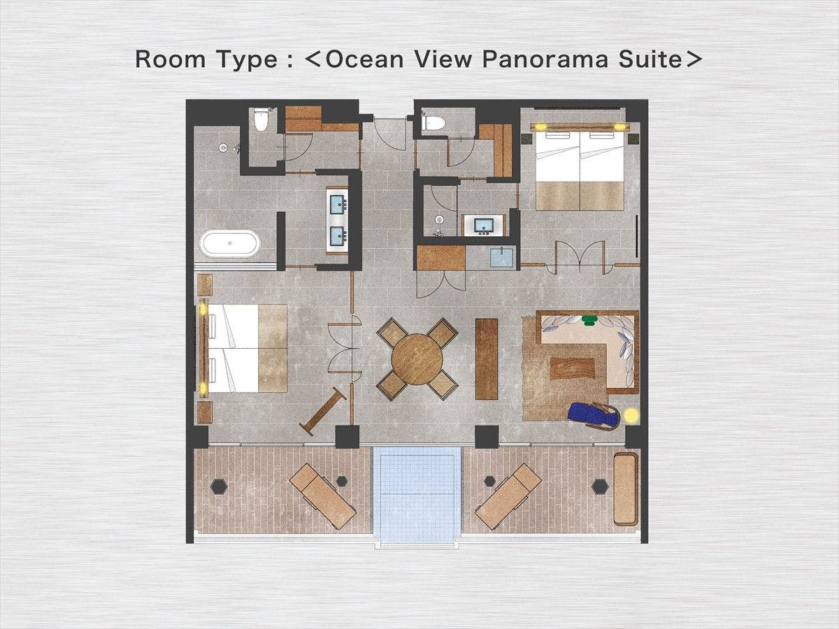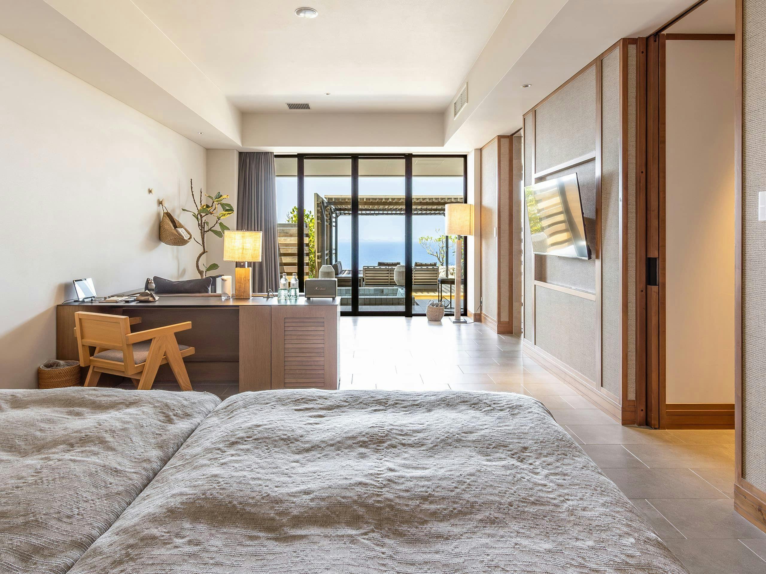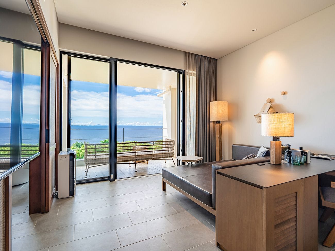 テラスにジャグジーを完備。ザ・グランドが誇る最上級スイートルーム。一面ガラス張りの開放感あるリビングと、東シナ海をパノラマで一望できる屋外ジャグジーで、贅沢な時間をぜひご体感ください。