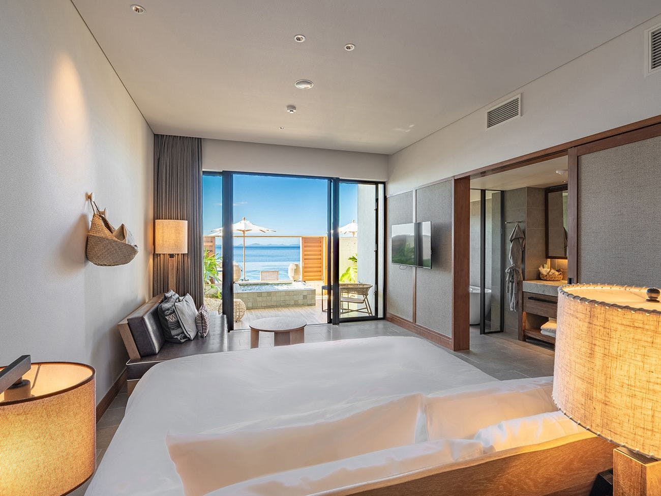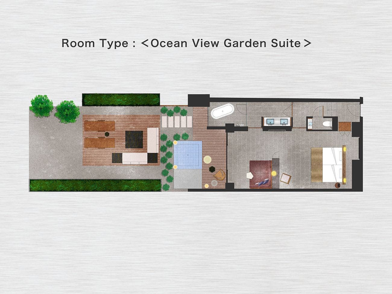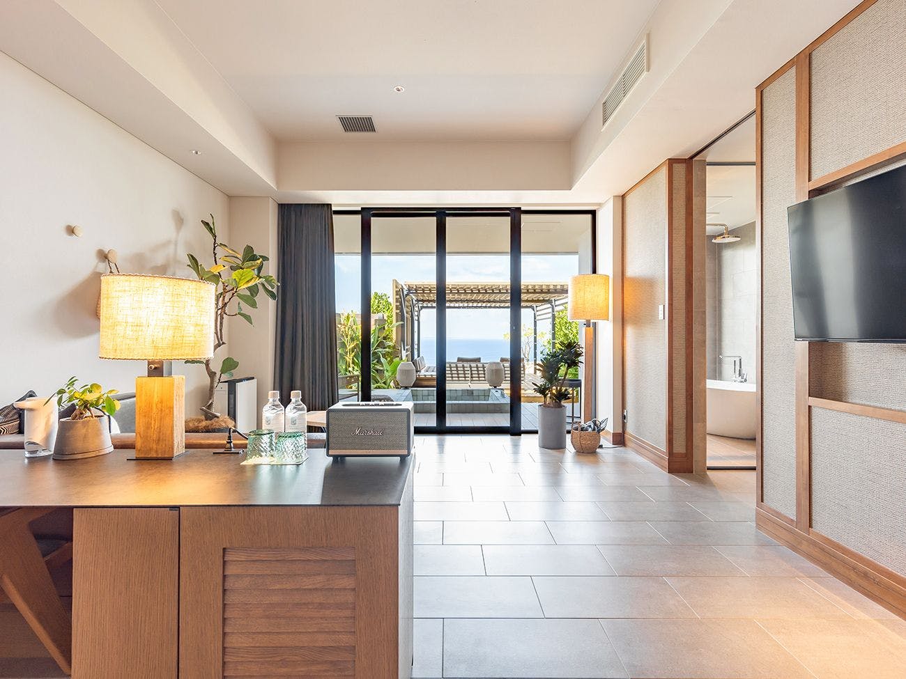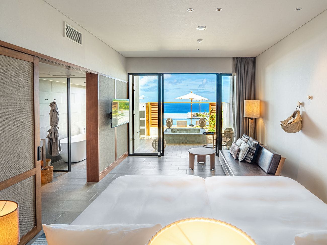 テラスにジャグジーを完備、庭を抜けて直接インフィニティプールへの行き来が可能なお部屋。※お庭の外側のインフィニティプールは他のお客様も利用いたします。プール側からも客室側が見える造りになっているため、ジャグジーをご使用の際は水着を着用になるか、間仕切りの木引き戸を閉めてお楽しみください。