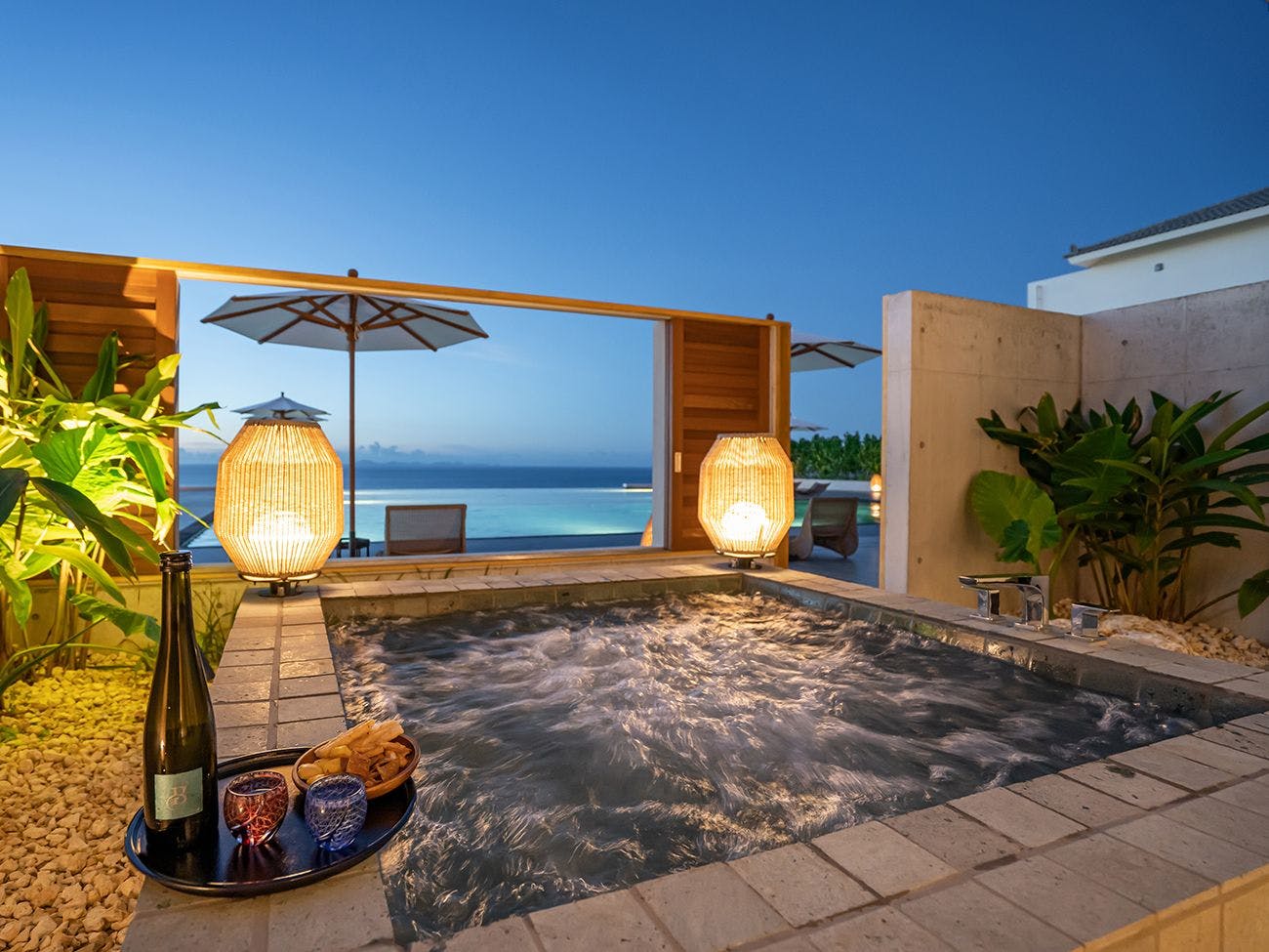 テラスにジャグジーを完備。室内もゆったりと広く設計され、ご滞在をゆっくりとお楽しみいただけます。専用の広い庭もあり、夜は古宇利島の星空をご堪能ください。