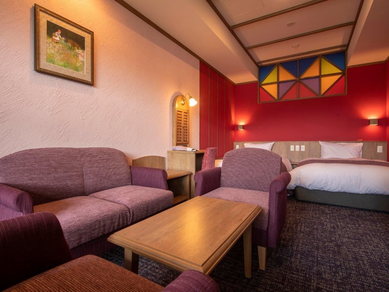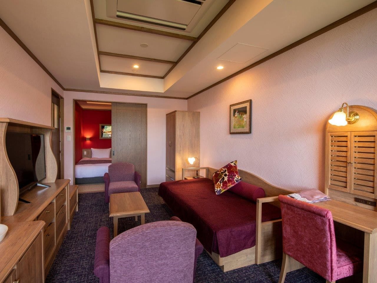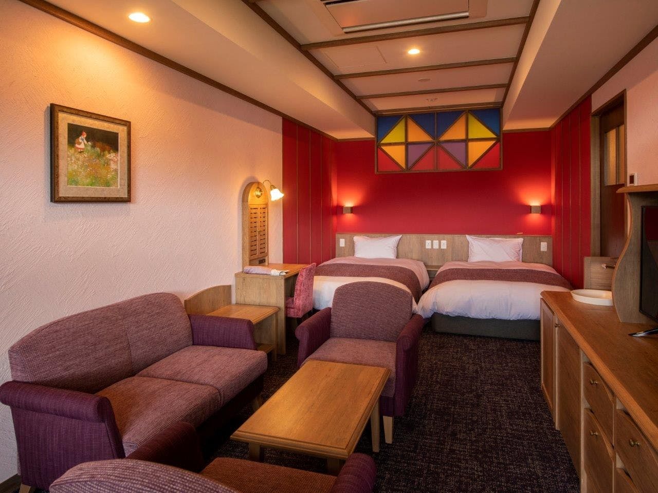 バルコニーからの景色と赤ずきんのマントをイメージした個性豊かな客室で非日常の世界を