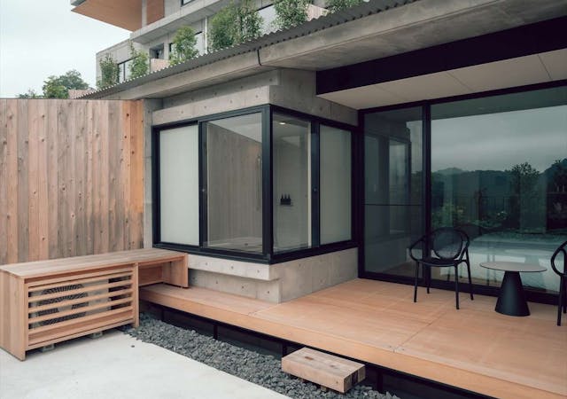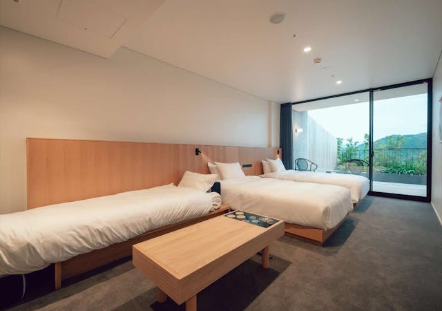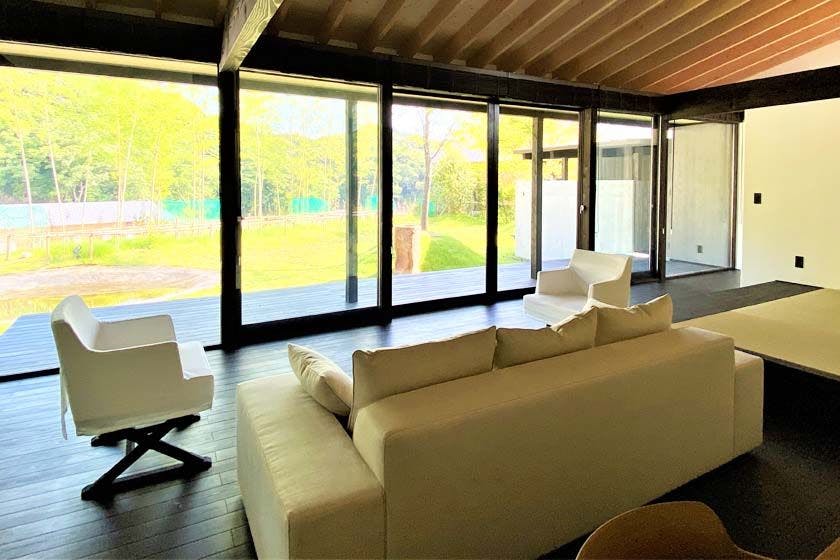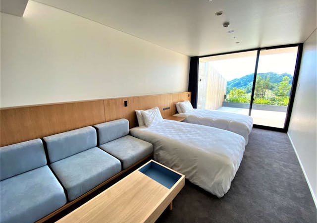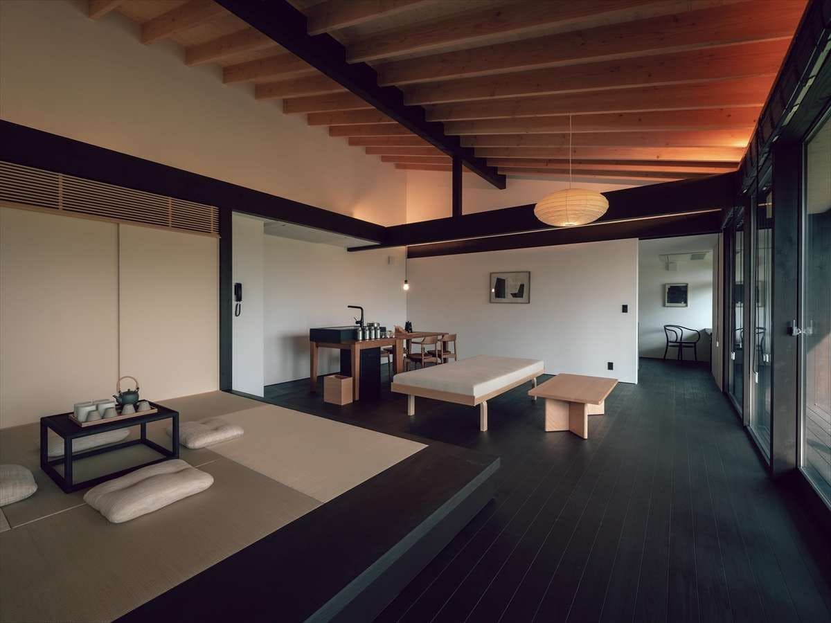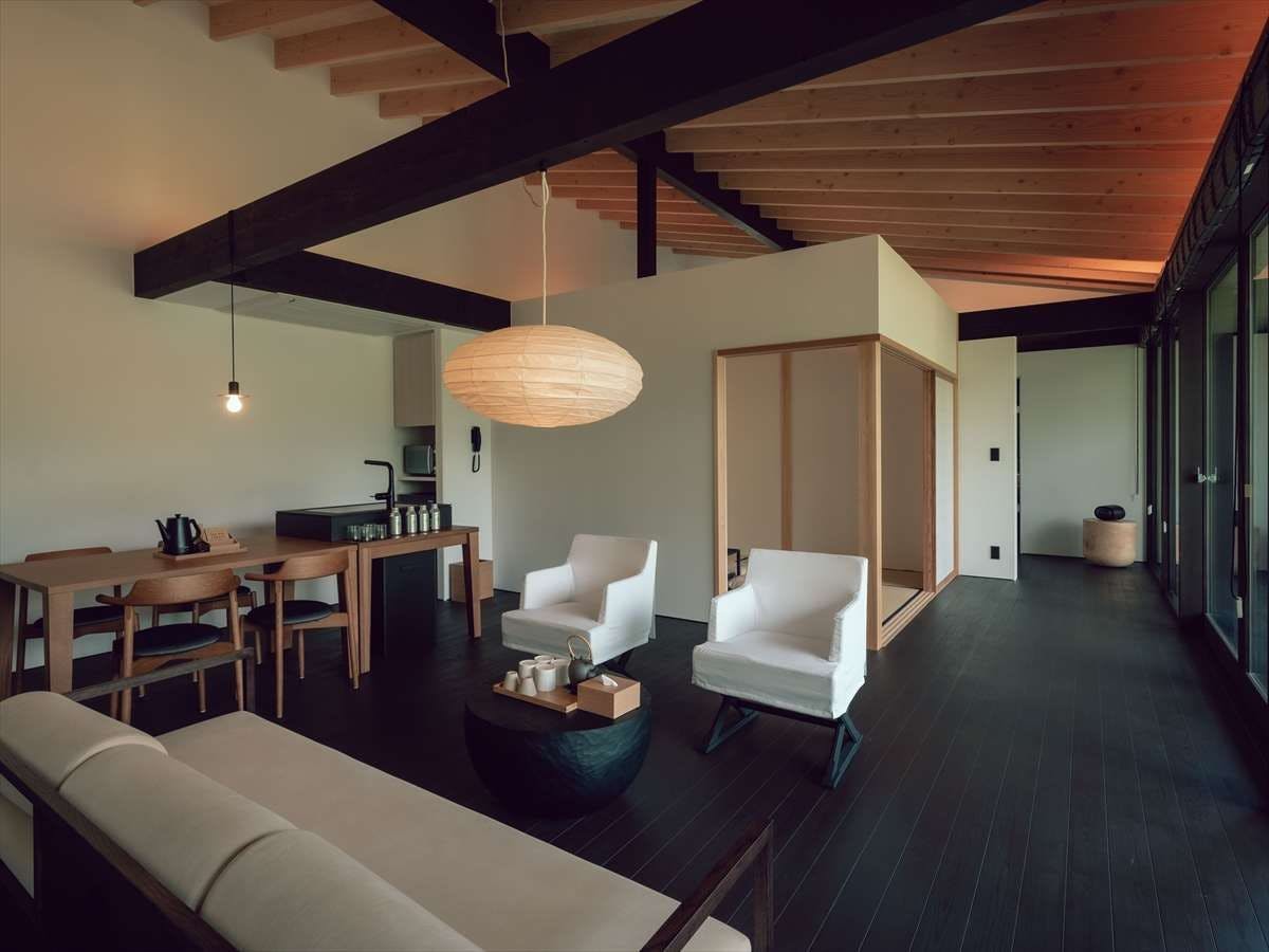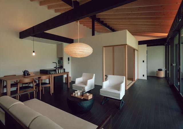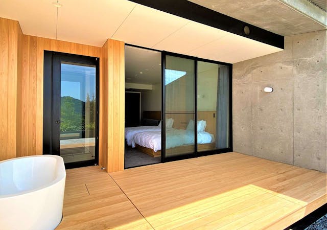 お客様の別荘のような「戸建て隠れ家」でハイエンドな滞在をかなえる和モダンをコンセプトにしたヴィラ。 プライベートガーデンには多気の大自然を一望できる露天風呂と外居間を設けて、ベッドルームとリビングルームからなる客室は100平米と広々。