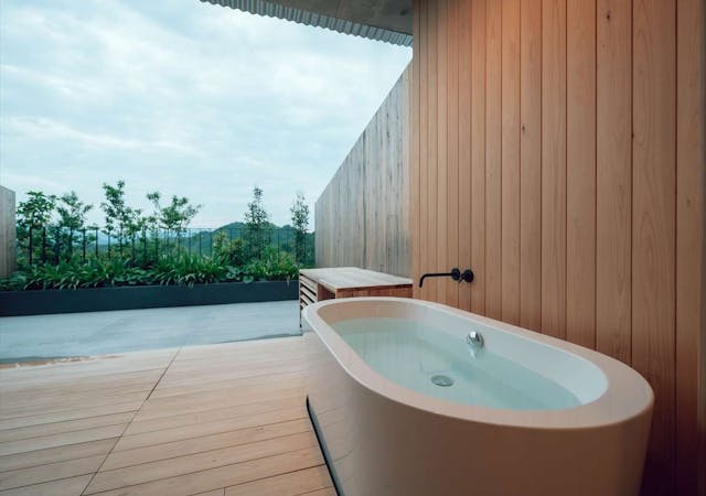 客室内バスルームからトイレ・屋外テラスまでを一つの空間と考える「ウォーターリビング」の発想で、