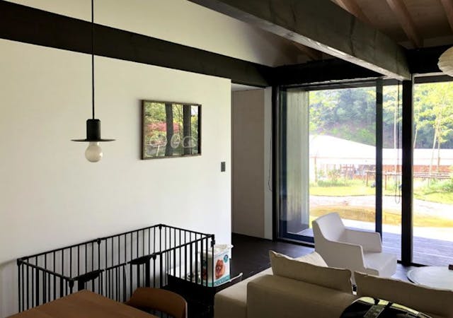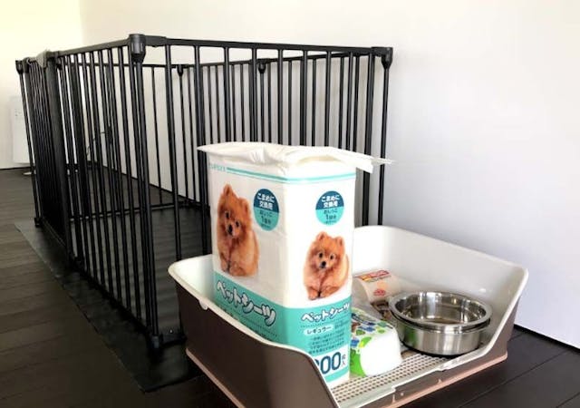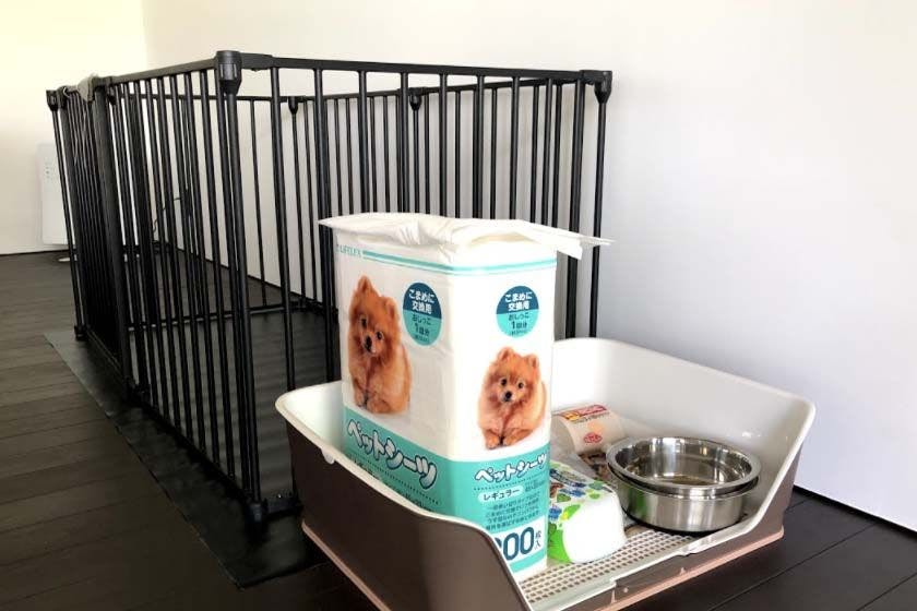 ワンちゃんと一緒に泊まれるヴィラ。室内にはケージ(トイレシーツセット)や食器、犬用タオル、