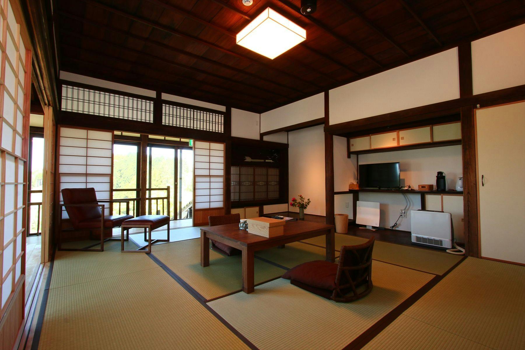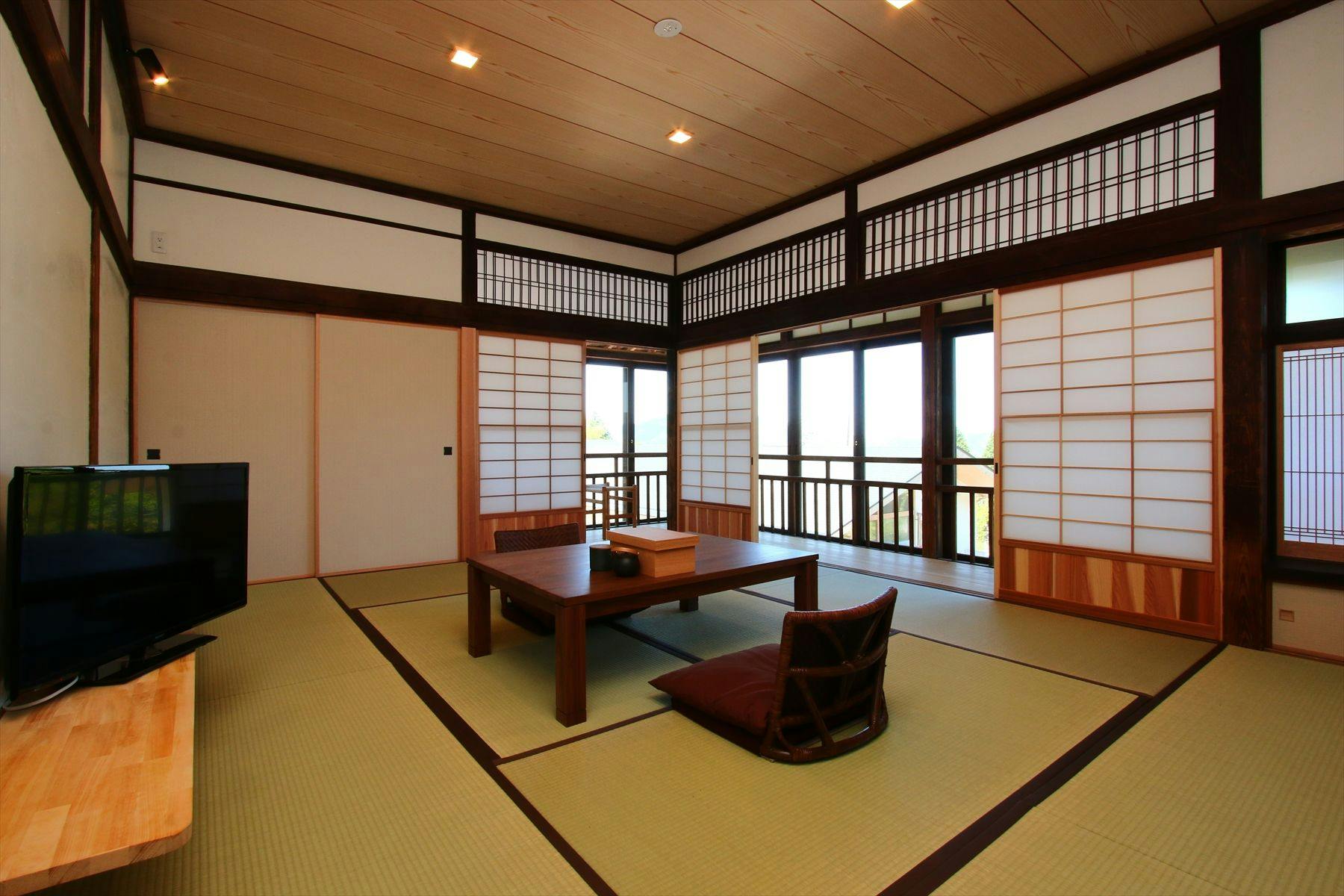 地獄温泉の北側、お部屋からは夜峰山から南外輪まで一望でき、全開放の戸を開けると大自然が目の前に。運が良ければ眼下に雲海があらわれるかもしれません。