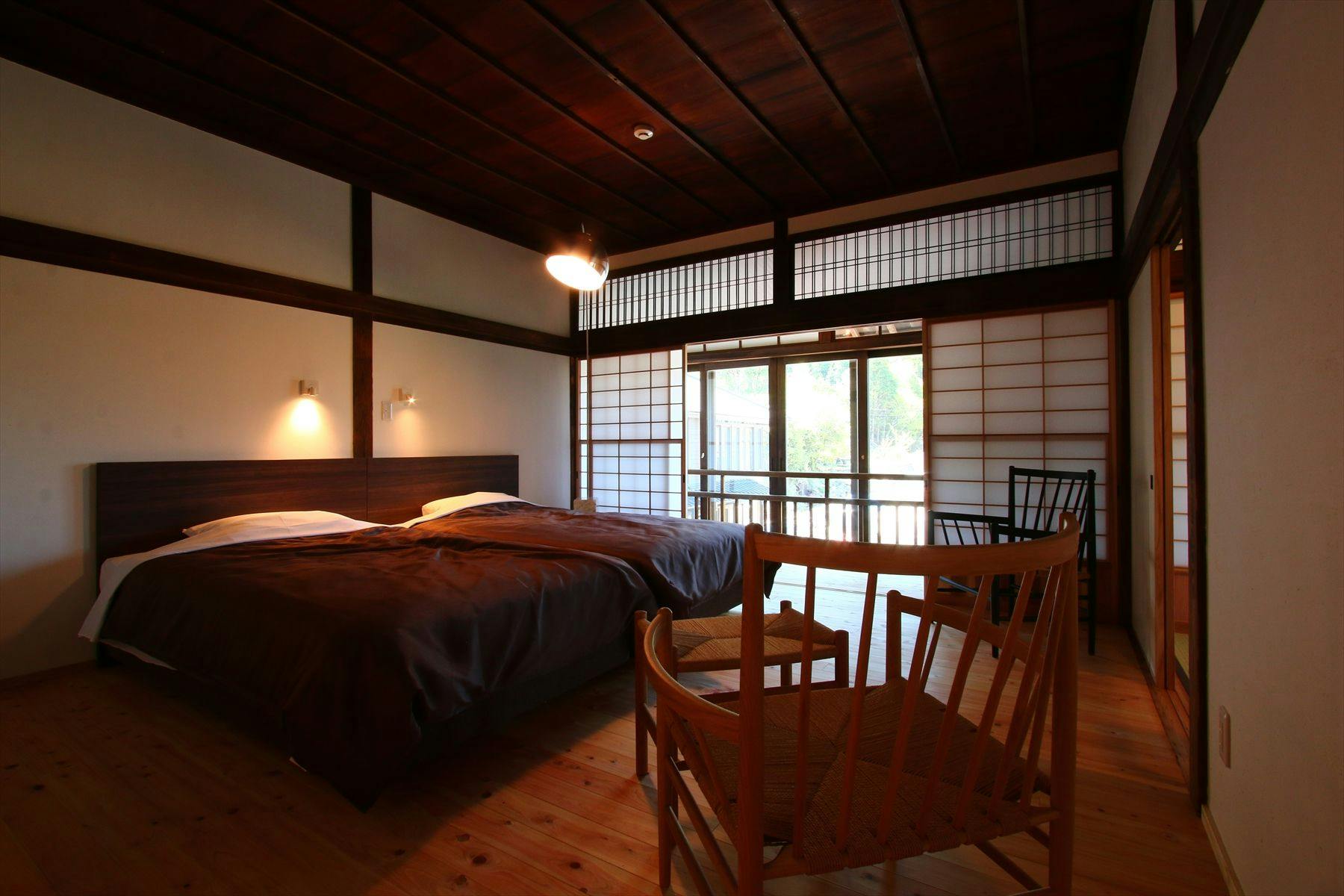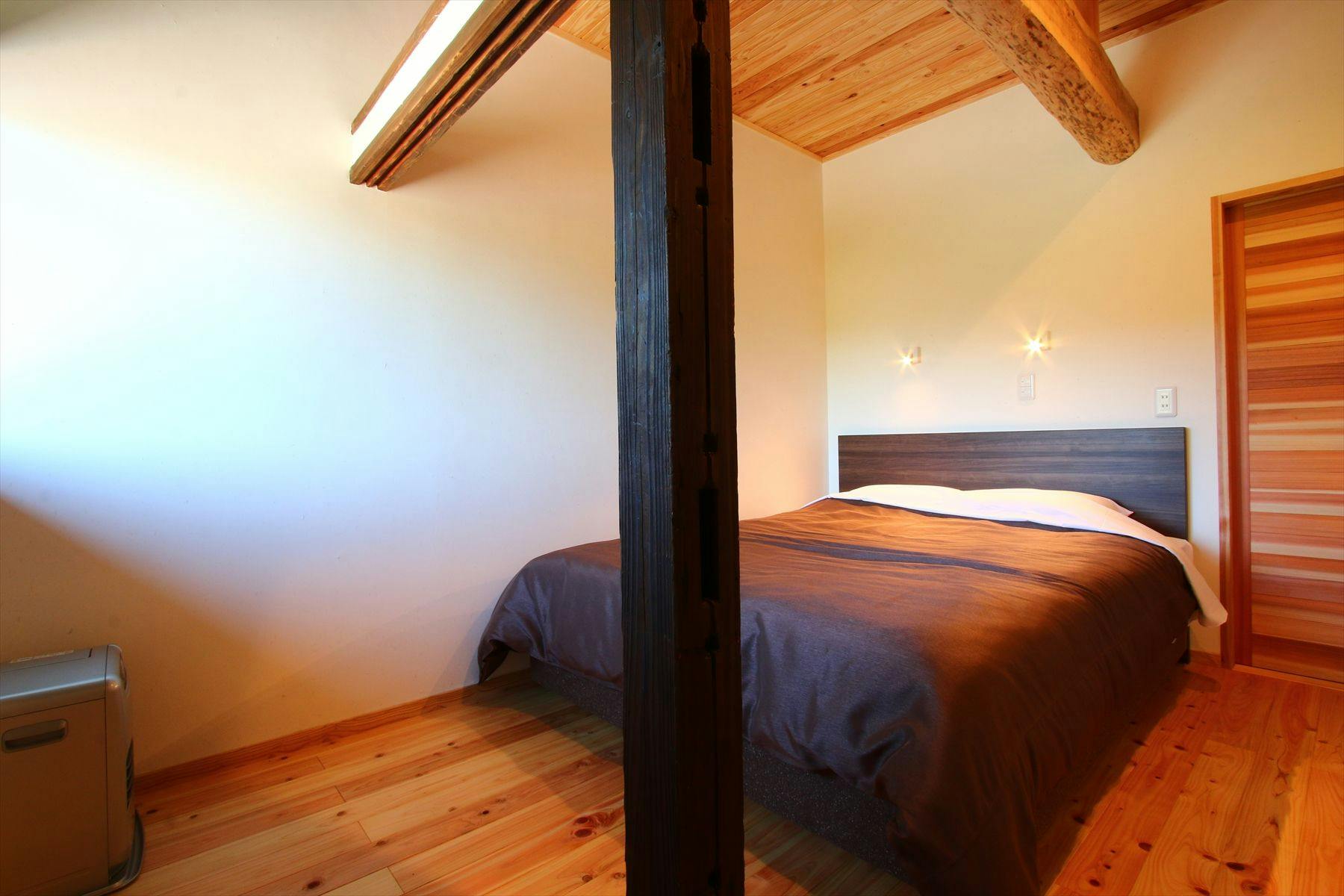震災で被害を受けた本館をリニューアル。明治中期の建物である本館の柱や床、天井など残せるものは残した青風荘でしか味わえない空間でどうぞごゆるりとおつくろぎください。居間(6畳)、寝室(6畳、セミダブル×2)、トイレ、洗面所、本館2階の角部屋。2方向縁側。夜峰山向き。