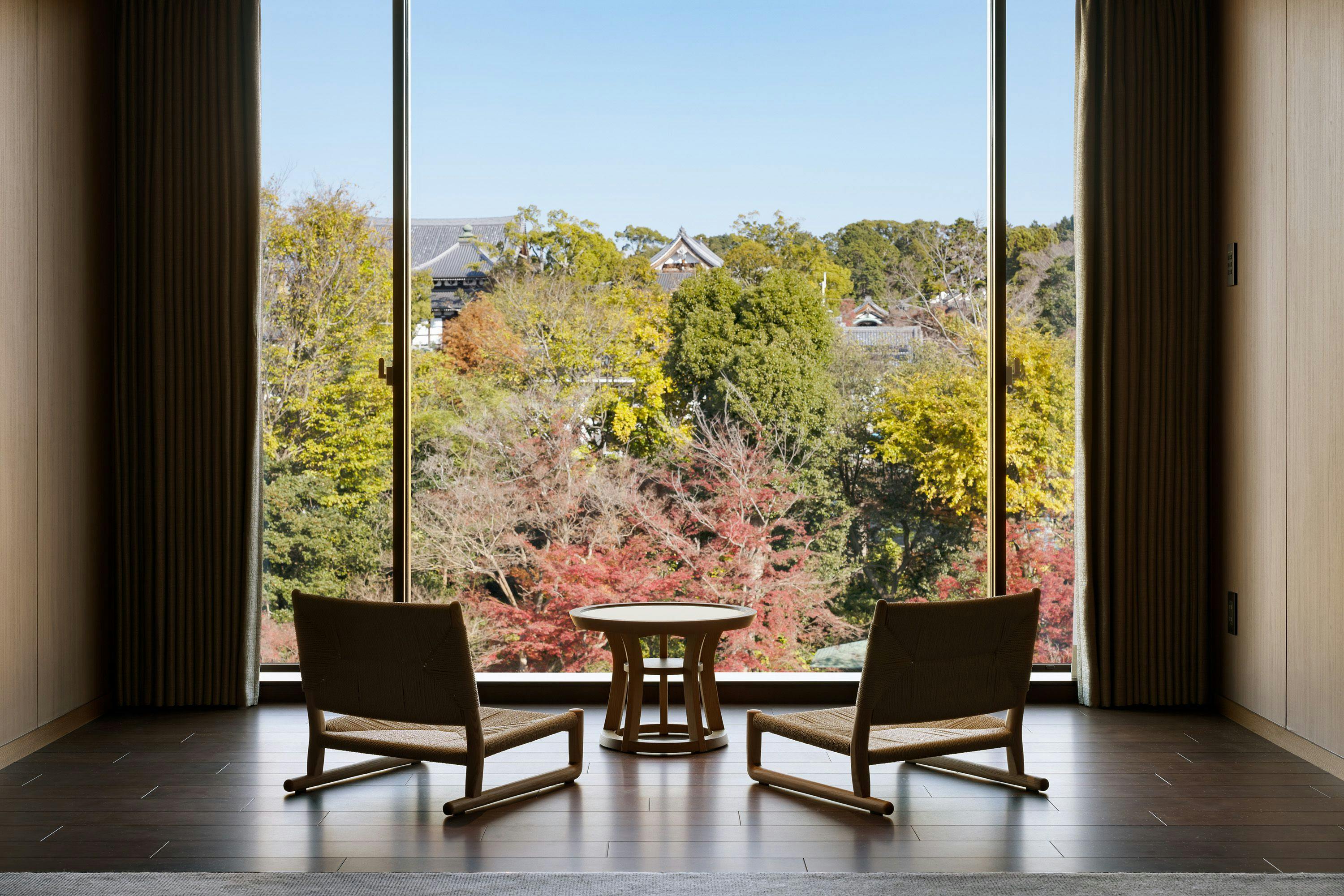 季節ごとに異なる窓辺の植栽や、金戒光明寺の山門が建つ山々の景色をお楽しみいただけます。