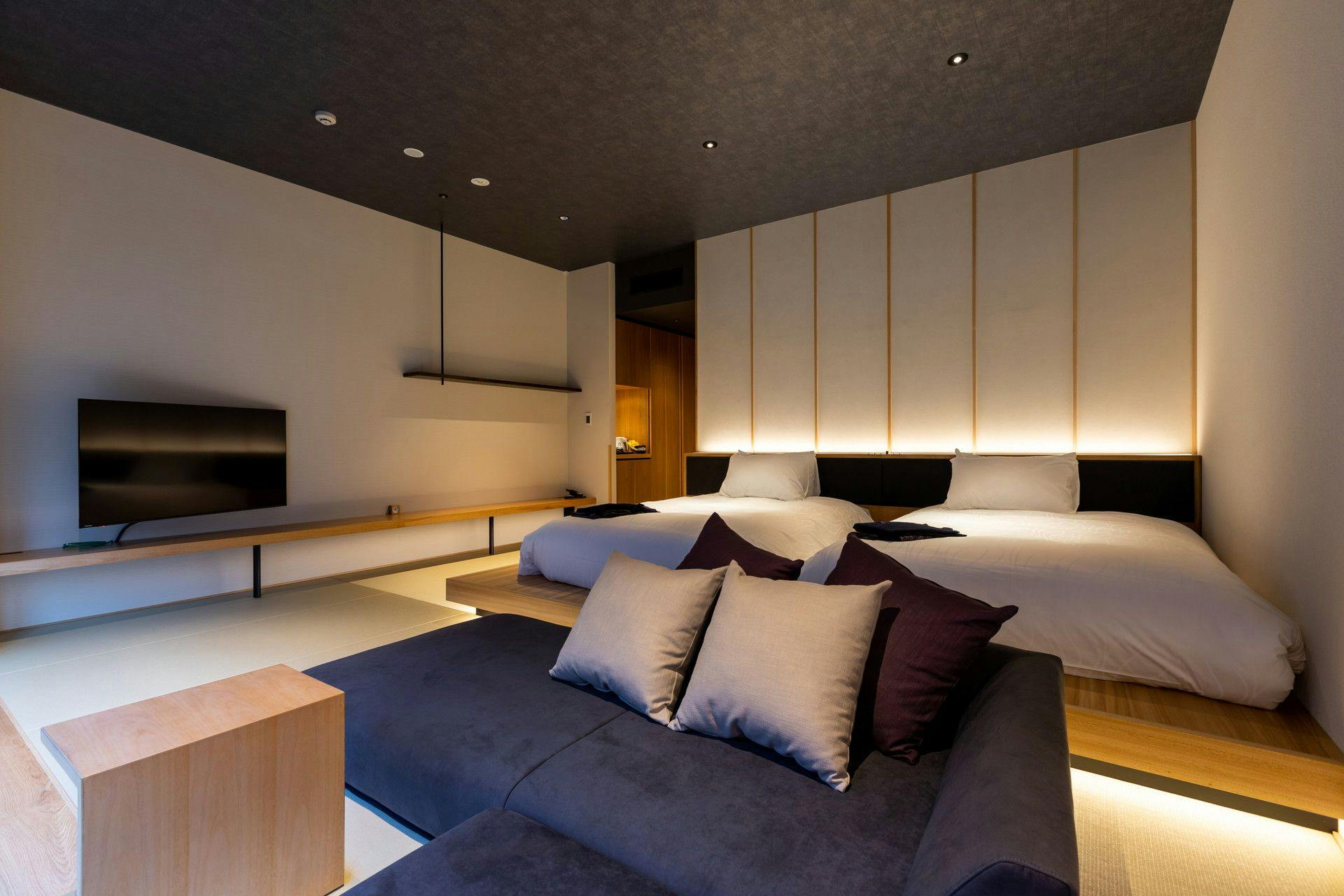 ■広さ:38平米■対象階:2階、5~8階■ベッドサイズ:W1100mm×L1950mm×2台■3名様以上でのご予約時は、常設ソファベッド1台ならびに追加のお布団2組を人数に応じて準備いたします