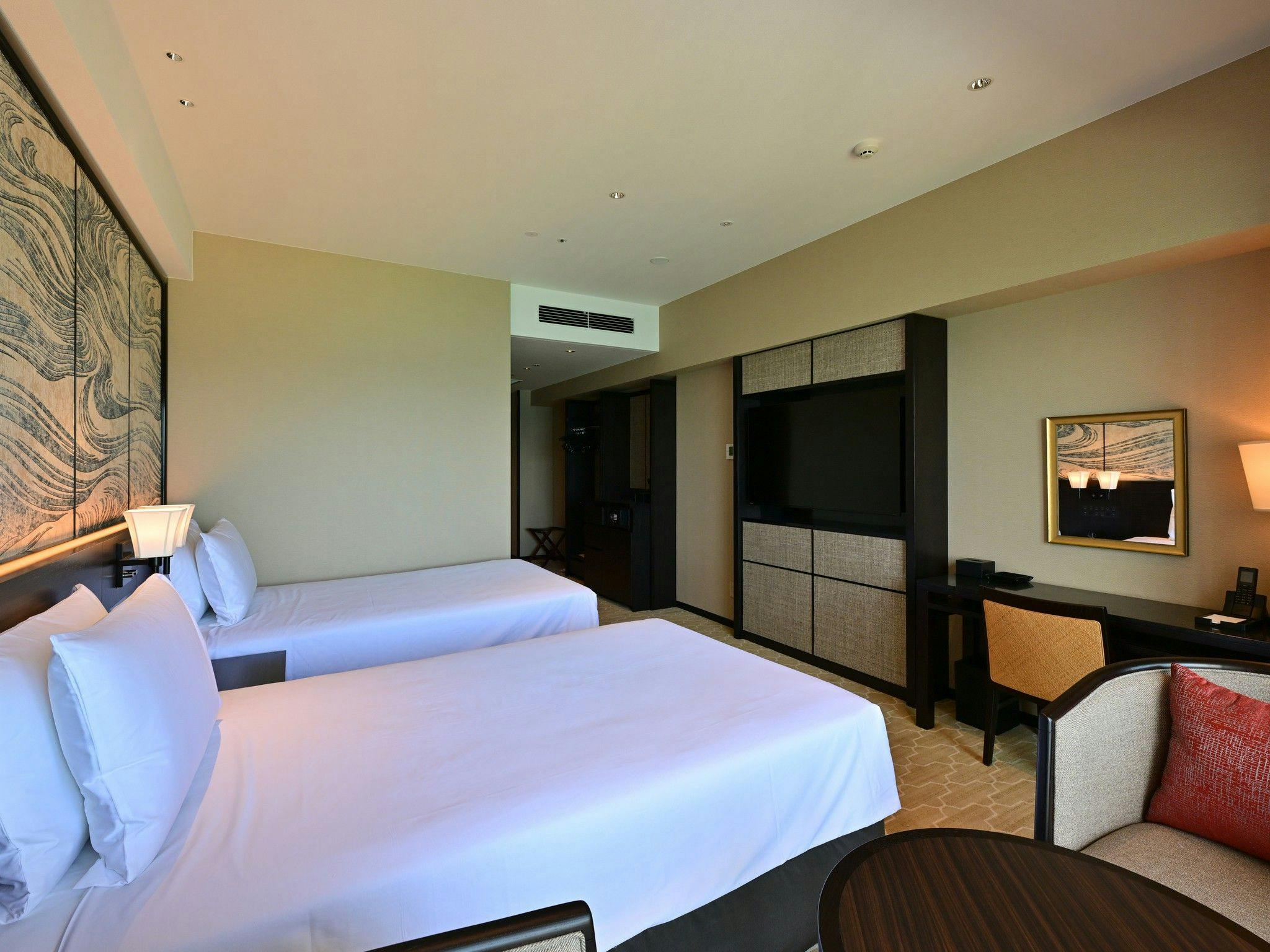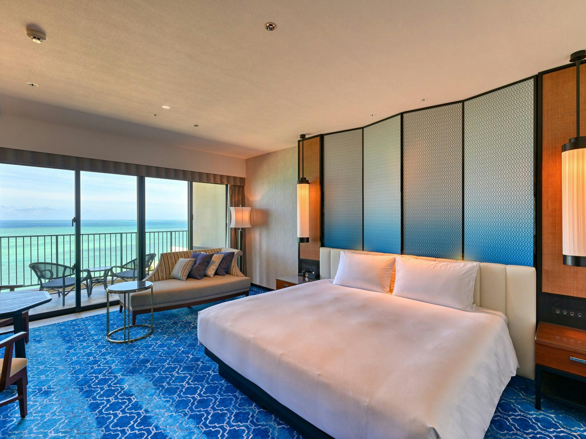 オーシャンビュー&サンセットビュー。当ホテルお薦めの客室です。広々としたエントランス空間と、その向こうには、宮古上布をモチーフにしたゴールド※のベッドボードが目を惹くベッドルームが続きます。
