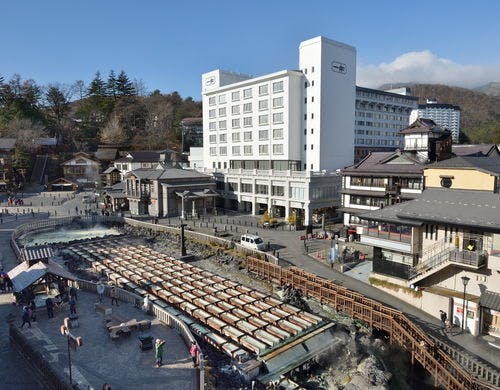 草津温泉の象徴「湯畑」を一望する、1室のみのお部屋です。1室のみお部屋のためプライベート空間をお約束いたします。お部屋のお風呂は白旗源泉かけ流し、ご滞在中は何度でもご堪能ください。