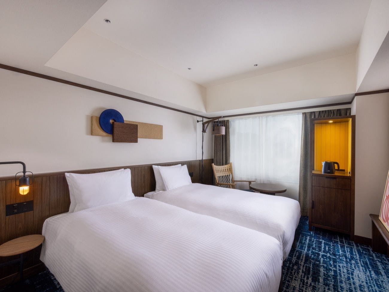 幅100cmのシングルベッド2台をご用意。飛騨高山の素材を使った伝統技術とヨーロッパの遊び心あるデザインで、特別な空間をお愉しみください。