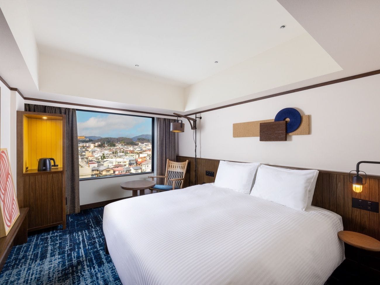 幅180cmのダブルベッド1台をご用意。飛騨高山の素材を使った伝統技術とヨーロッパの遊び心あるデザインで、特別な空間をお愉しみください。