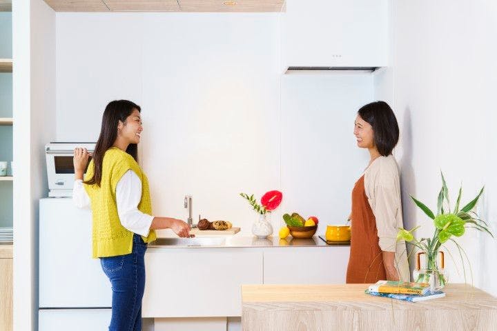 キッチン、冷蔵庫、オーブンレンジ、ドラム式洗濯乾燥機、除湿空気清浄機、TV、電気ケトル、遮光カーテン、歯ブラシ、バスアメニティ、タオル、ドライヤー