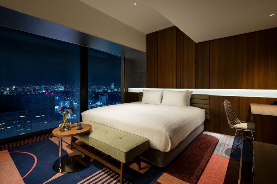 お部屋からは緑広がる都会のオアシス、新宿御苑を見渡せます。開放的なリビングエリアにはコーナールームならではのカーブを描いた横幅6m以上の大きな窓が特長的。ソファやベッドからはもちろん、お部屋のあらゆる箇所から都心の眺望をご満喫いただけます。また、客室内には幅200cmのキングサイズベッドをご用意しております。おふたりでも充分に余裕のあるスペースを確保し、快適な睡眠環境を提供します。