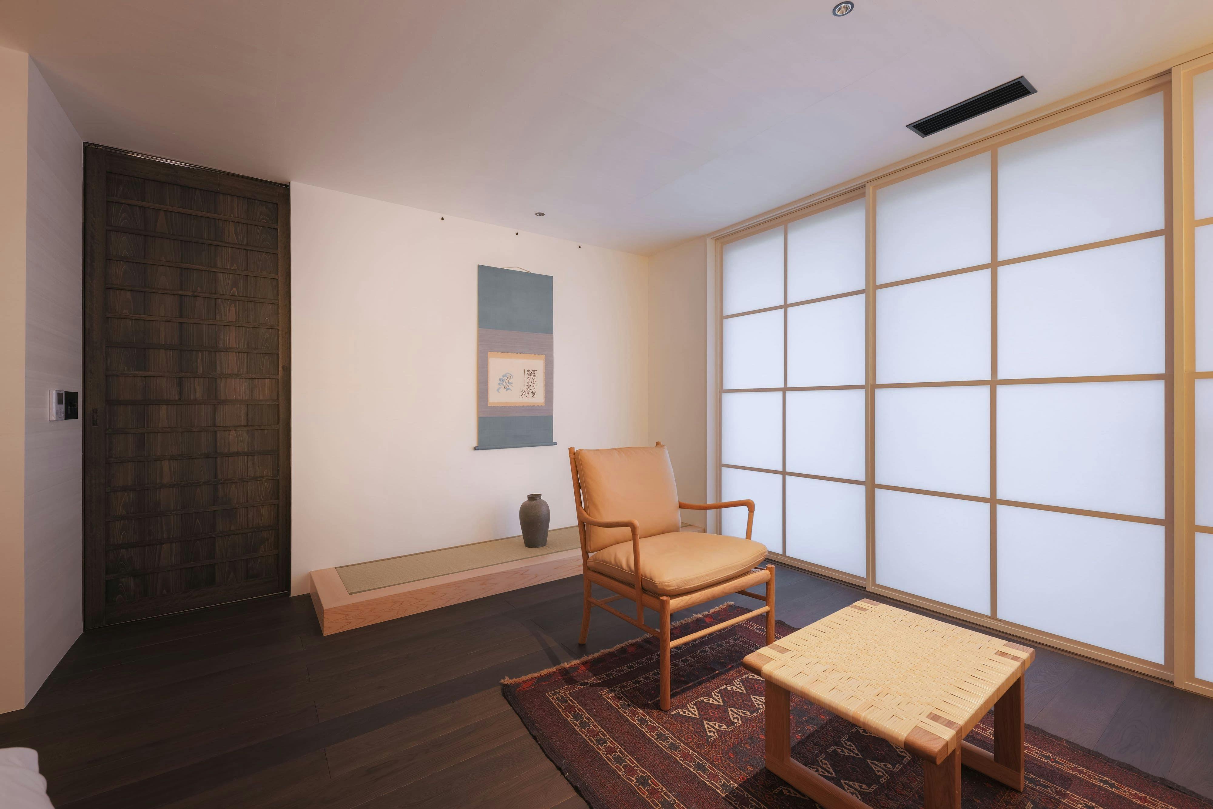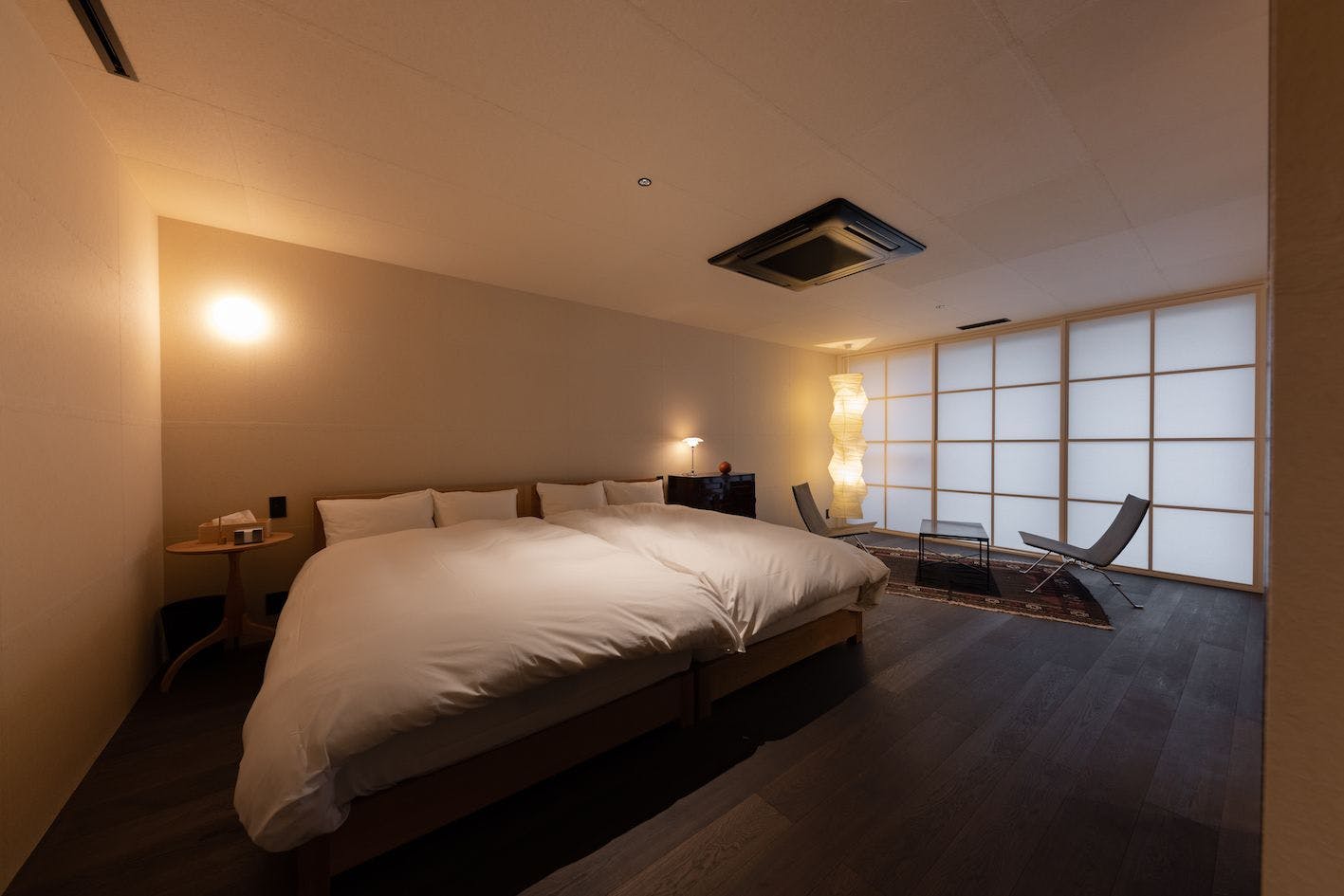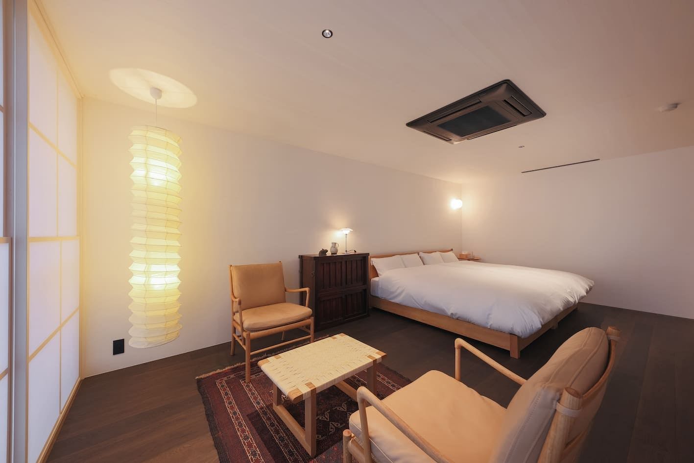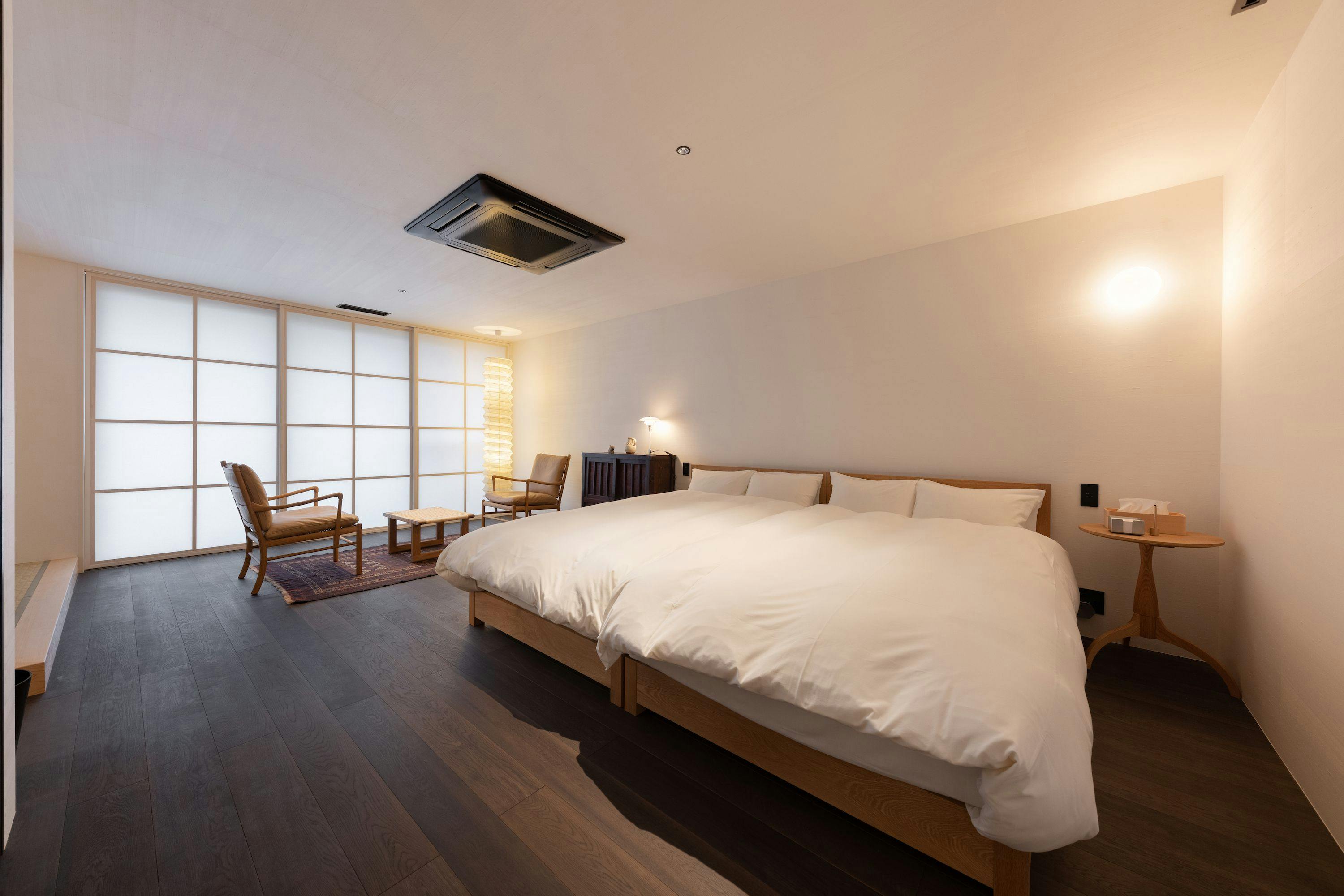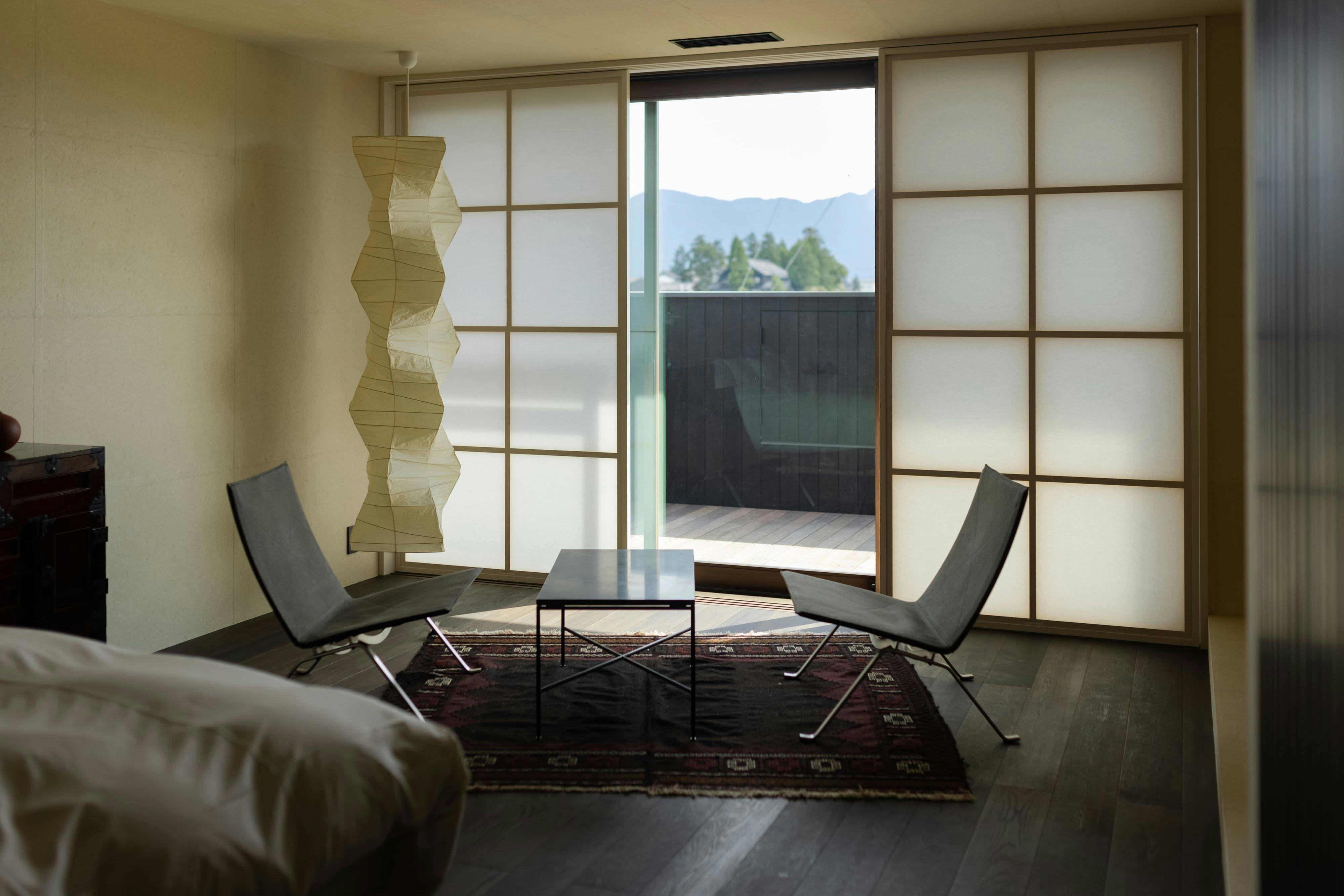三方を水田に囲まれた築120年のアズマダチを再生した楽土庵の全3室の客室は、紙、絹、土という、それぞれ異なる自然素材が用いられています。呼吸する、自然の力が宿る素材たち。それらを使用した全3室の客室は環境と切れ目なくつながり、風景、アート、インテリアと心地よく調和します。「紙 shi」の部屋の壁と天井一面に和紙作家・ハタノワタルによる手漉きの和紙を使っています。やさしい和紙の風合いとアート、インテリアが引きたてあう、親密な空間です。