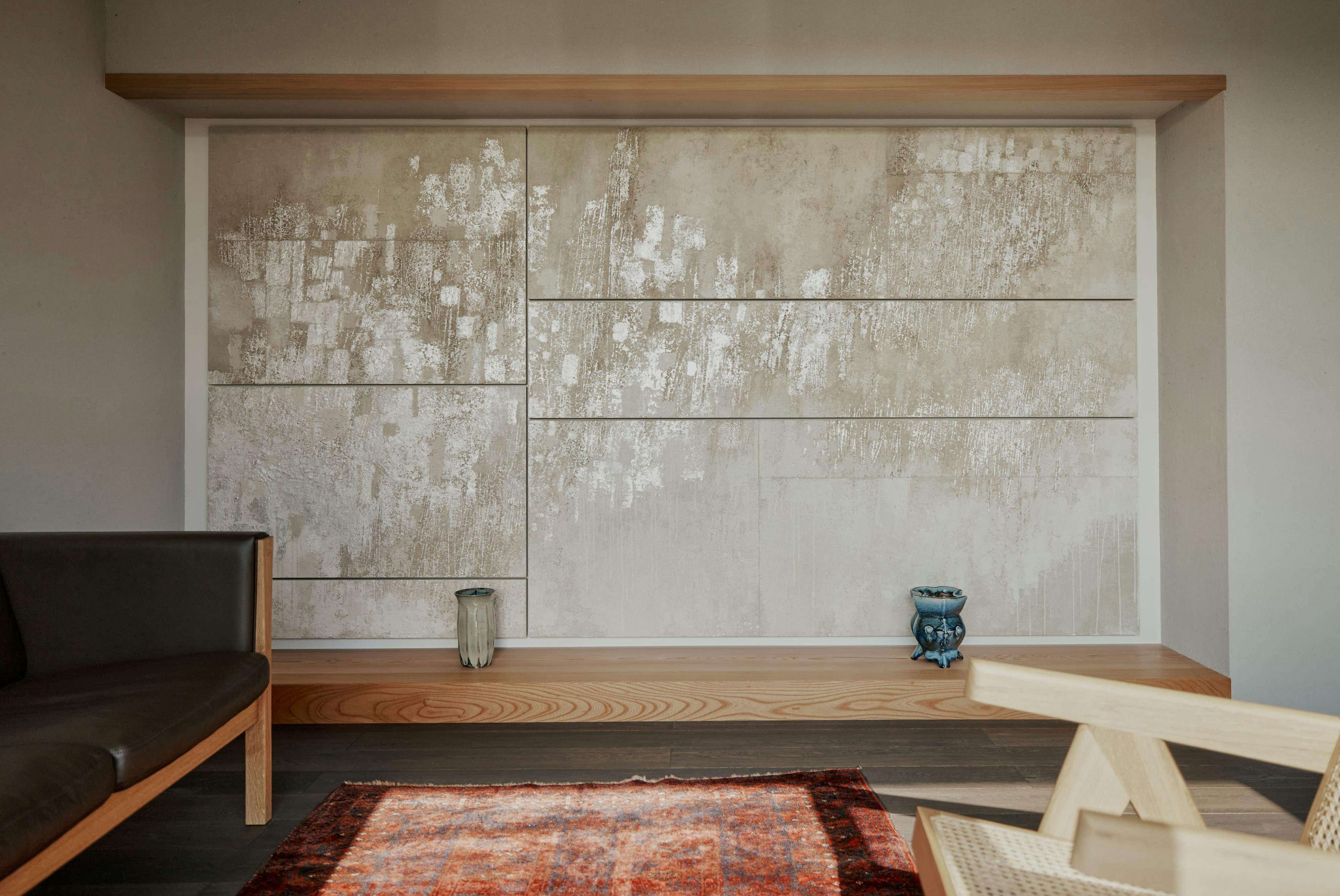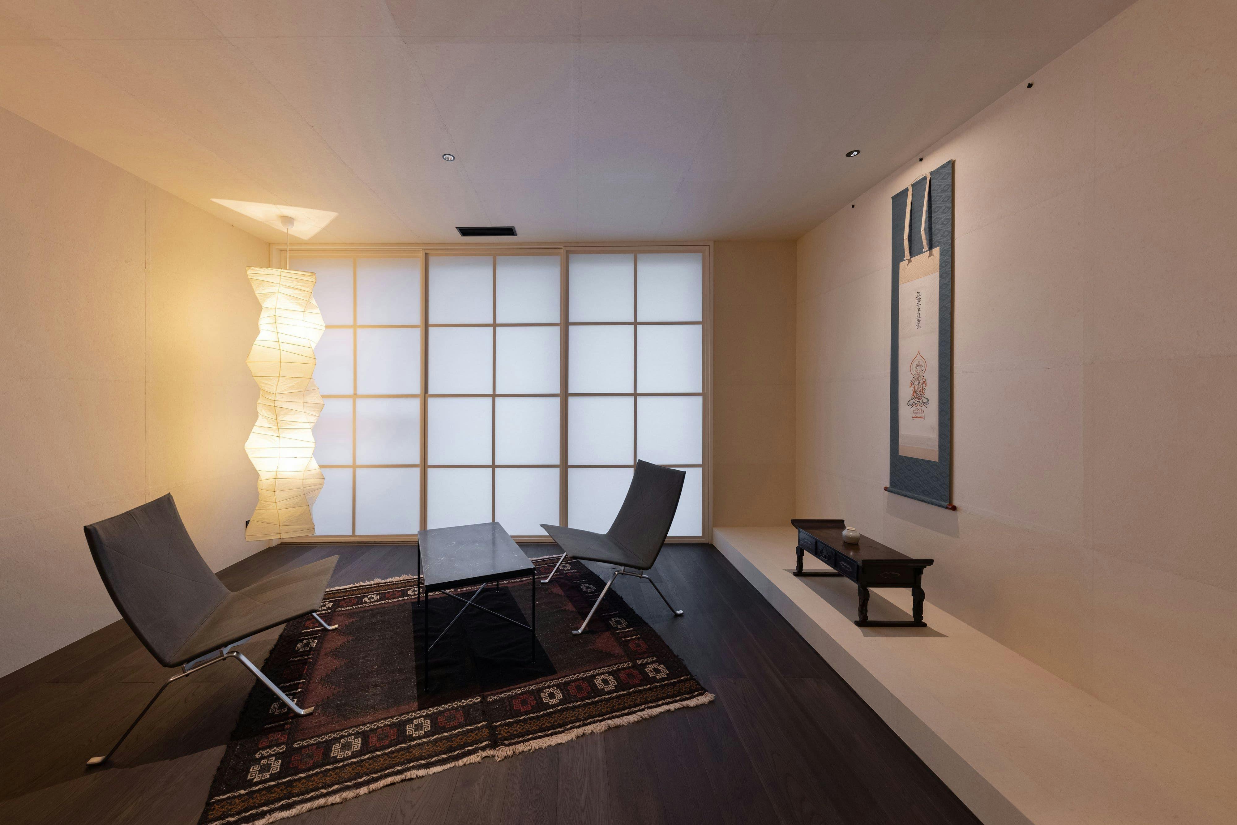 三方を水田に囲まれた築120年のアズマダチを再生した楽土庵の全3室の客室は、紙、絹、土という、それぞれ異なる自然素材が用いられています。呼吸する、自然の力が宿る素材たち。それらを使用した全3室の客室は環境と切れ目なくつながり、風景、アート、インテリアと心地よく調和します。二頭の蚕からつくられる表情豊かな「しけ絹」を壁と天井一面にぜいたくに使いました。やわらかく光を反射する空間は、繭のなかにいる心地です。