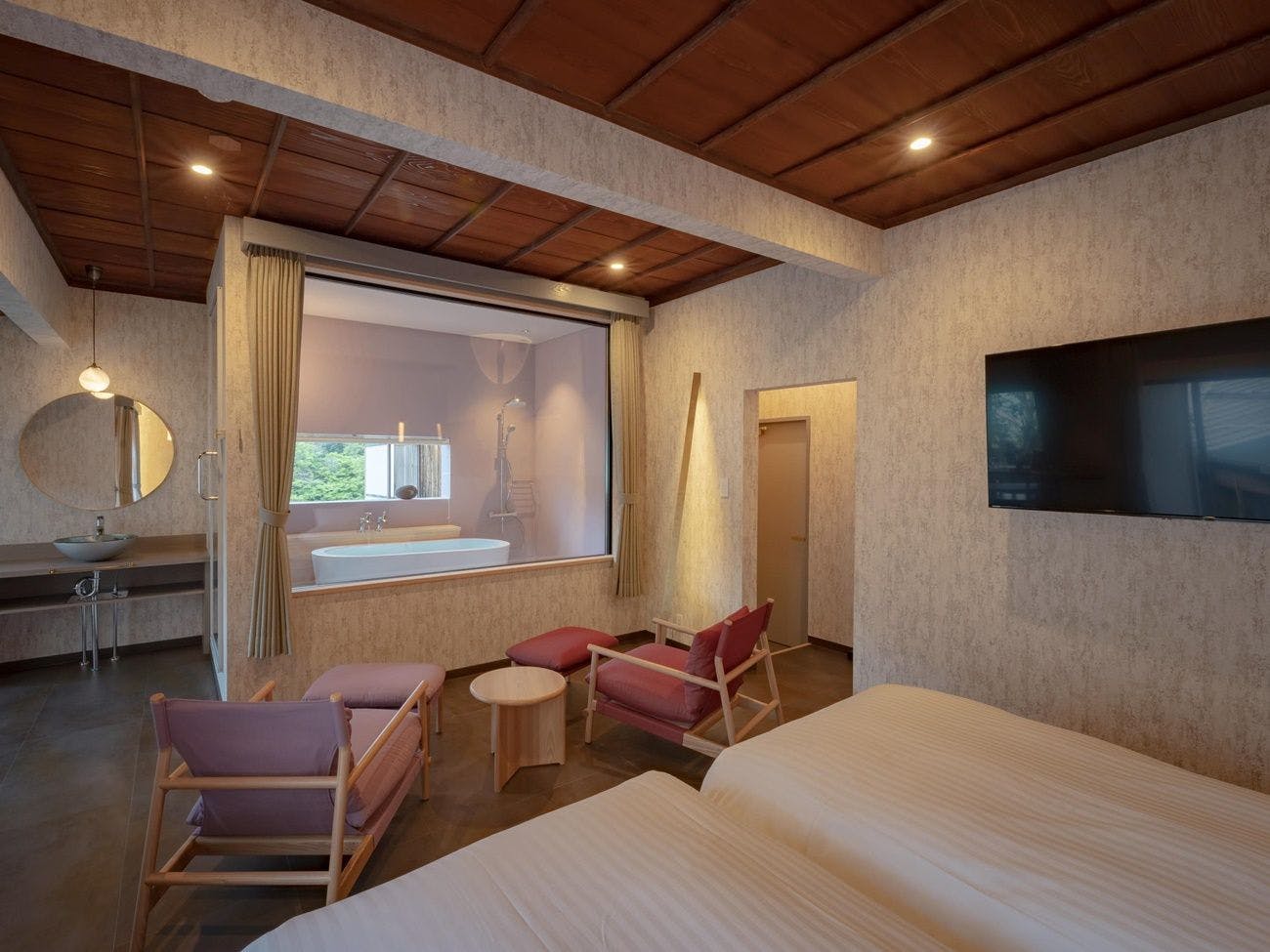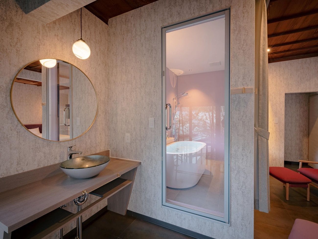 お部屋とお風呂がガラスで仕切っており開放感がある空間のお部屋です。