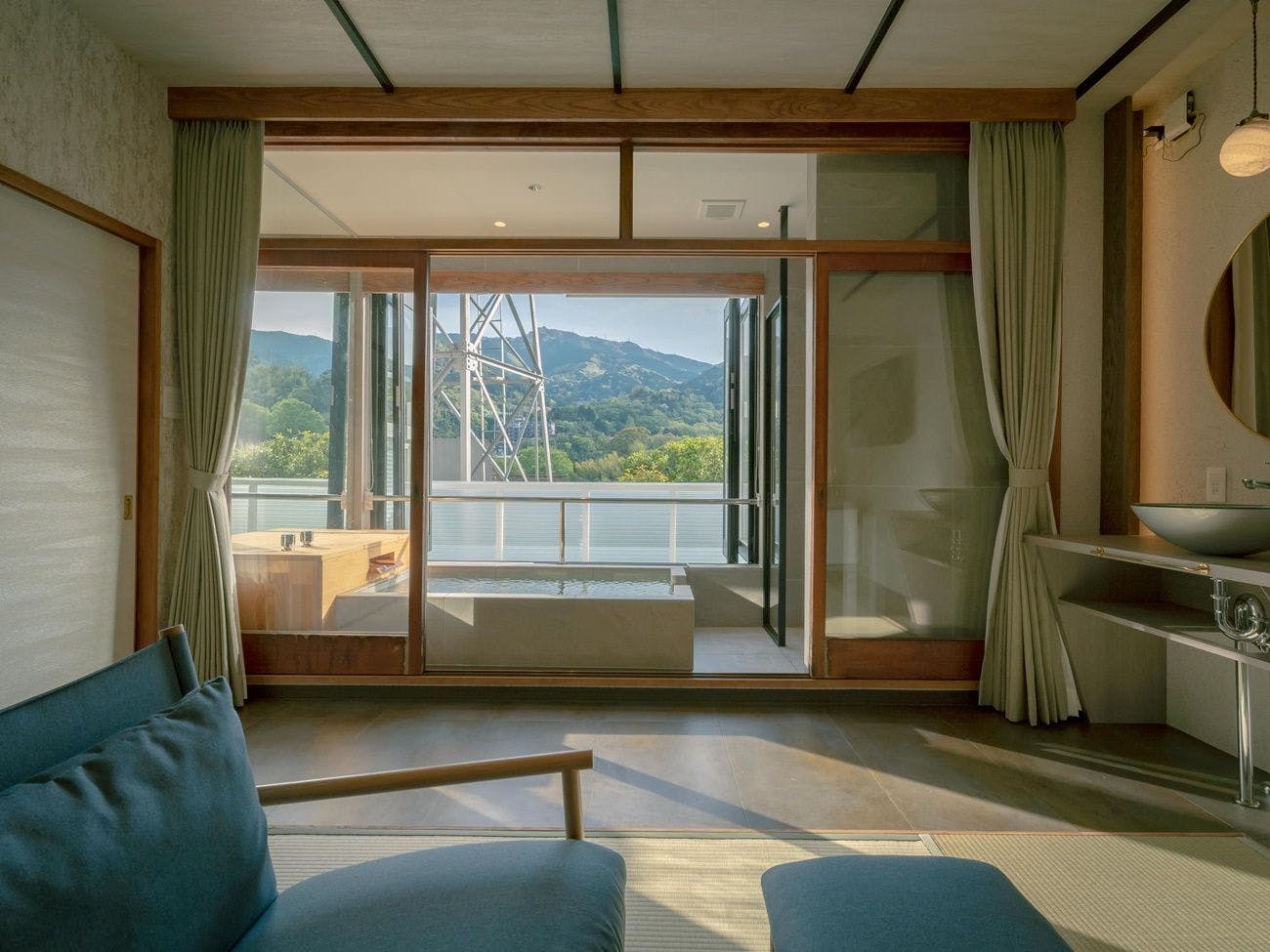 このお部屋は、半露天風呂付のオープンエアな眺望豊かなお部屋です。