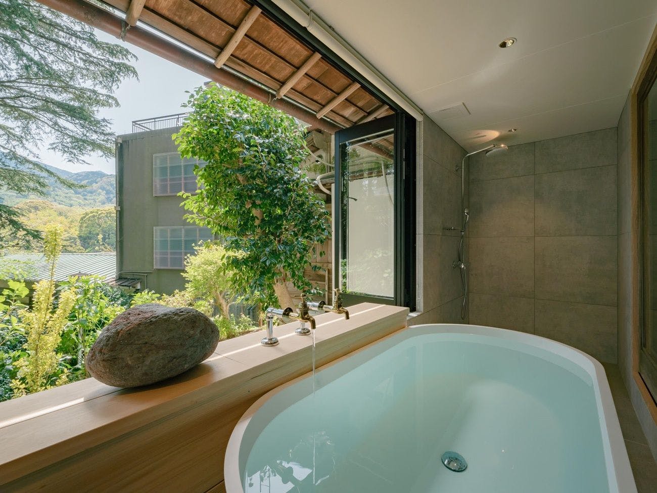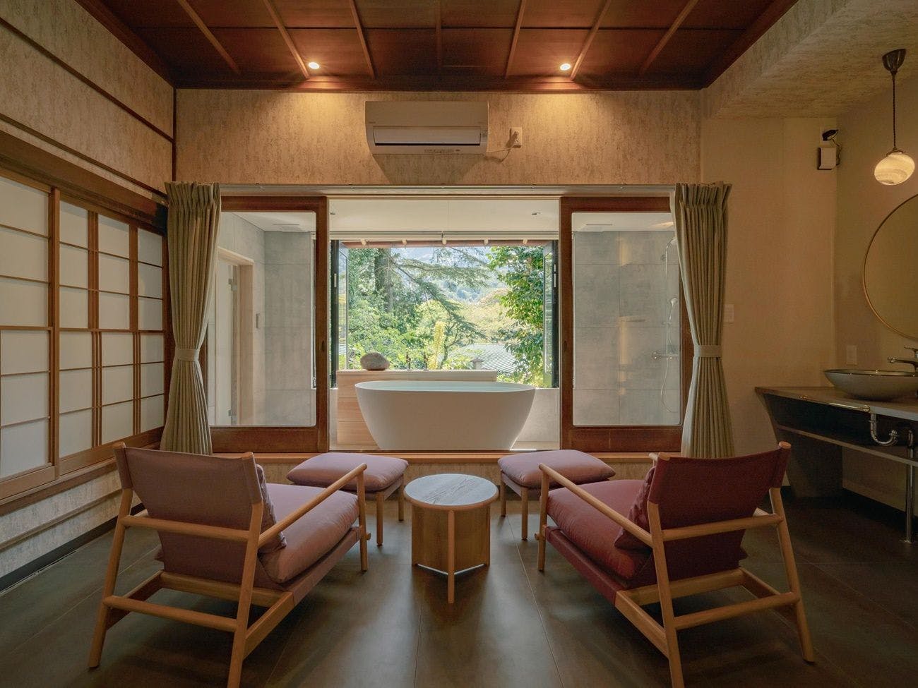 内風呂からは、庭と山の四季の景色を眺めることができます。