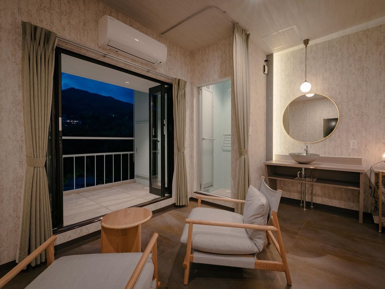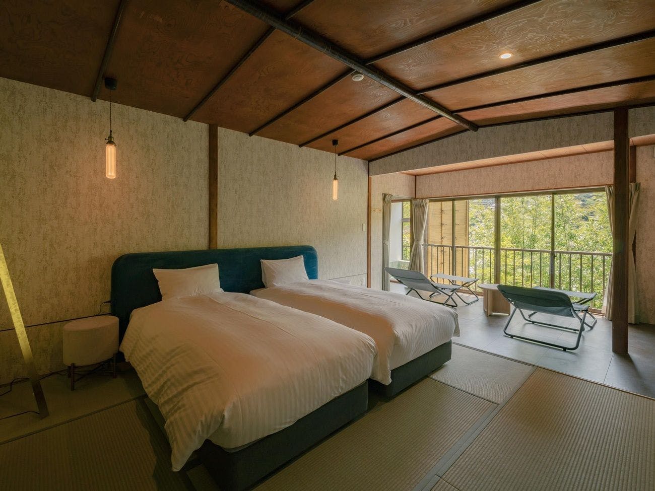1階は緑豊かな庭、2階は山の風景しか見えないことが極上空間を演出します。