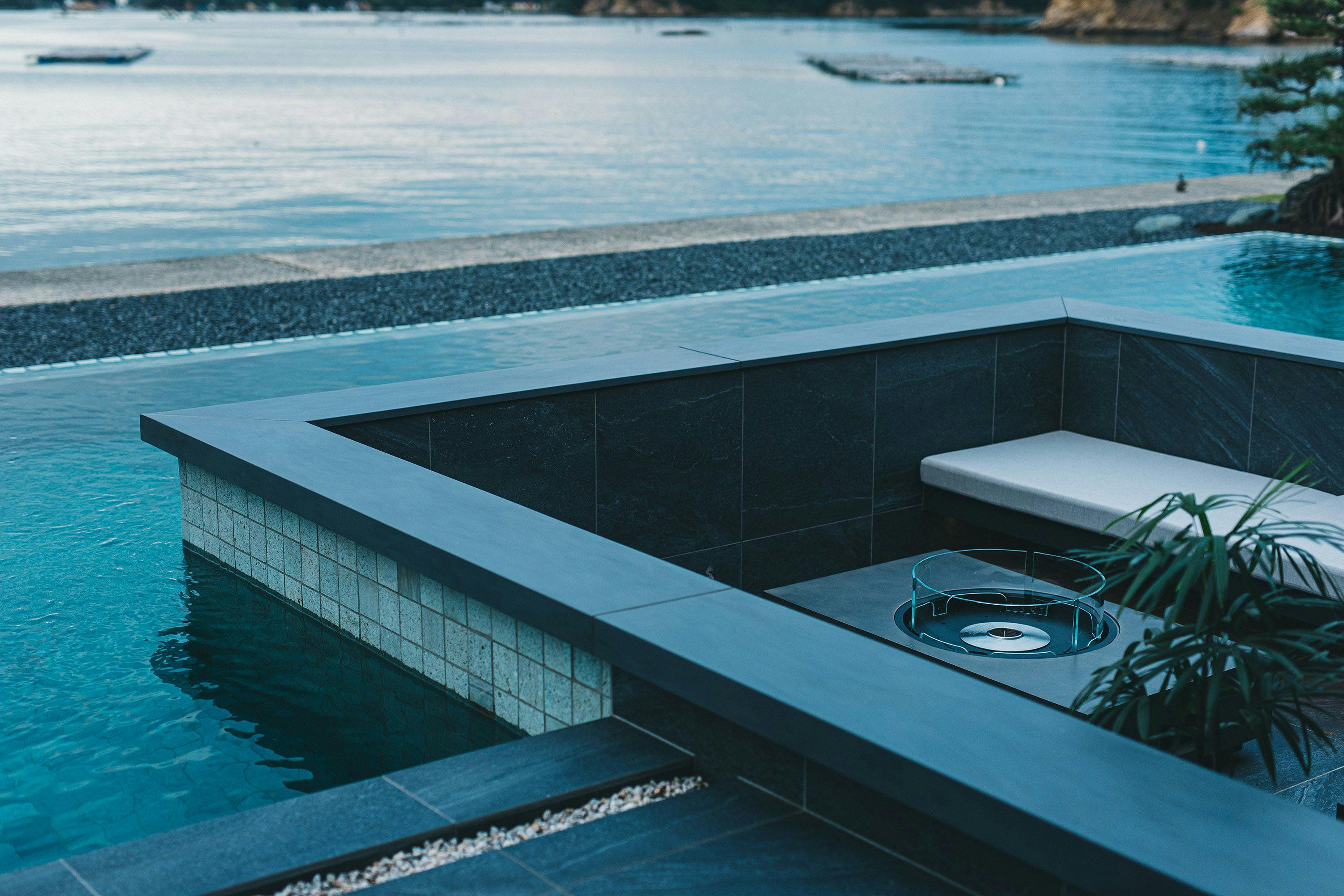 リビングダイニングキッチンを中心に、2ベッドルームと2バスルームを配置。2組のファミリーやカップルのご旅行に最適です。※7名以上はご相談ください。その他、露天風呂・プール・サウナも完備。屋外テラススペース183平米。室内禁煙のため、喫煙の際はテラススペースをご利用ください。