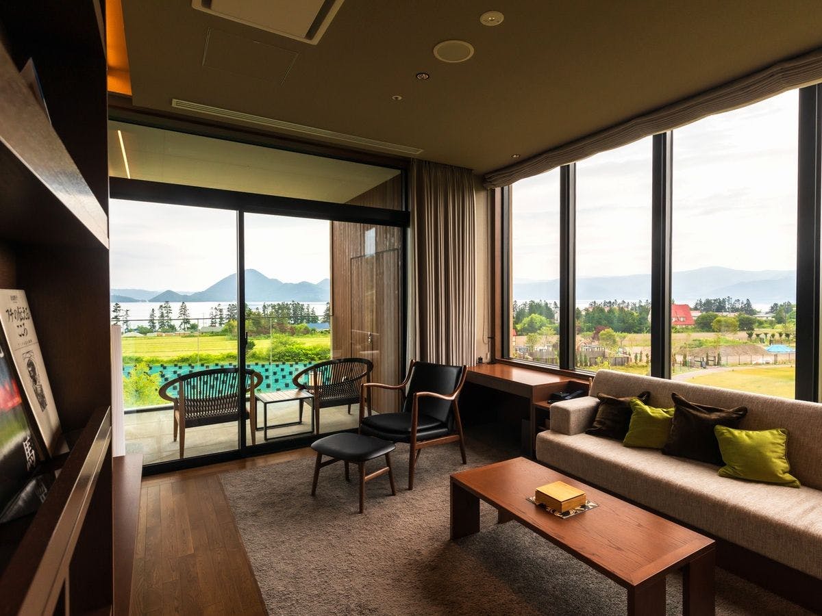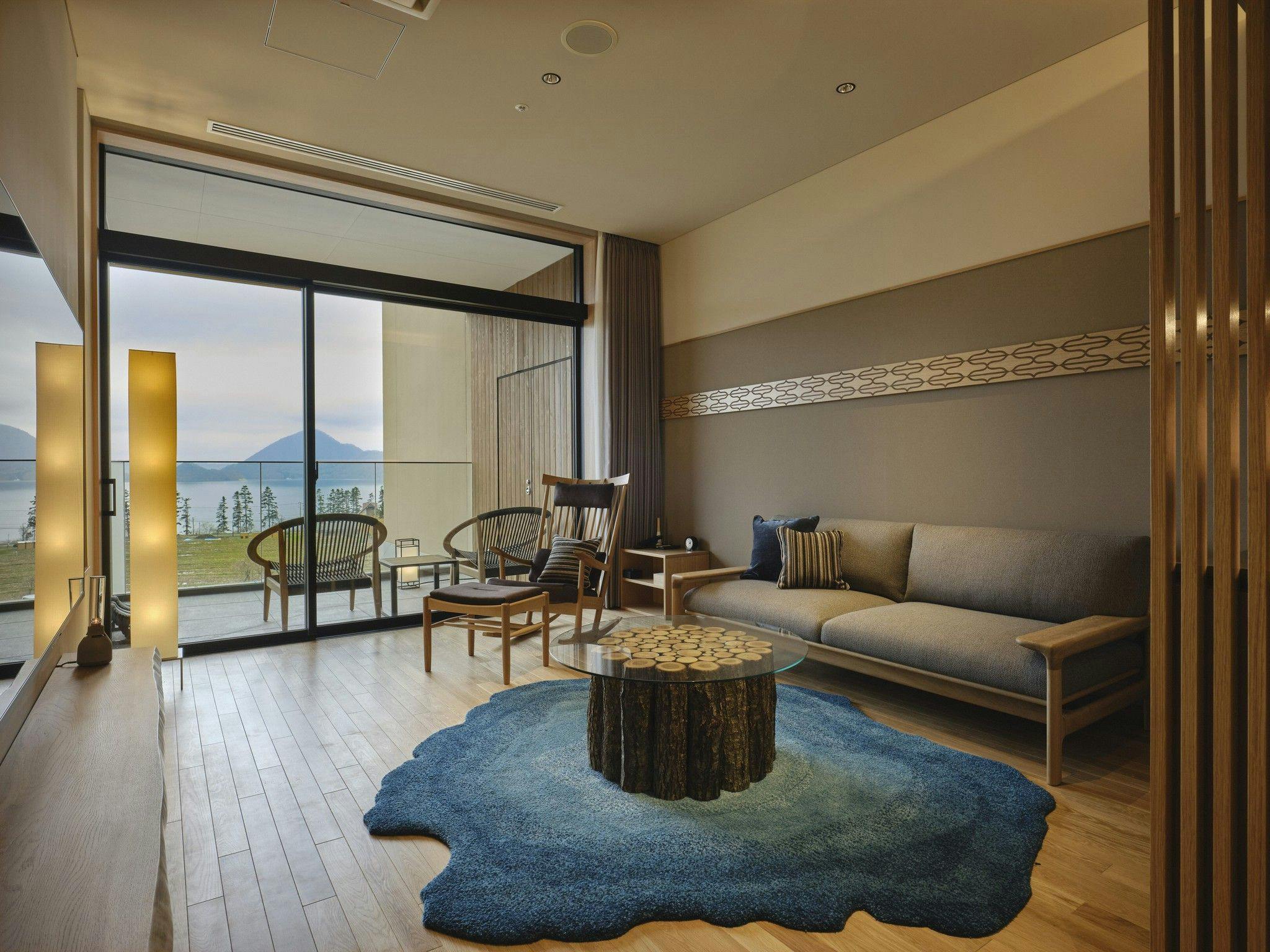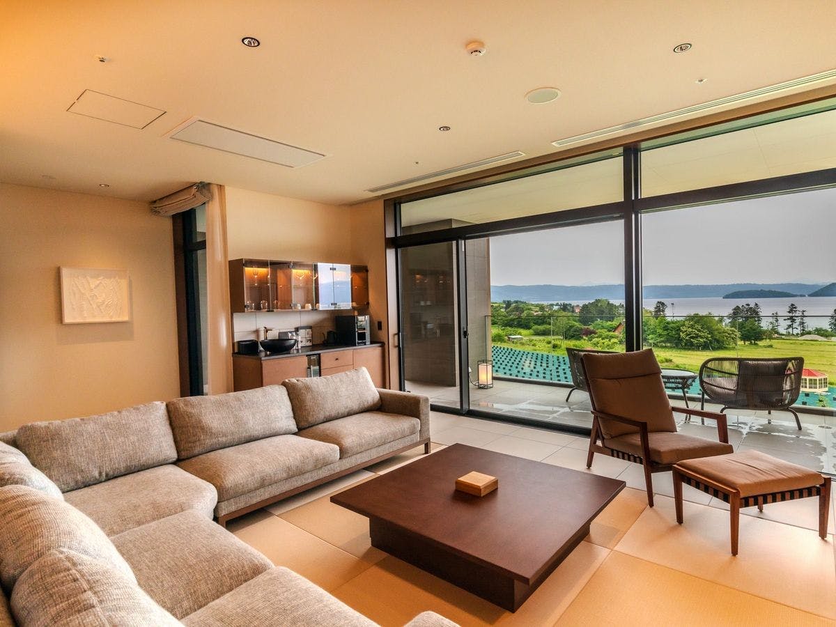 洞爺湖をテラス越しに望む、122平米の広々としたお部屋です。