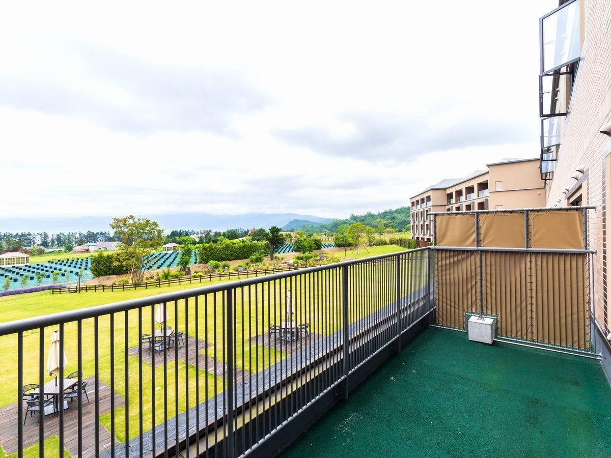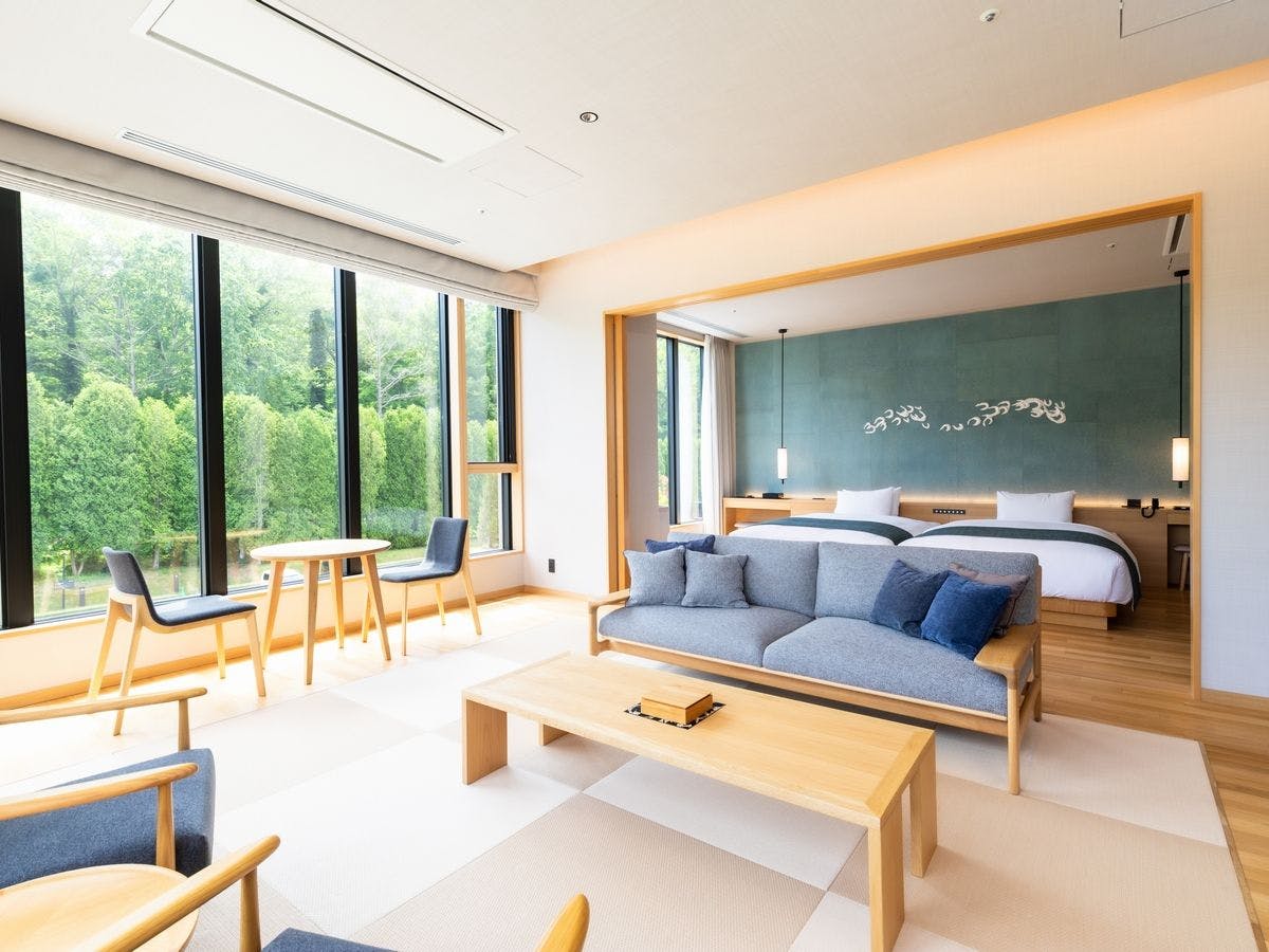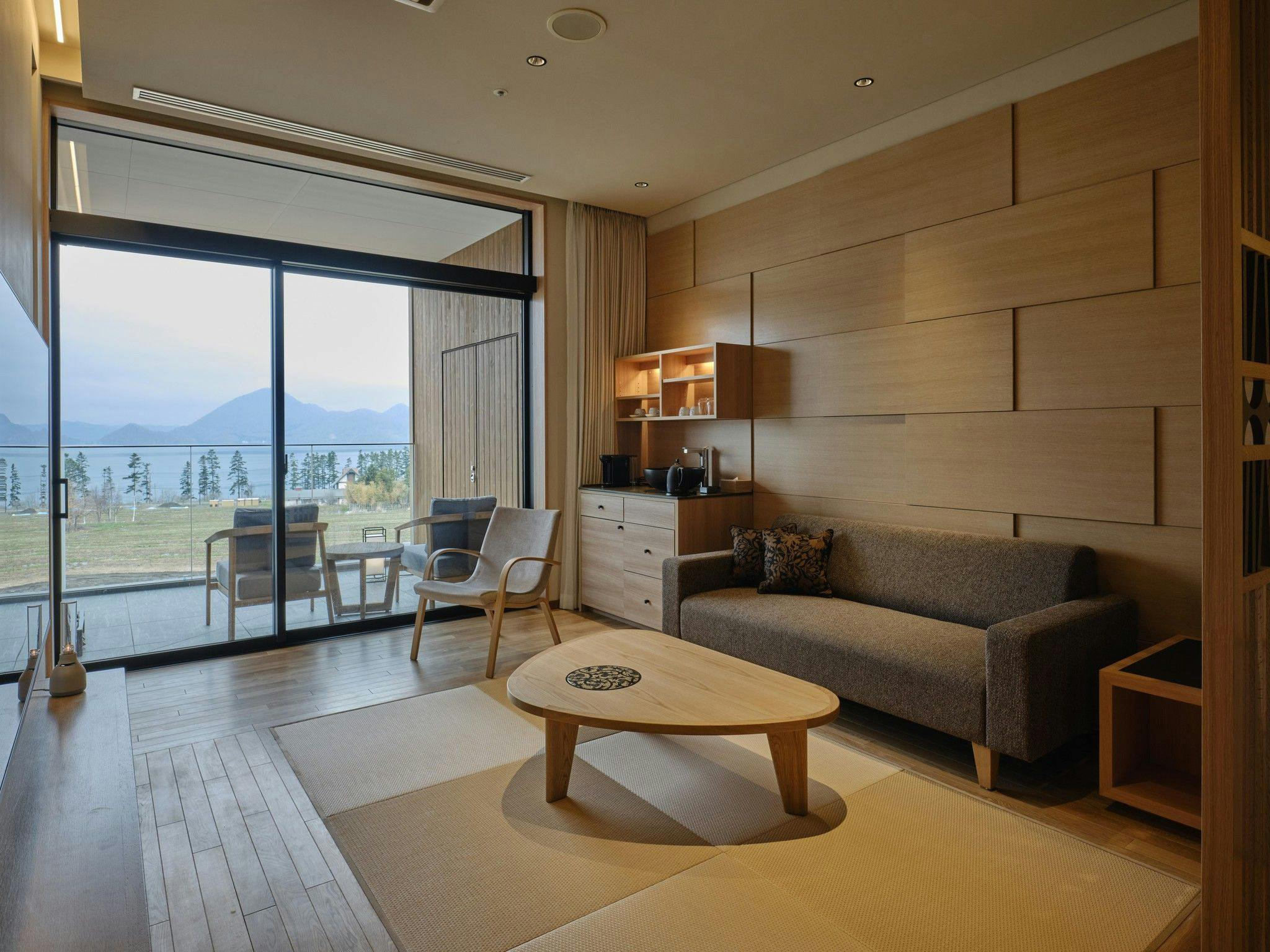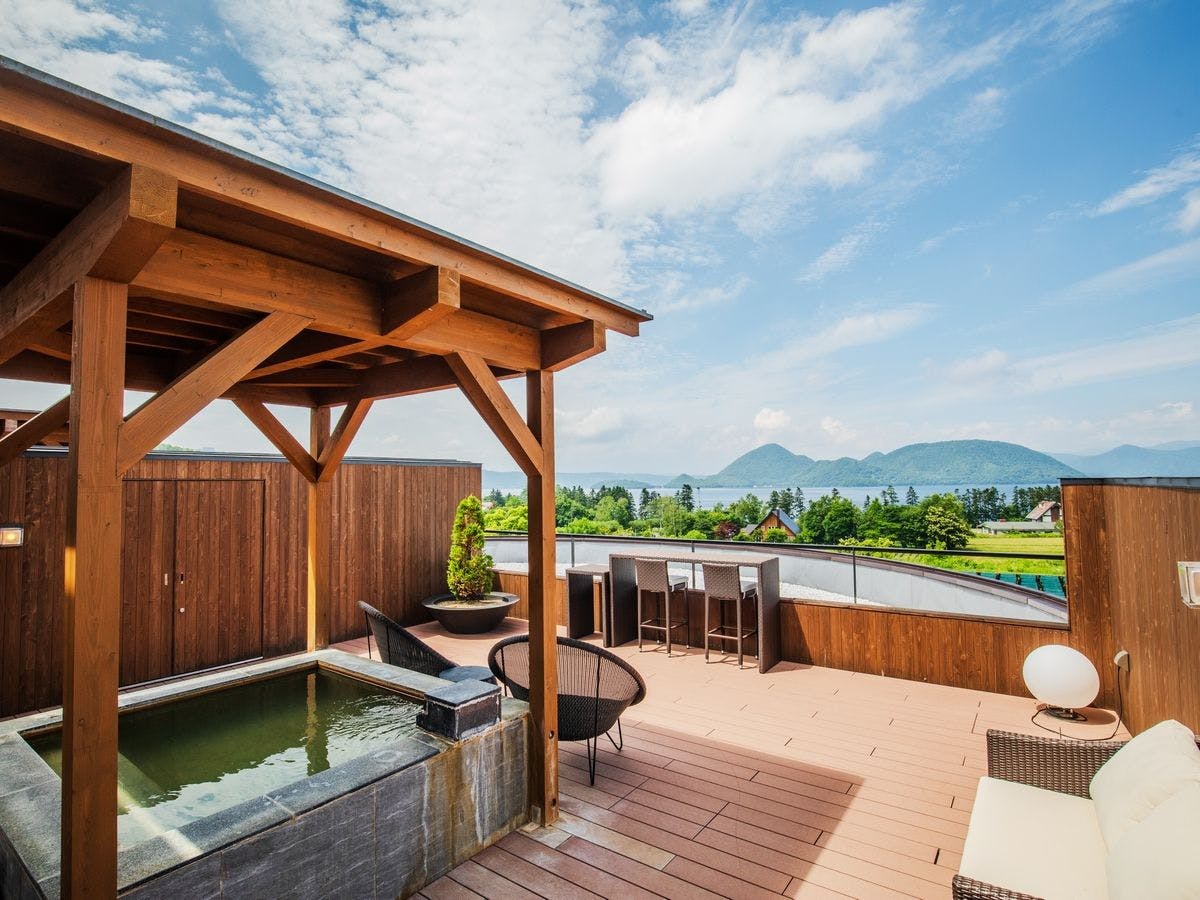 洞爺湖をテラス越しに望む、122平米の広々としたお部屋です。