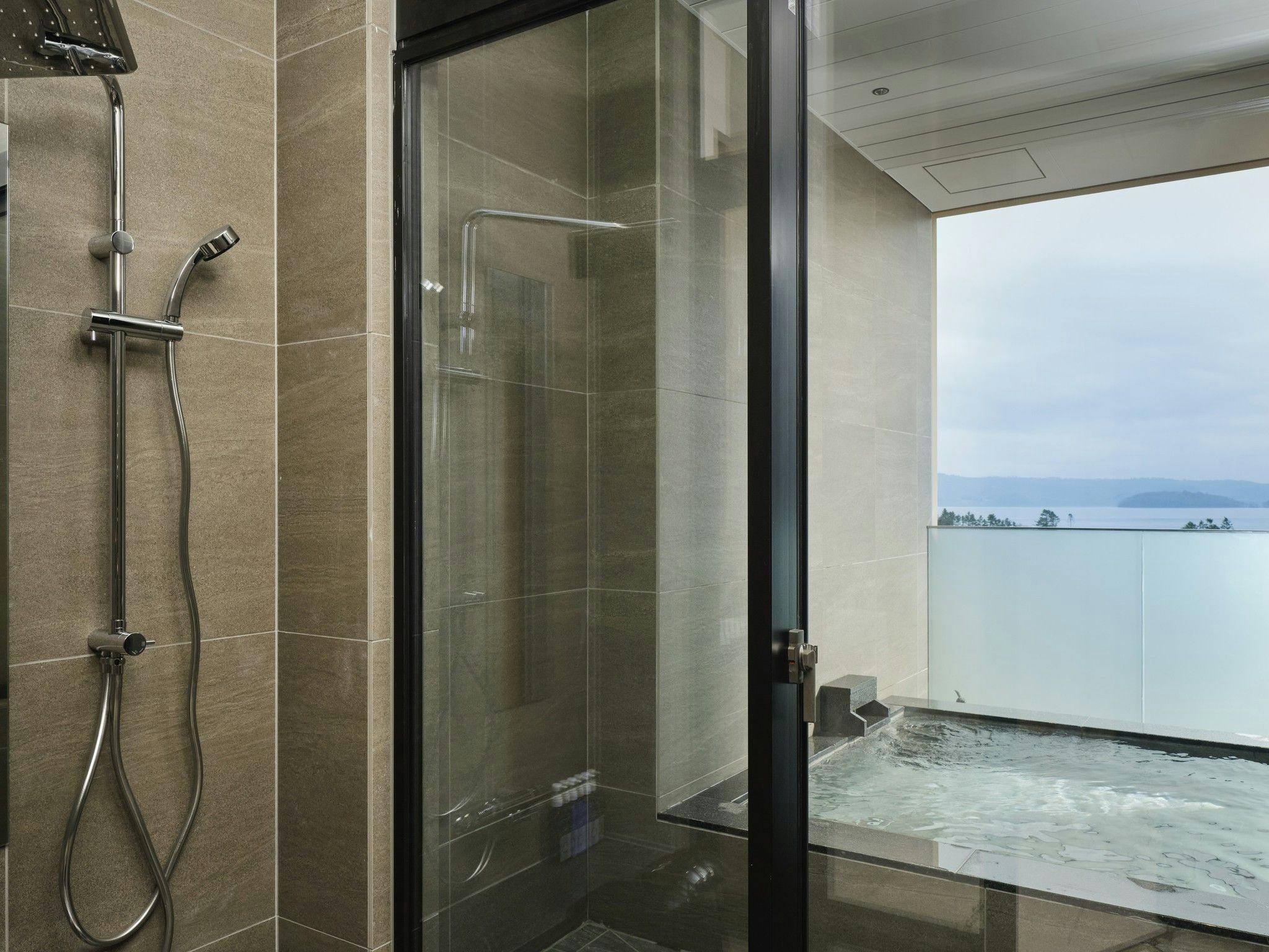 洞爺湖を望む、48平米の温泉露天風呂付き和洋室。
