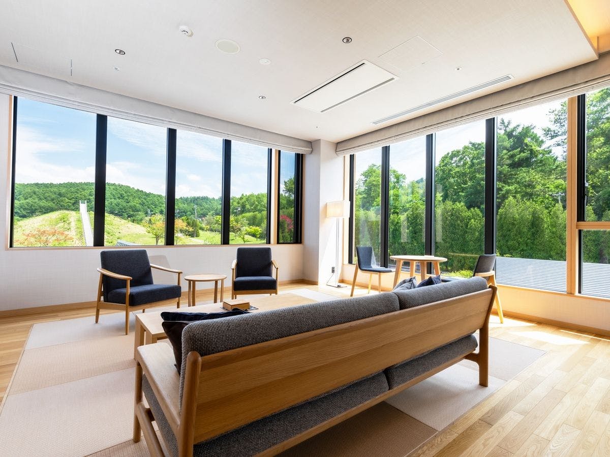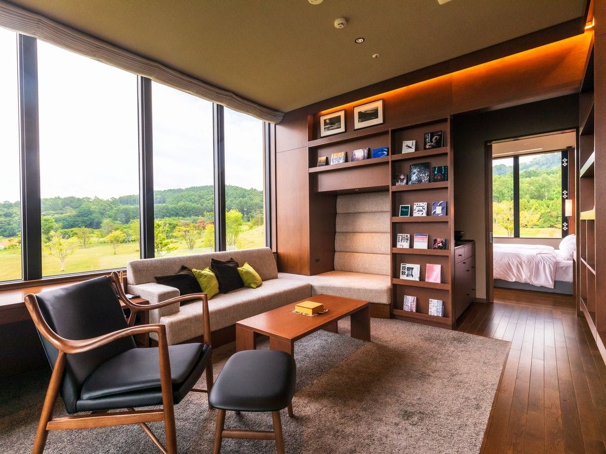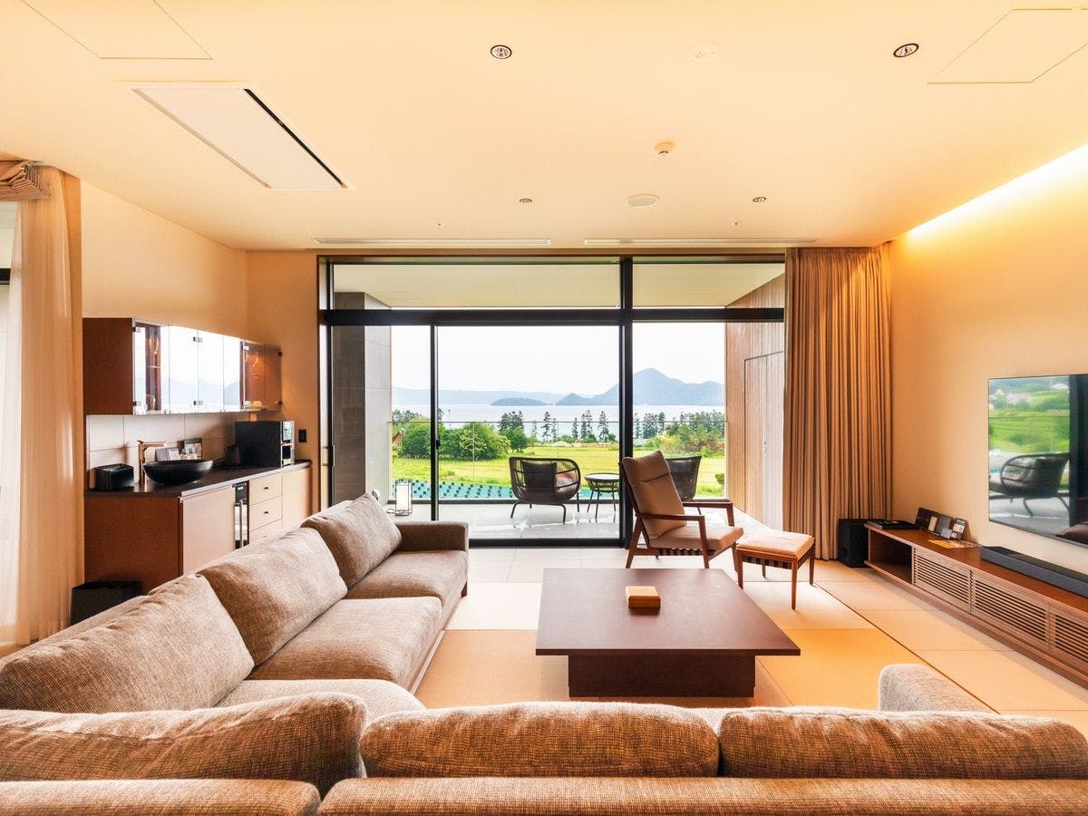 温泉露天風呂を備え、室内にはアルフレックス社の最上級ソファをご用意。
