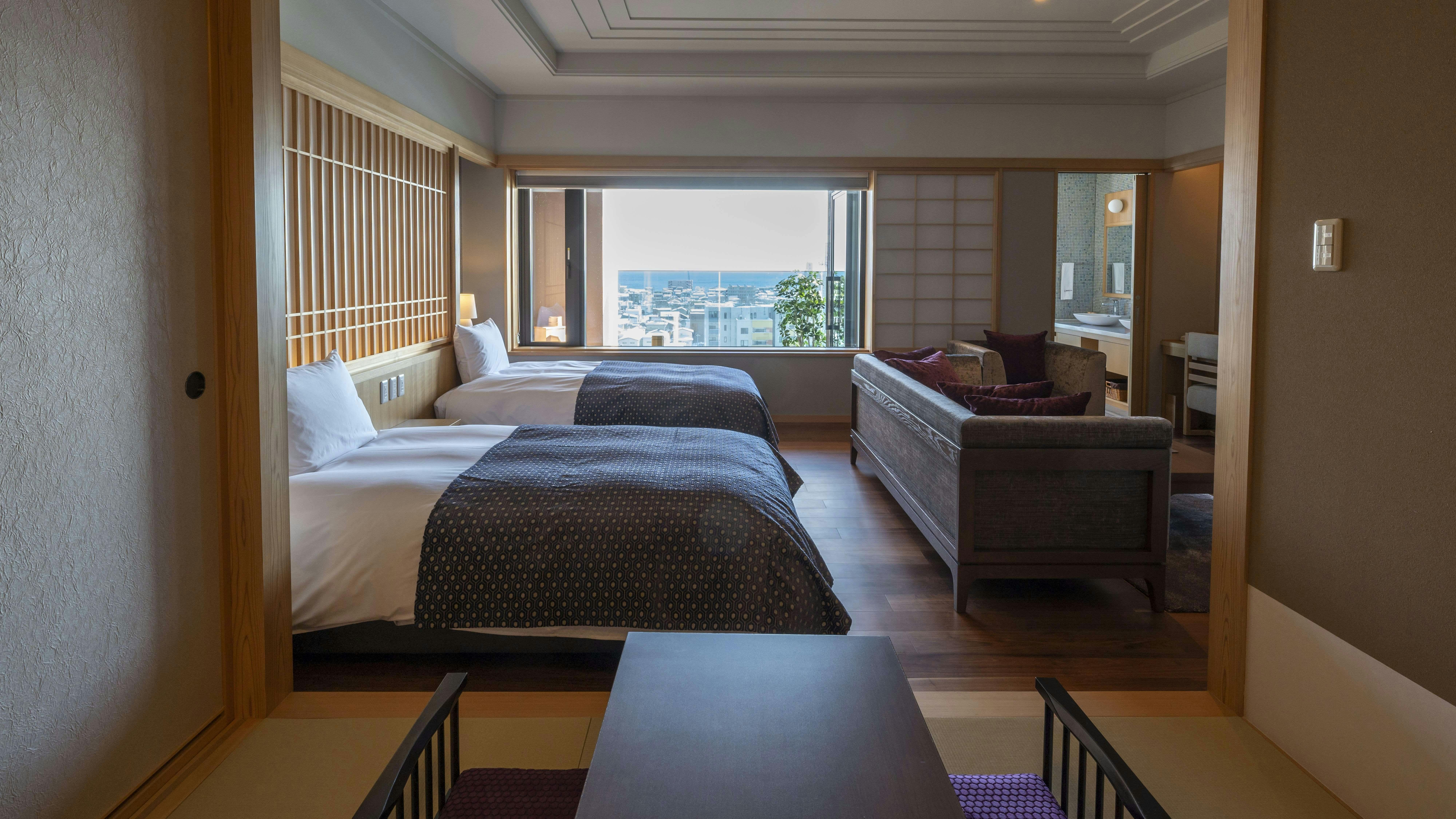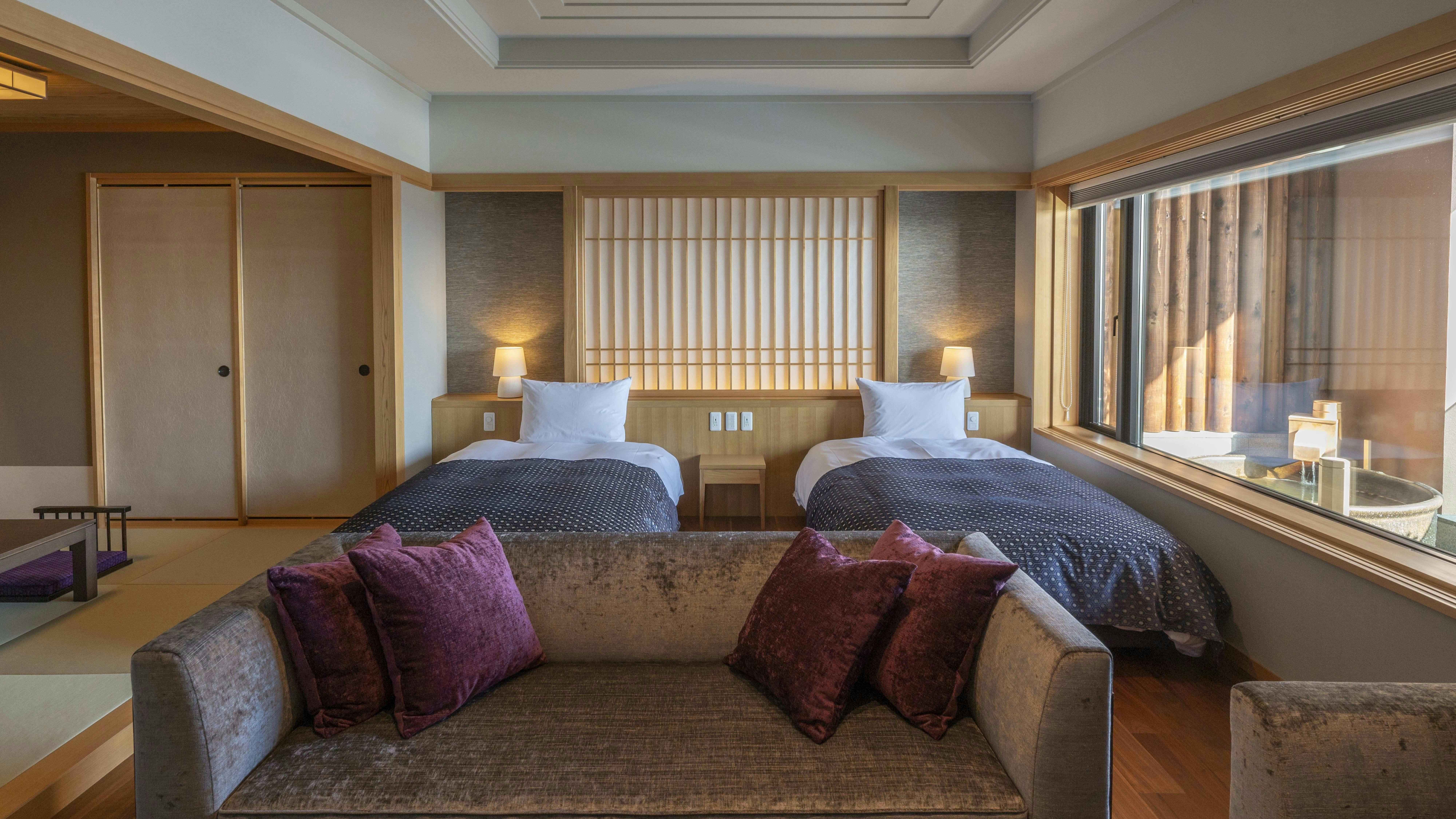 当館の中で一番広々とした59平米のお部屋に、セミダブルベッドを2台配した洋室と4畳半の畳スペースをご用意しております。