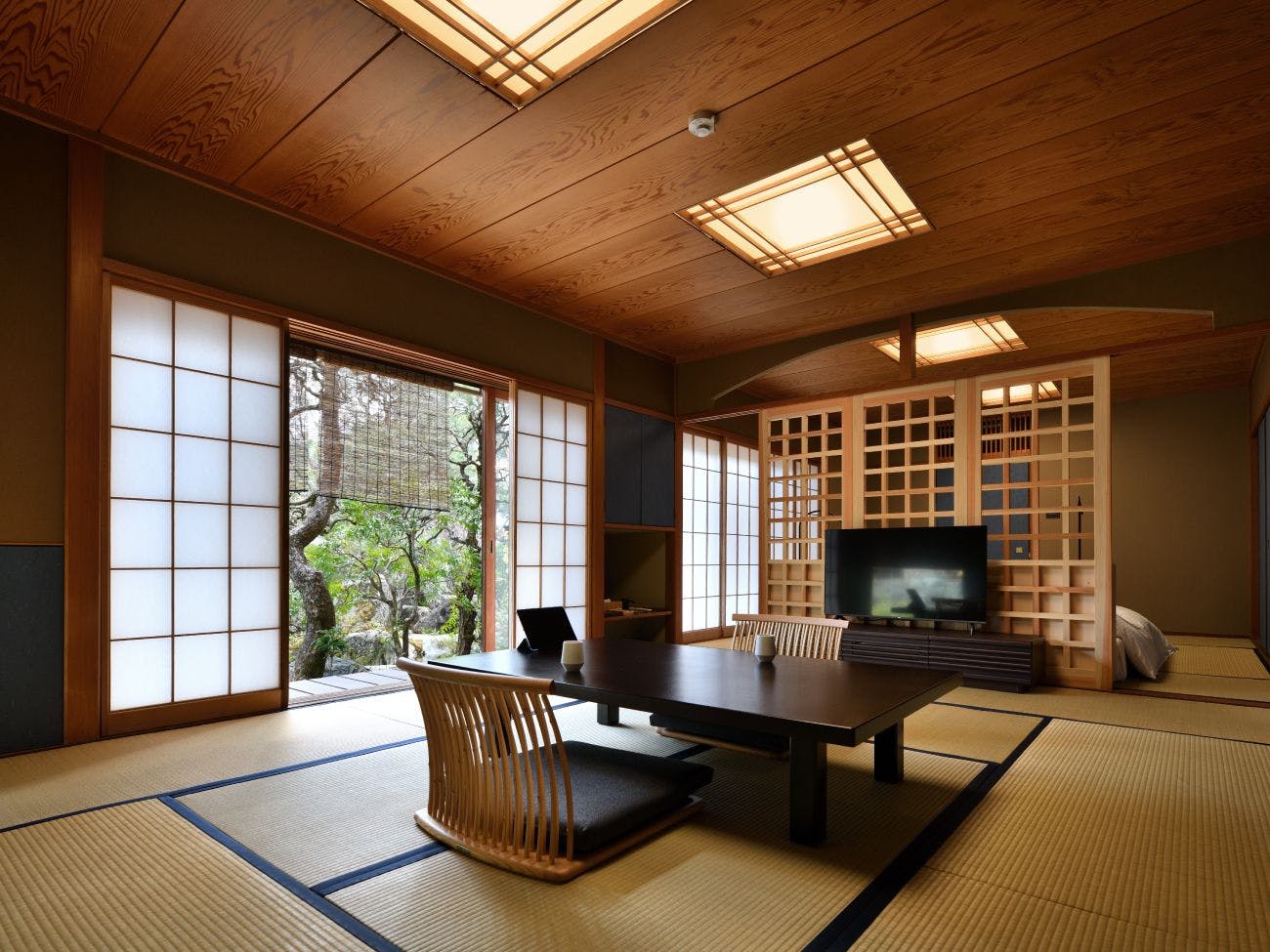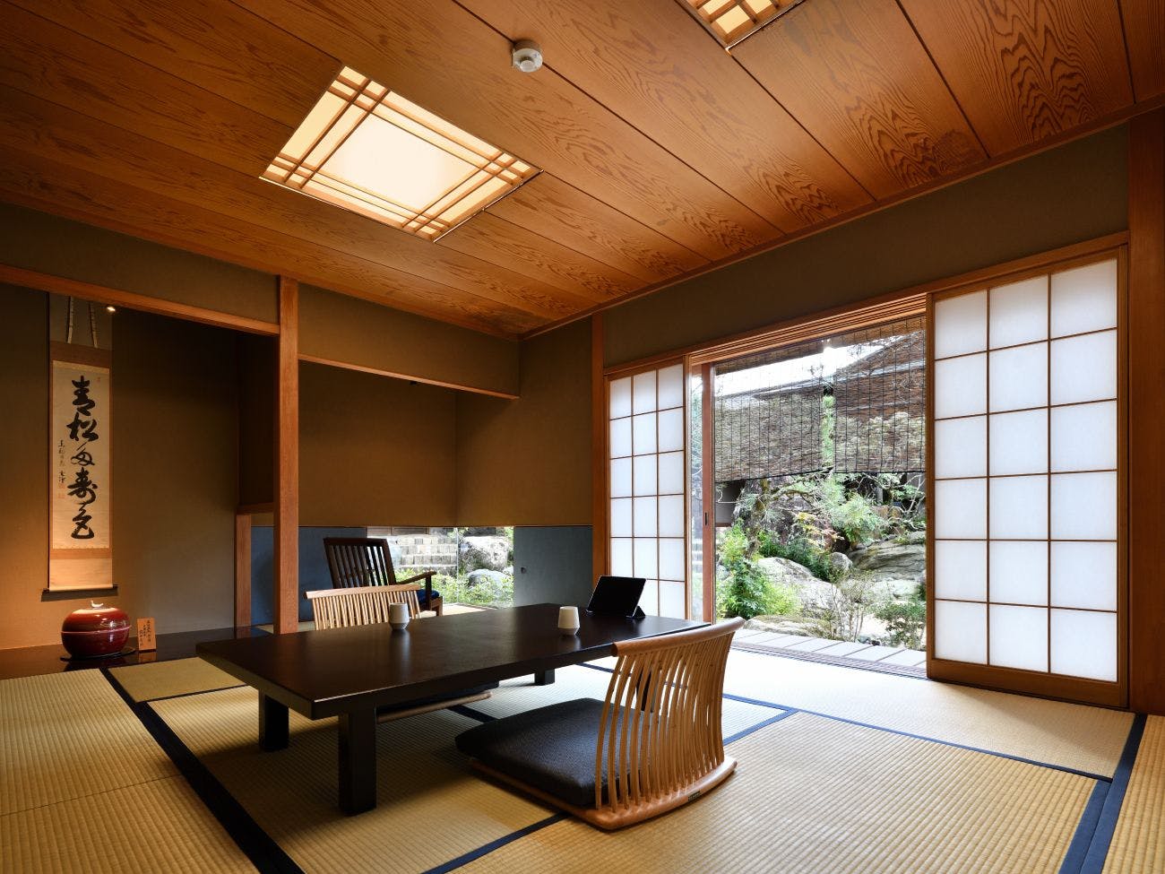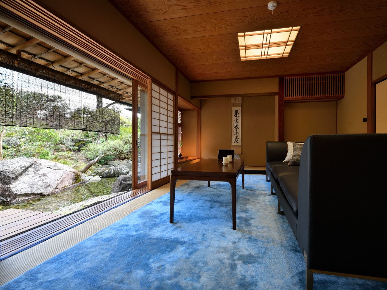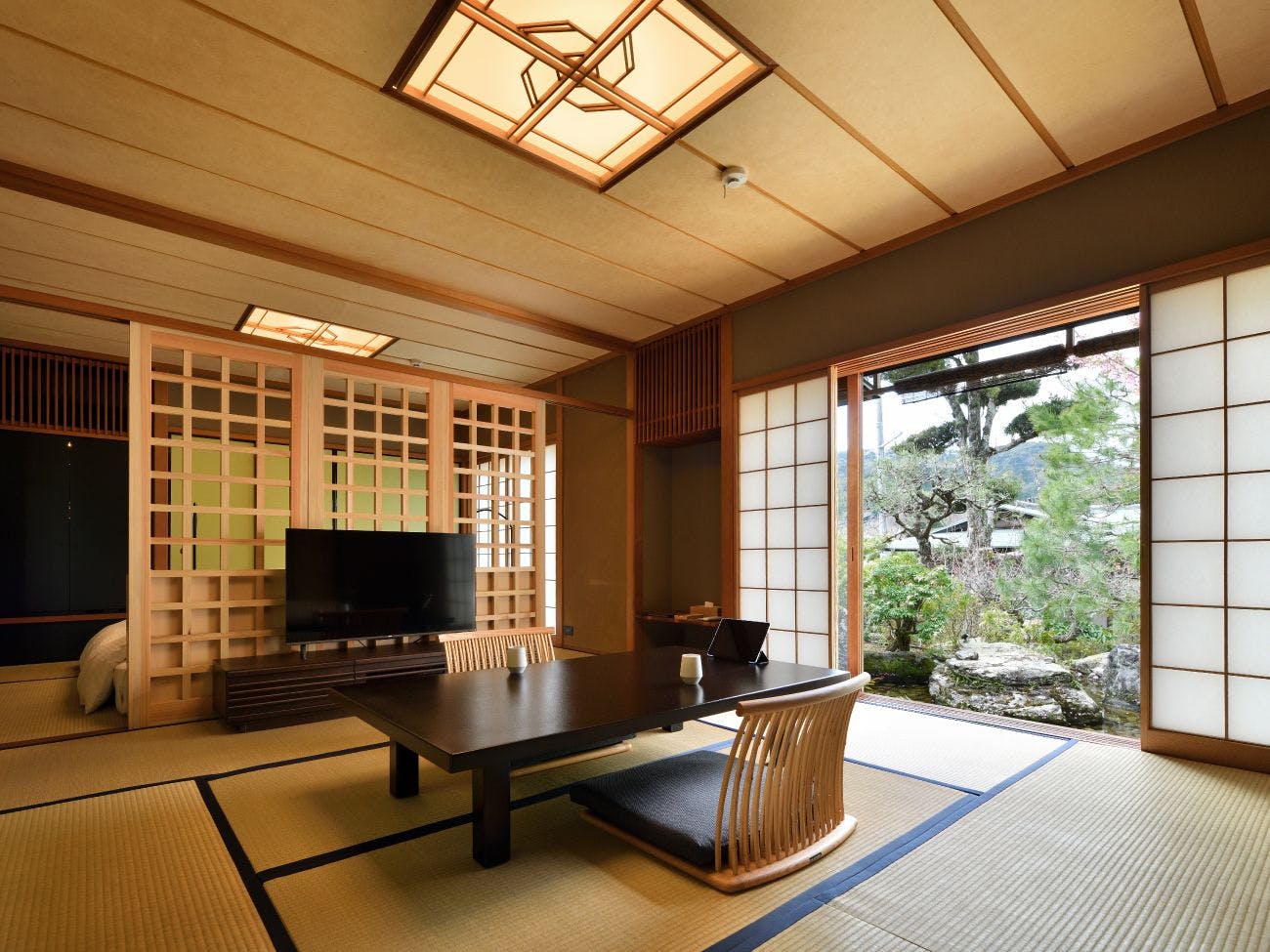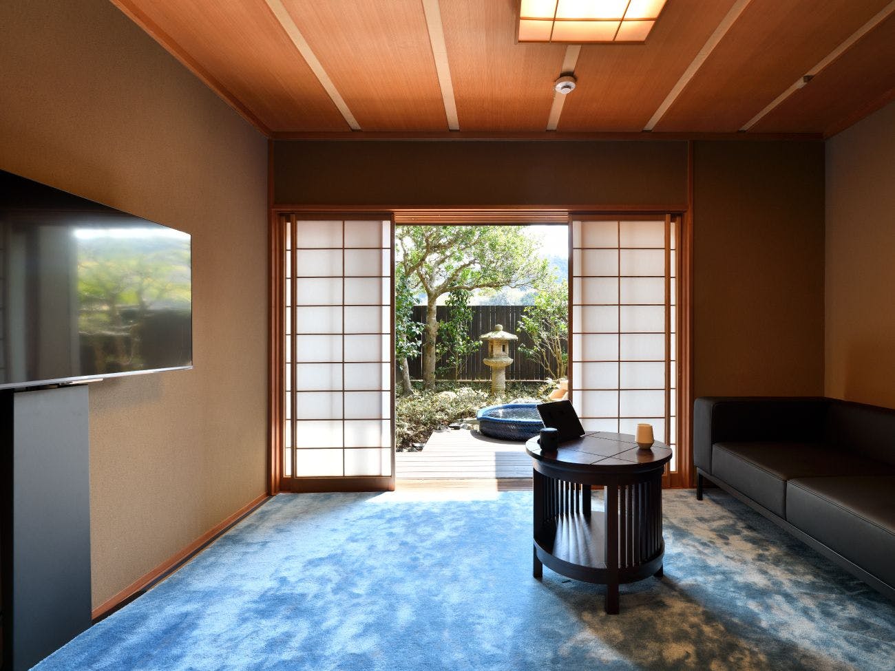 坪庭を眺める小上がりの8畳間と寝室風情漂う坪庭を心穏やかに眺めていただける、伝統的な畳の和室と畳の感触が素足に心地よい和のベッドルーム。和室と寝室は、特徴的な開口を持つ壁でもつながります。モダンな設えの露天風呂では、坪庭の木々を愛でながら名湯「修善寺温泉の湯」を心ゆくまでお楽しみください。※お部屋の中にテレビはございません。貸出用テレビがご必要な方は、フロントまでお申し付けください。※喫煙は所定の喫煙所にてお願いいたします。