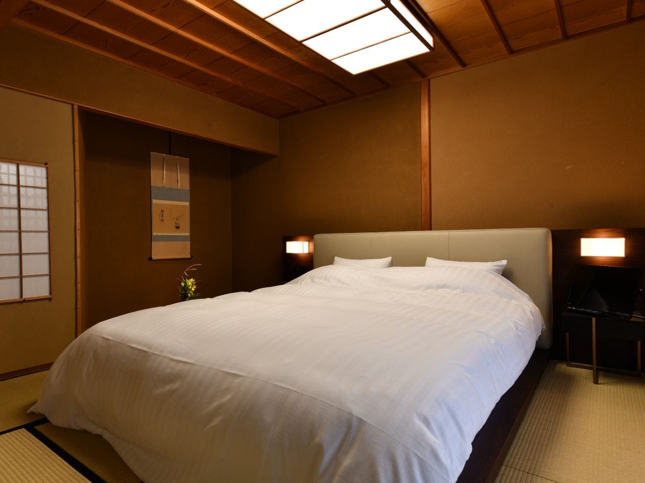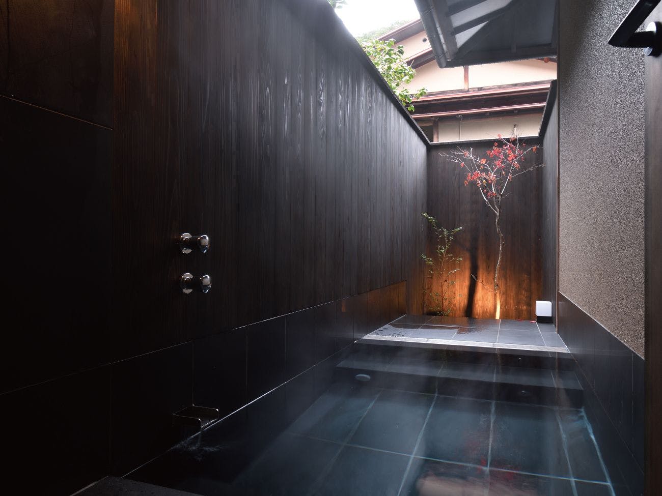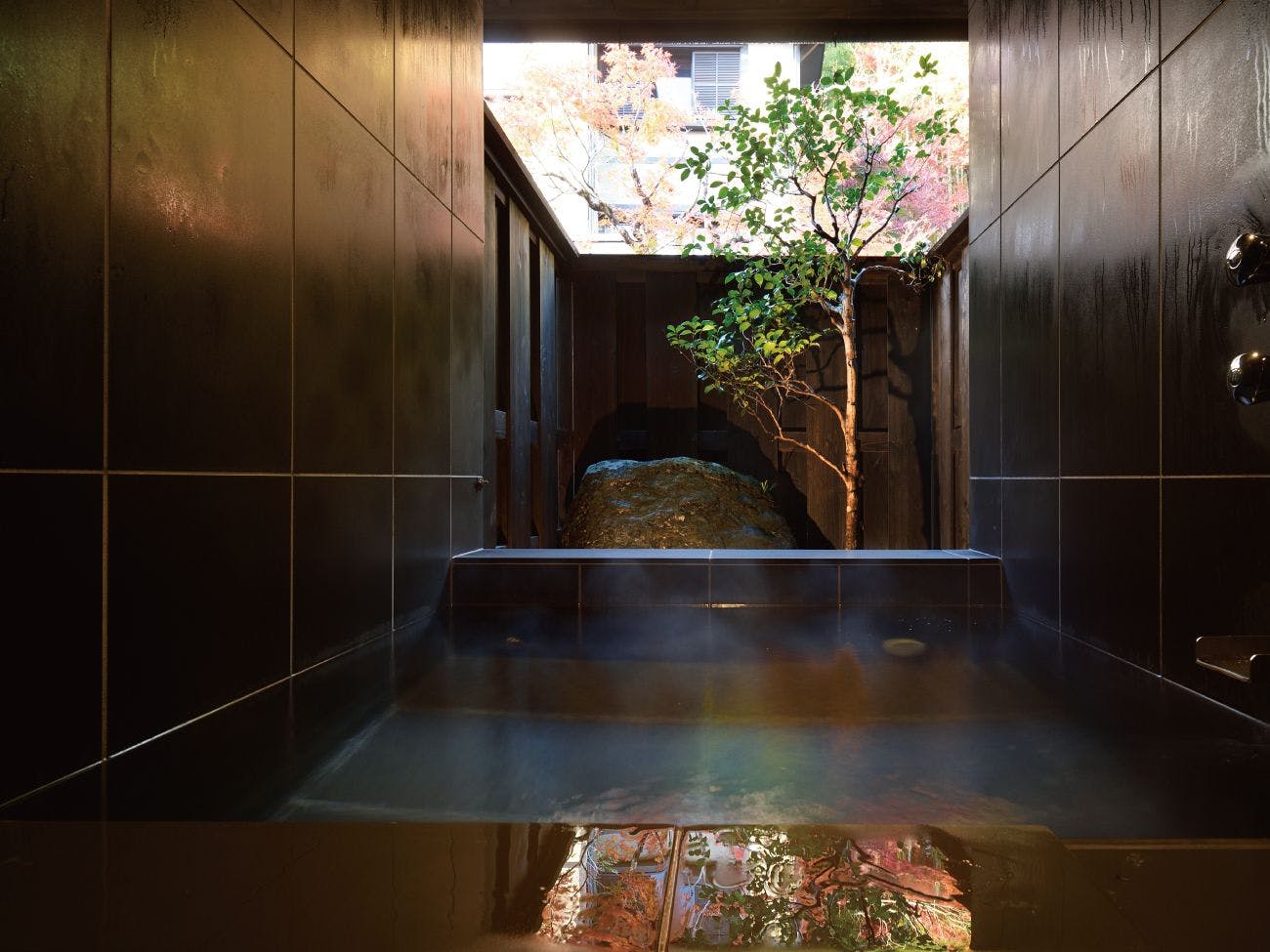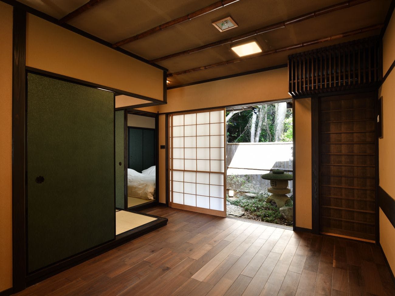 坪庭を眺める小上がりの8畳間と寝室風情漂う坪庭を心穏やかに眺めていただける、伝統的な畳の和室と畳の感触が素足に心地よい和のベッドルーム。和室と寝室は、特徴的な開口を持つ壁でもつながります。モダンな設えの露天風呂では、坪庭の木々を愛でながら名湯「修善寺温泉の湯」を心ゆくまでお楽しみください。※お部屋の中にテレビはございません。貸出用テレビがご必要な方は、フロントまでお申し付けください。※喫煙は所定の喫煙所にてお願いいたします。