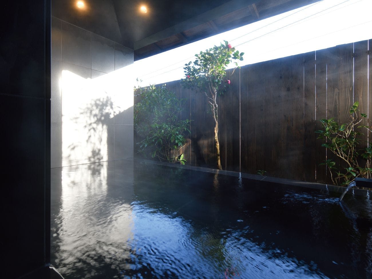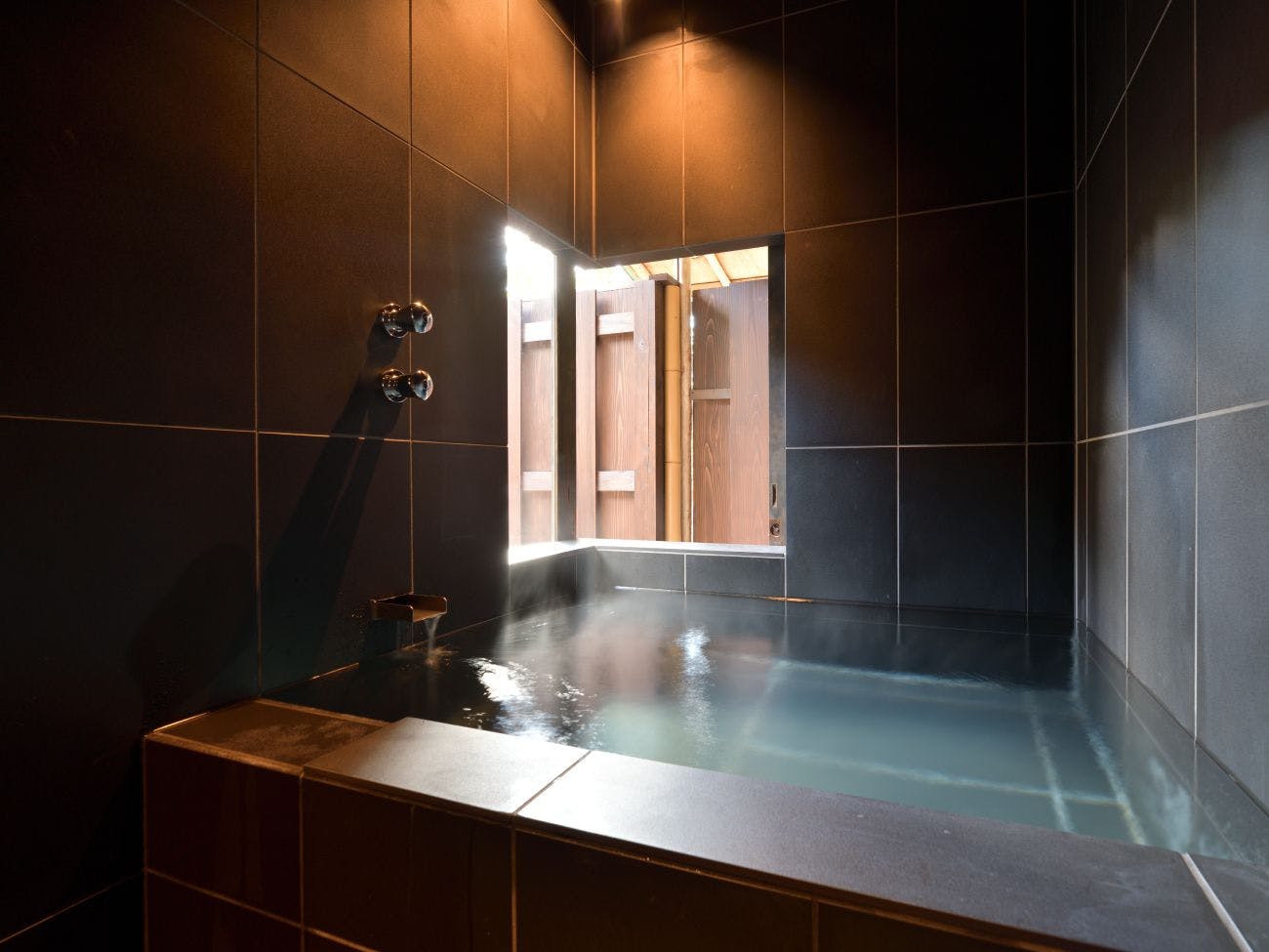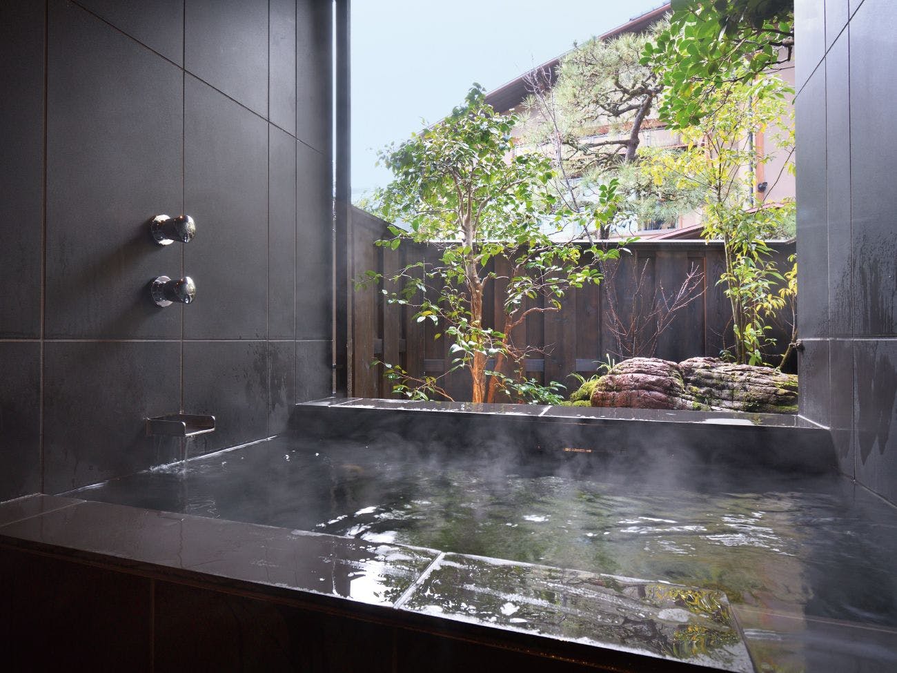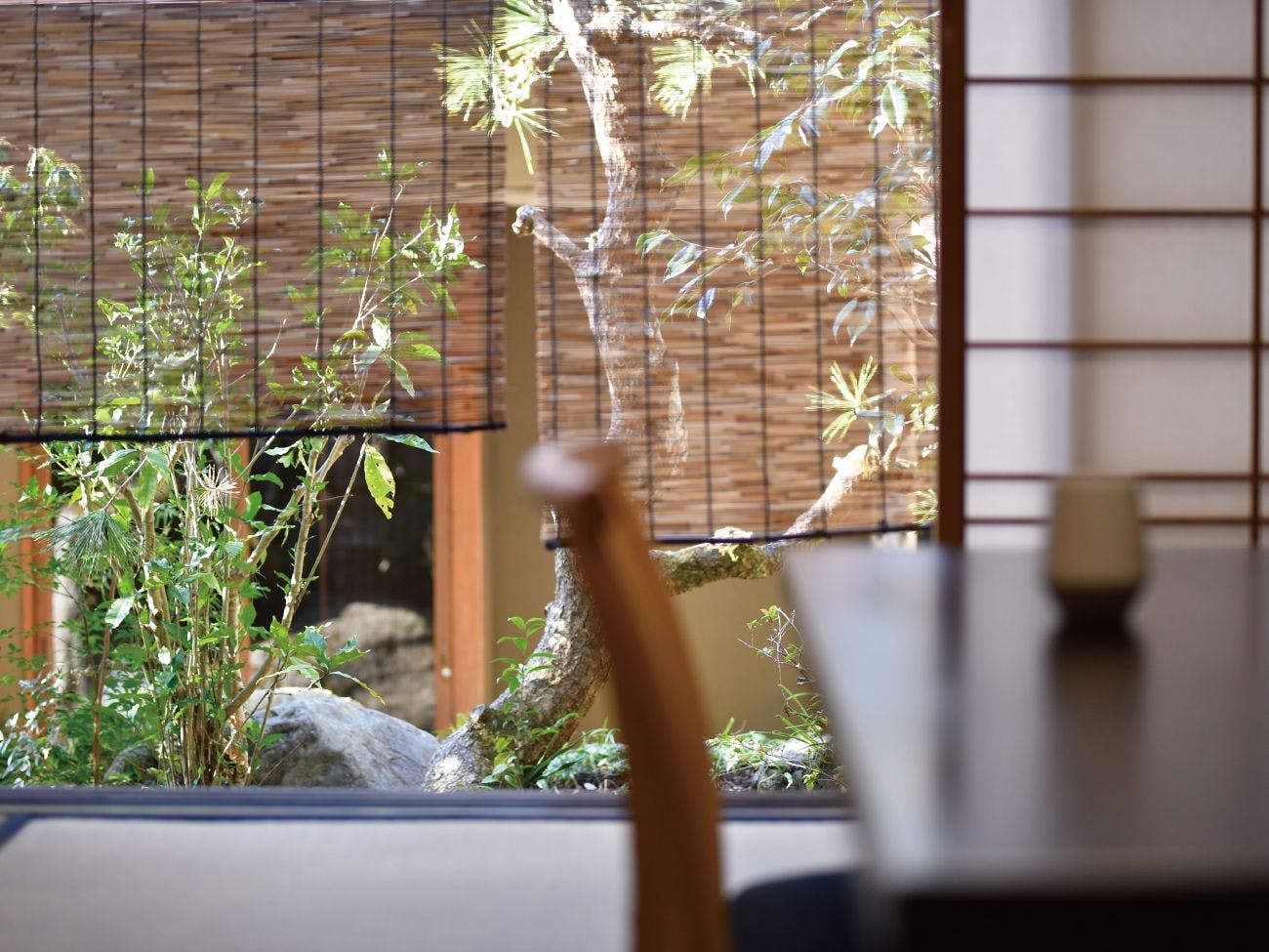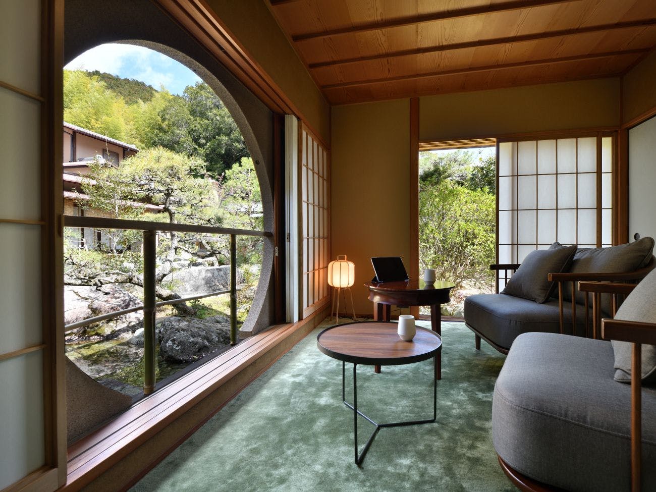 坪庭を眺める小上がりの8畳間と寝室風情漂う坪庭を心穏やかに眺めていただける、伝統的な畳の和室と畳の感触が素足に心地よい和のベッドルーム。和室と寝室は、特徴的な開口を持つ壁でもつながります。モダンな設えの露天風呂では、坪庭の木々を愛でながら名湯「修善寺温泉の湯」を心ゆくまでお楽しみください。※お部屋の中にテレビはございません。貸出用テレビがご必要な方は、フロントまでお申し付けください。※喫煙は所定の喫煙所にてお願いいたします。