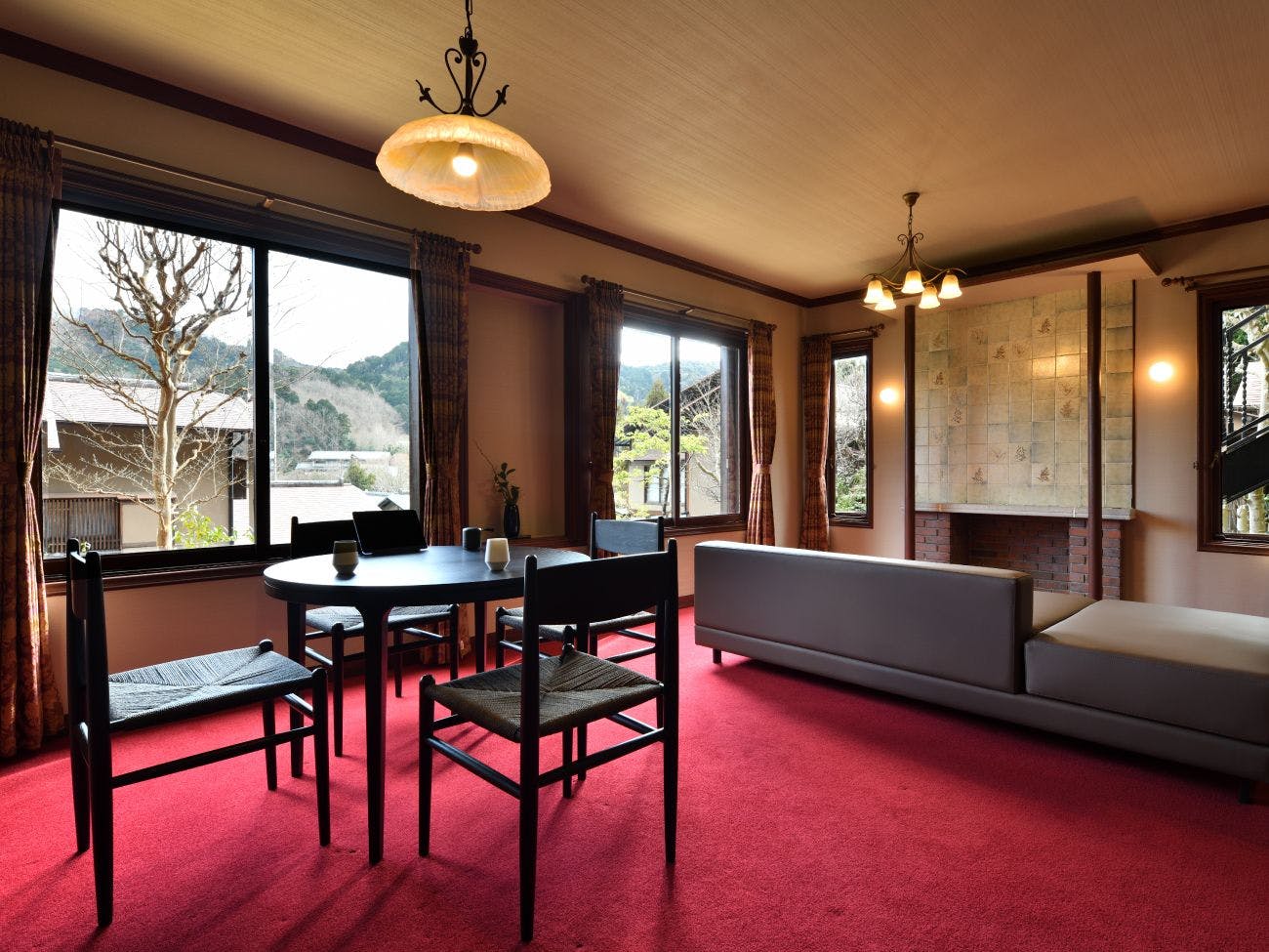中伊豆の山並を眺める広々としたリビング古き佳き時代の洋館の趣を伝えるリビングでは、大きな窓の向こうに浮かぶ中伊豆の山並を眺めてお過ごしください。モダンな設えの内風呂では、名湯「修善寺温泉の湯」を心ゆくまでお楽しみいただけます。畳の感触が素足に心地よいベッドルームでは、深い眠りで体を休めてください。※お部屋の中にテレビはございません。 貸出用テレビがご必要な方は、フロントまでお申し付けください。※喫煙は所定の喫煙所にてお願いいたします。